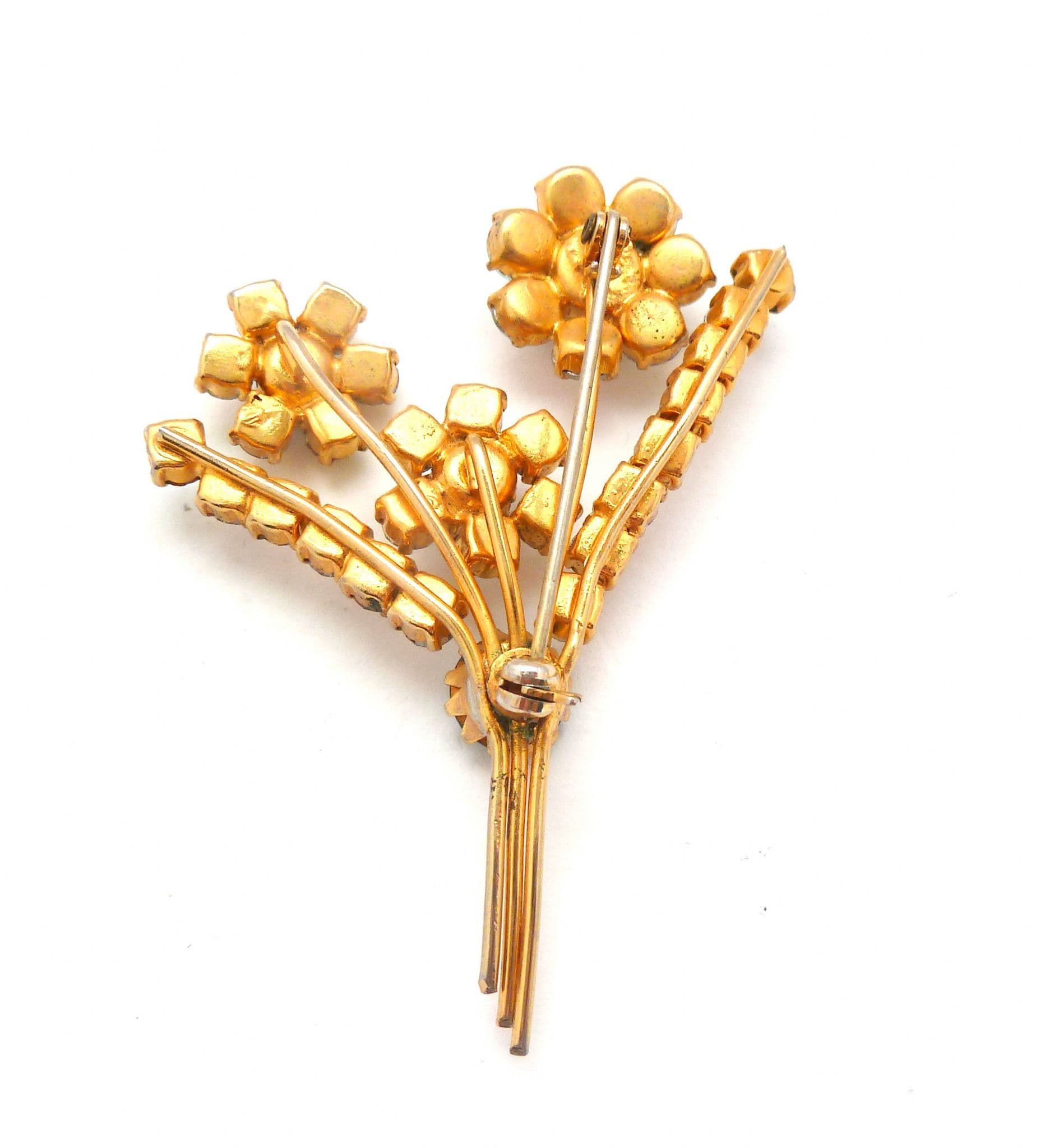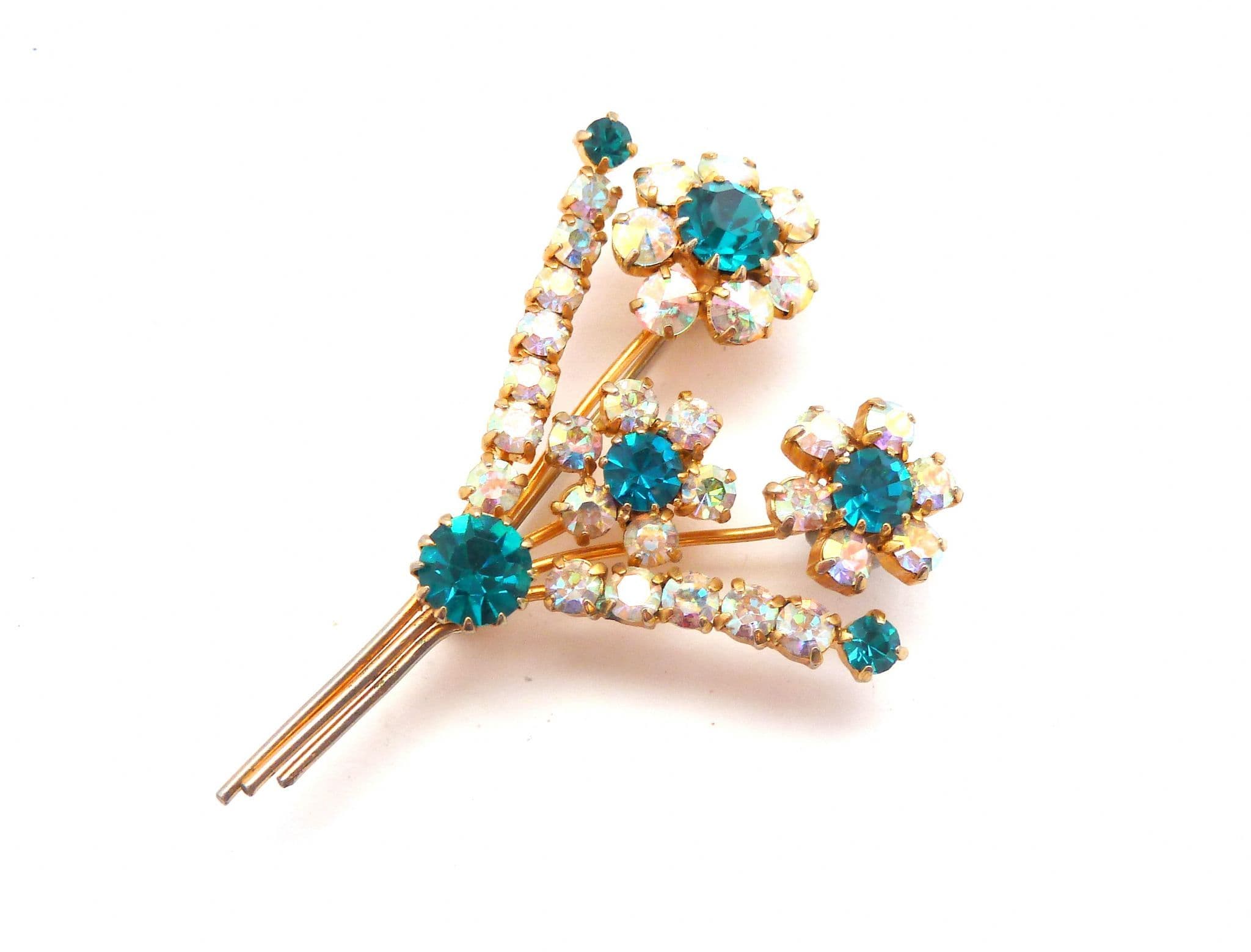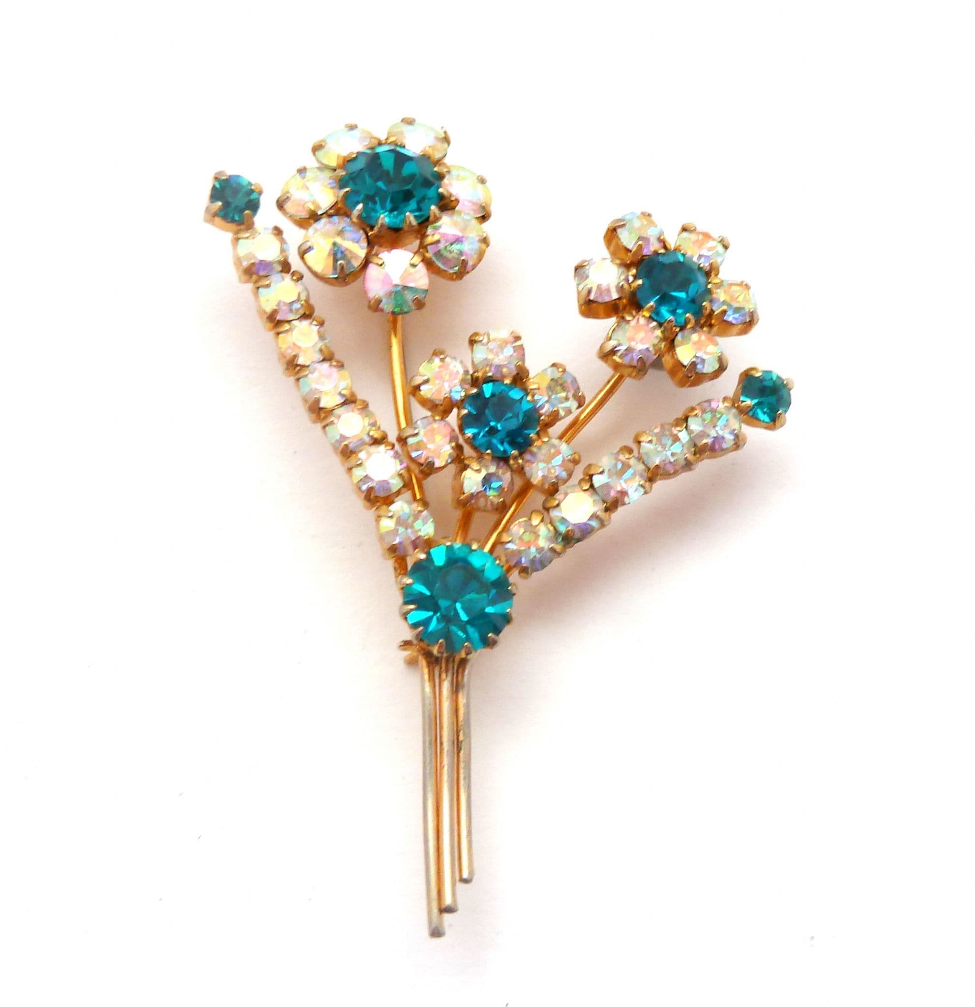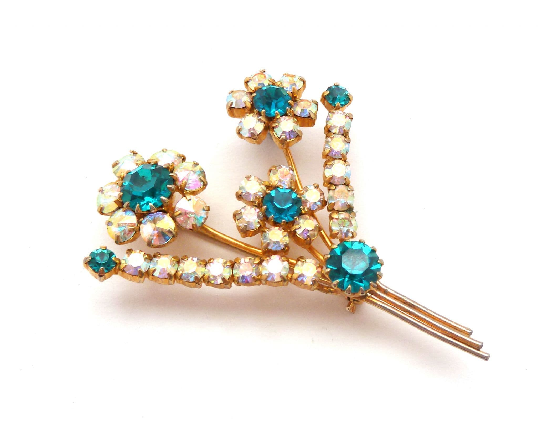 This is a lovely large vintage aurora borealis and turquoise blue rhinestone set floral design brooch. Studded with aurora borealis and turquoise blue rhinestones set in abstract floral design. The rhinestones are set against a gold tone metal. Secure roll over safety clasp, circa 1950's.