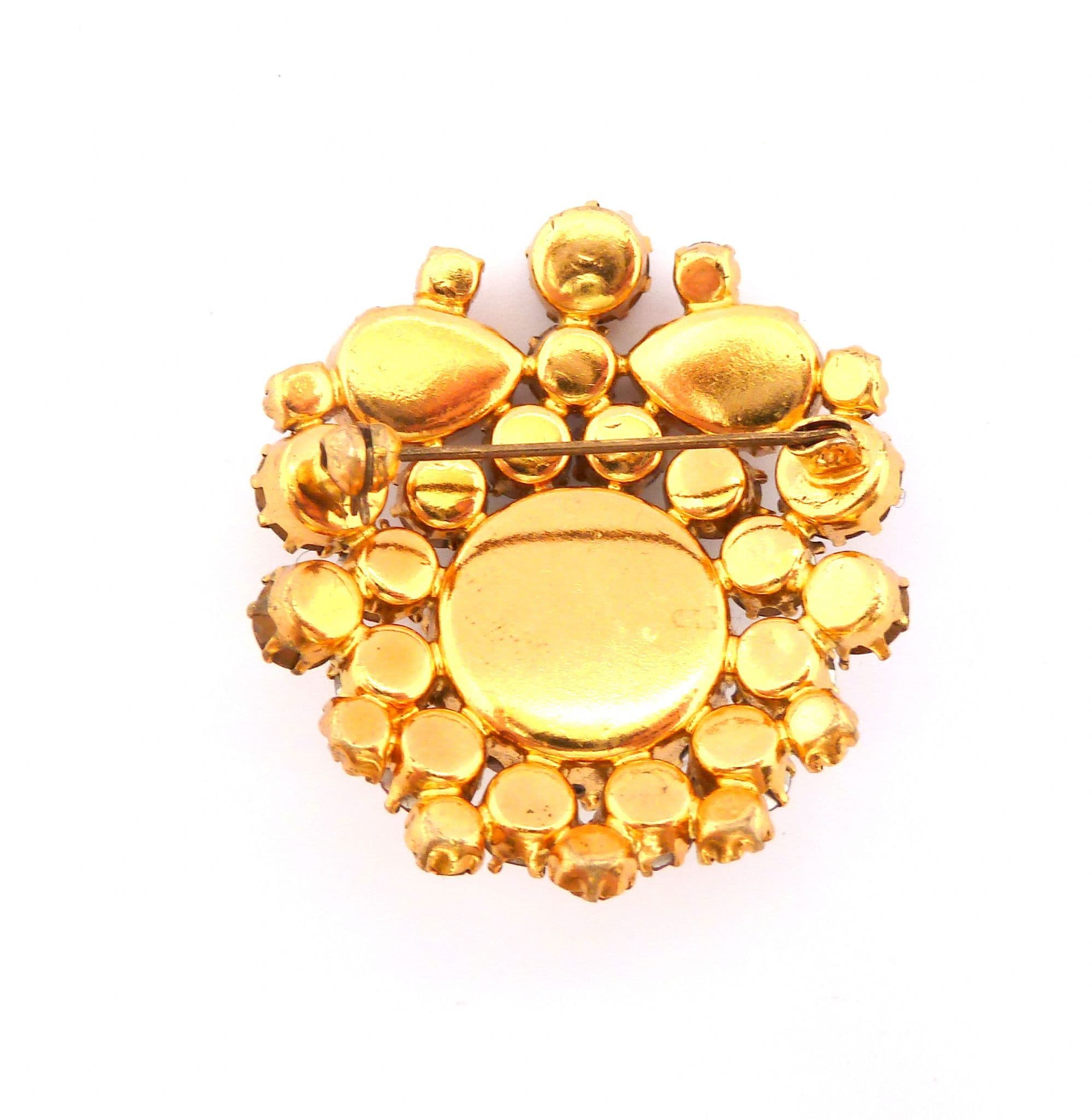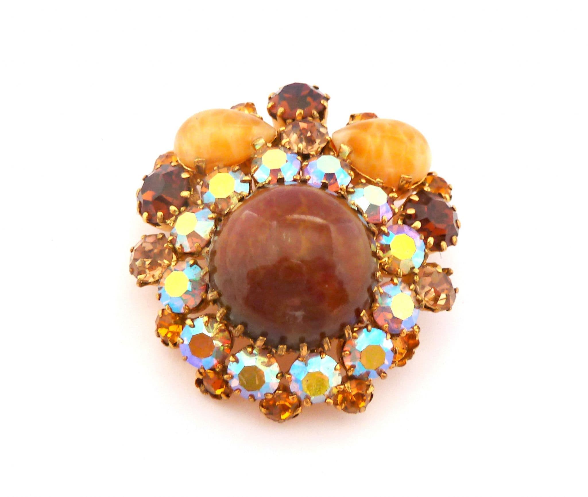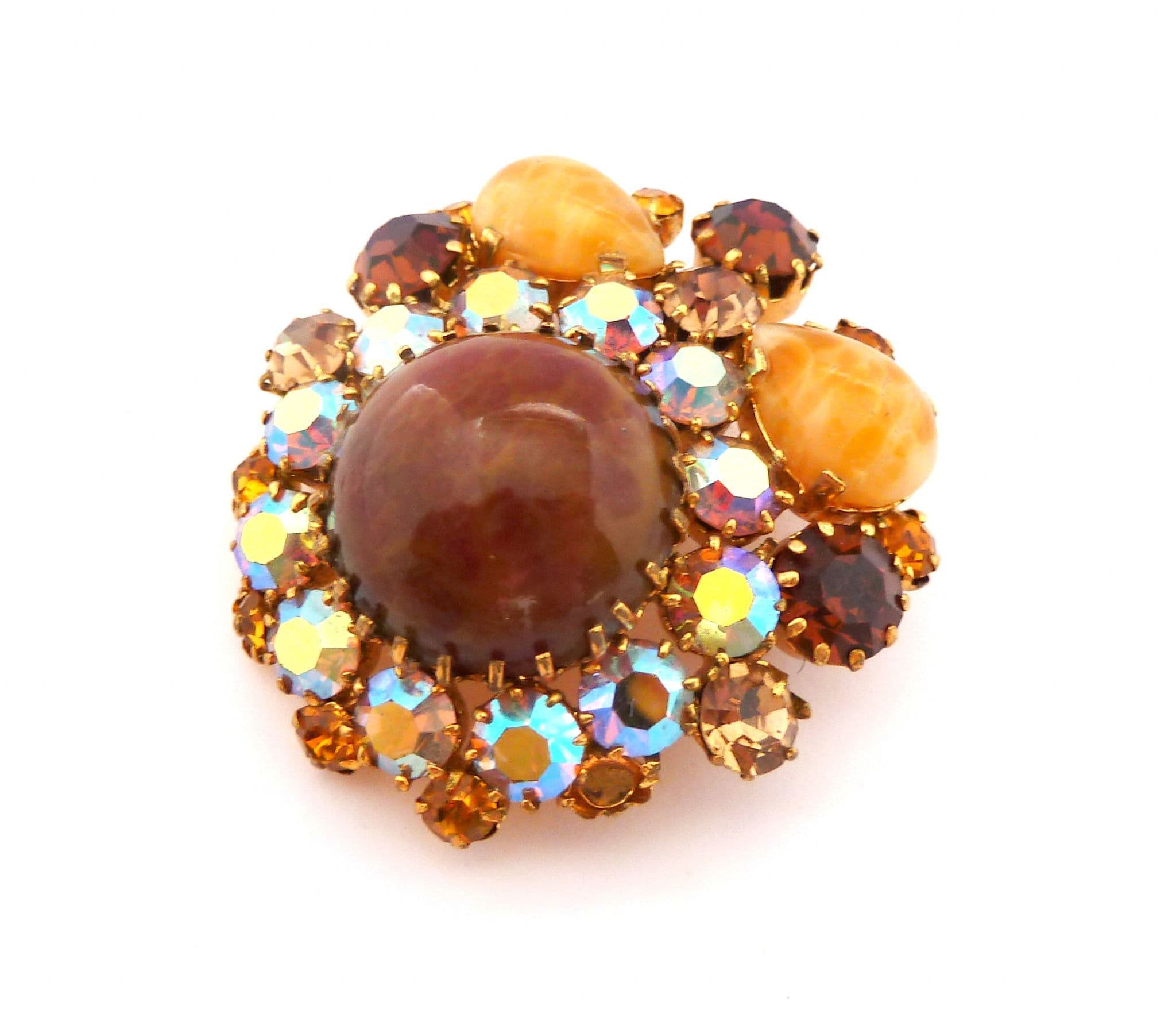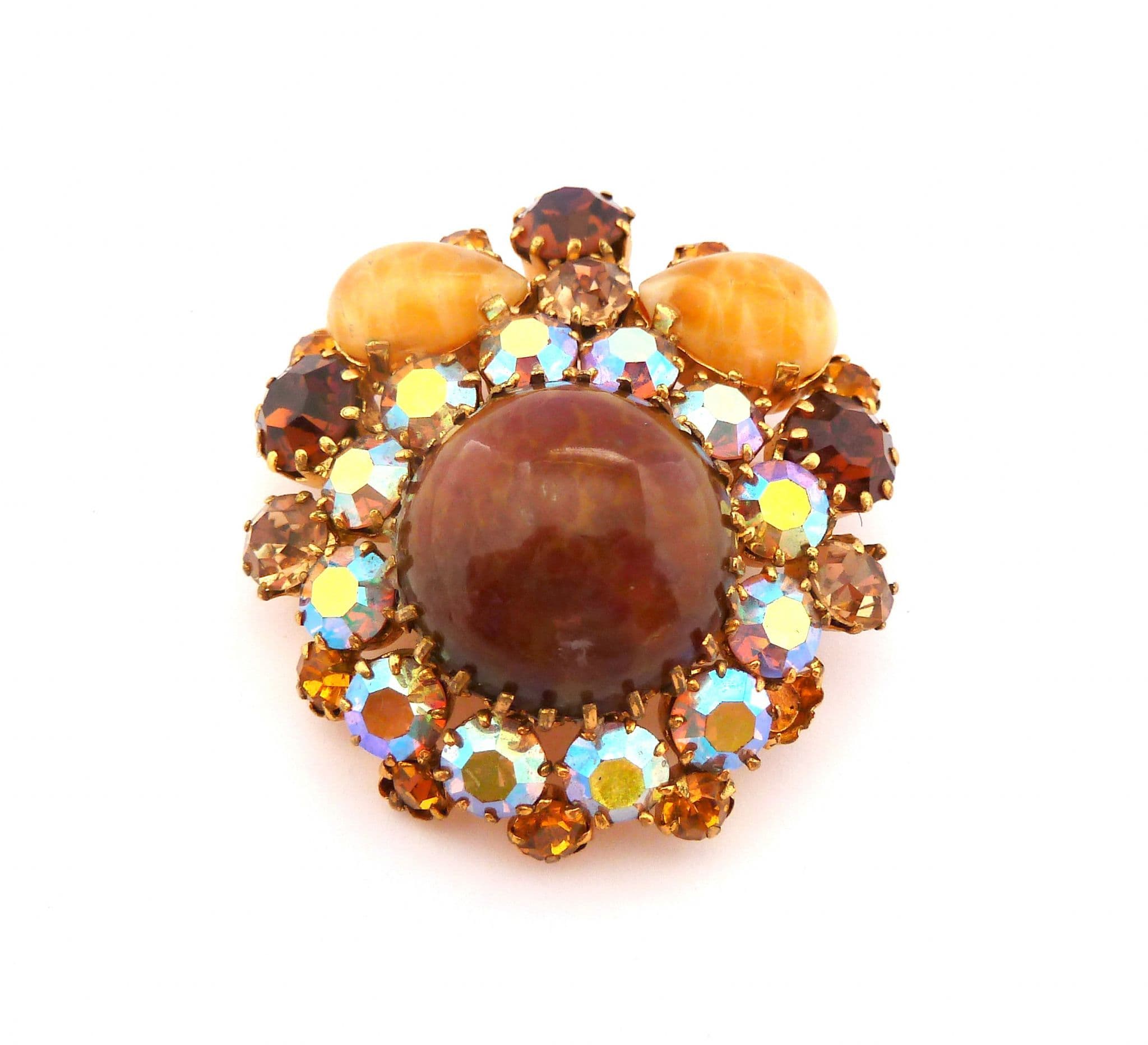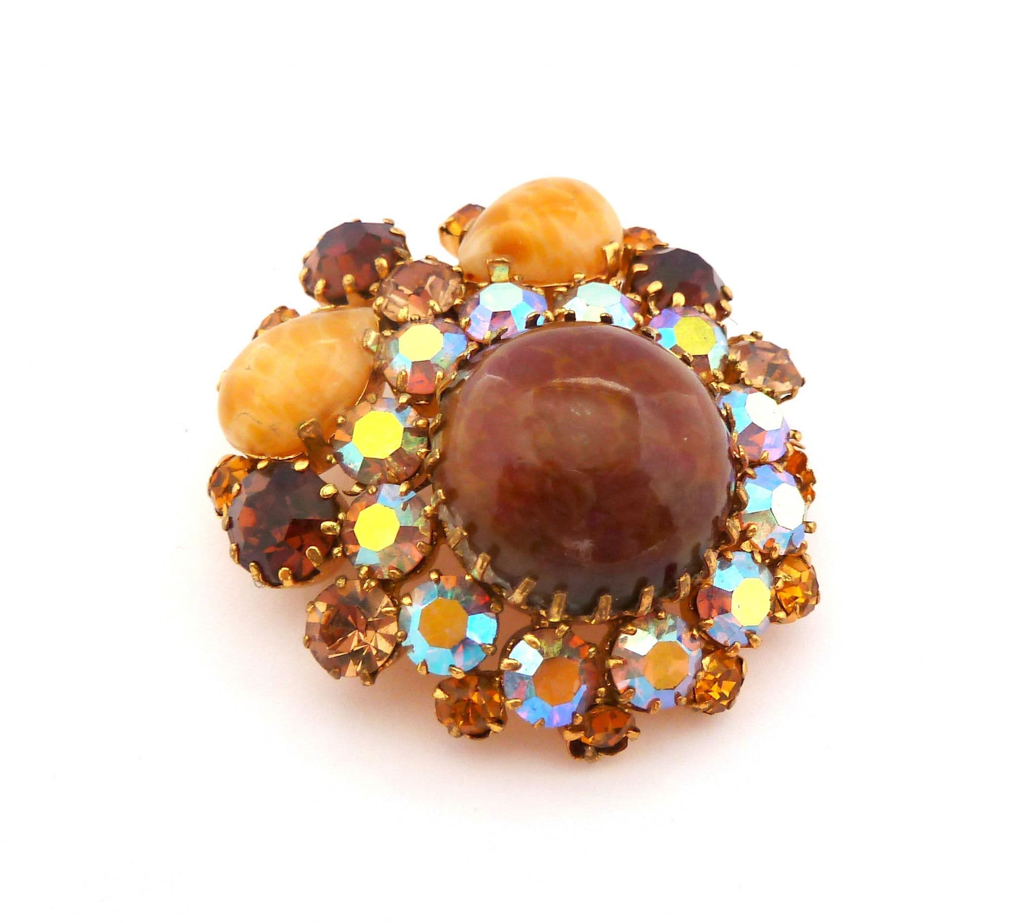 A vintage large aurora borealis rhinestone and marbled glass cabochon set geometric design statement brooch. The brooch is formed from gold tone metal in a geometric design set with aurora borealis rhinestones and marbled glass cabochons The brooch has a roll over safety clasp fastening. Circa 1950's - 60's.
