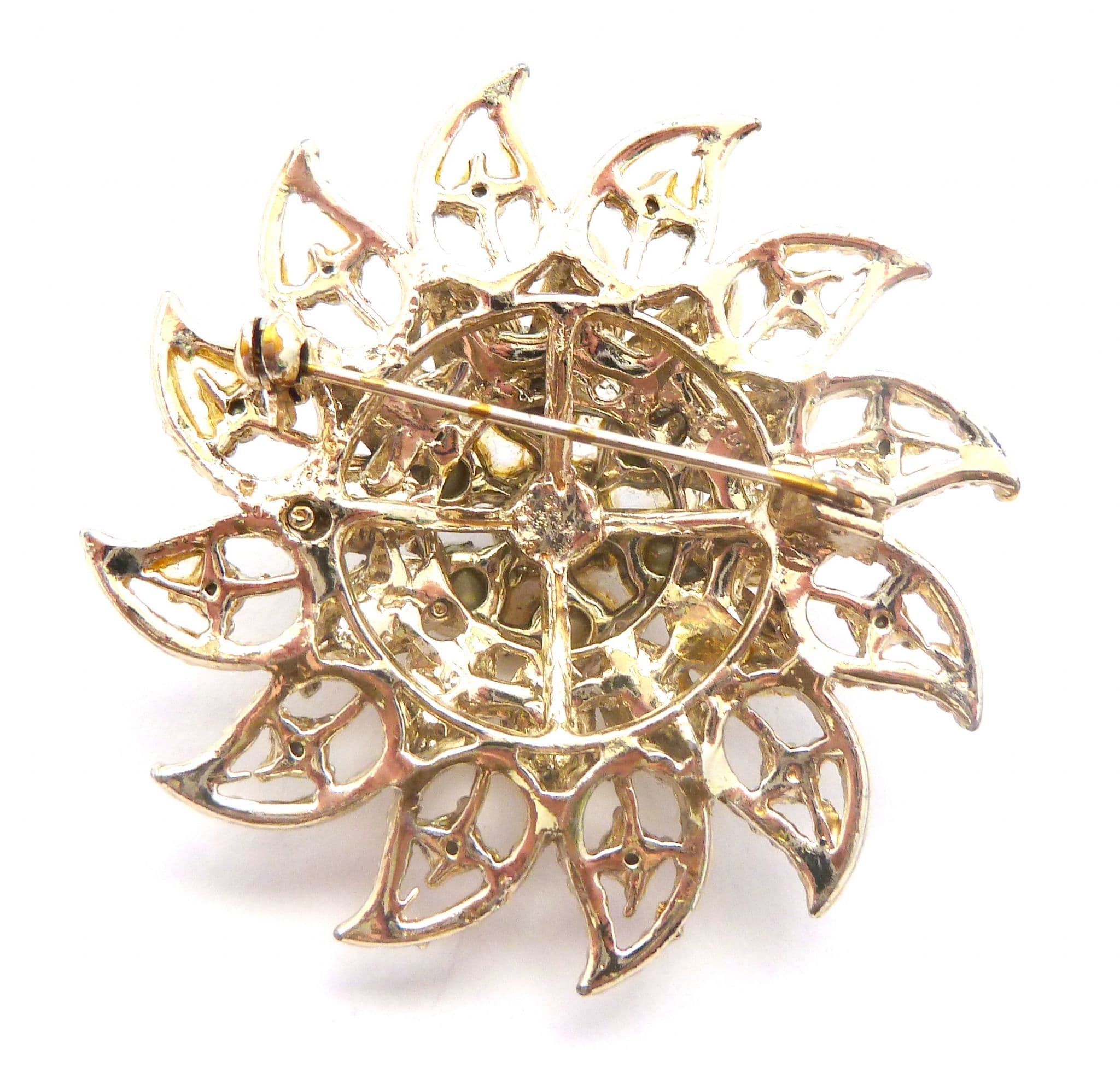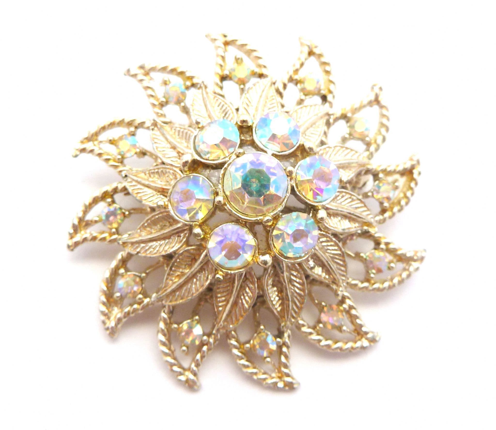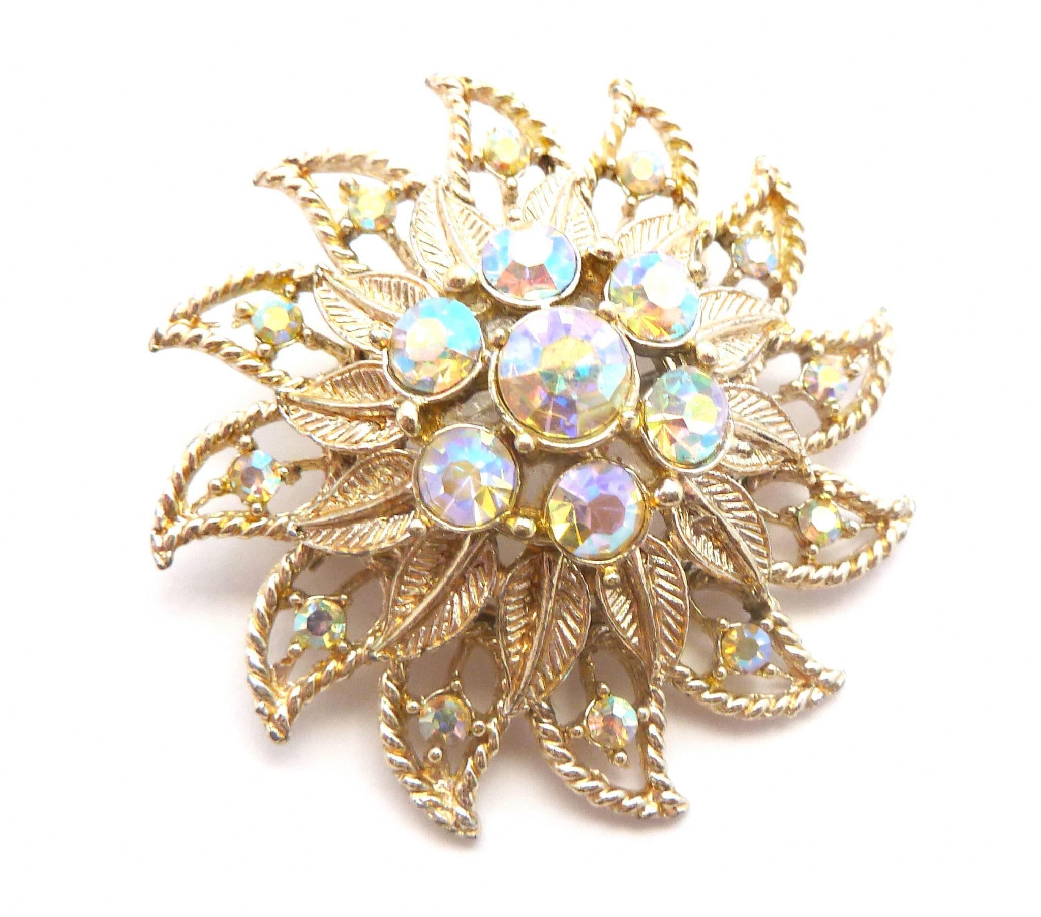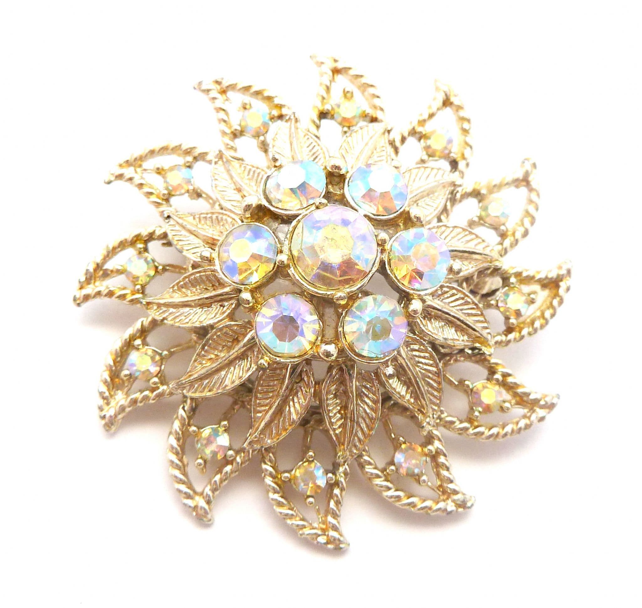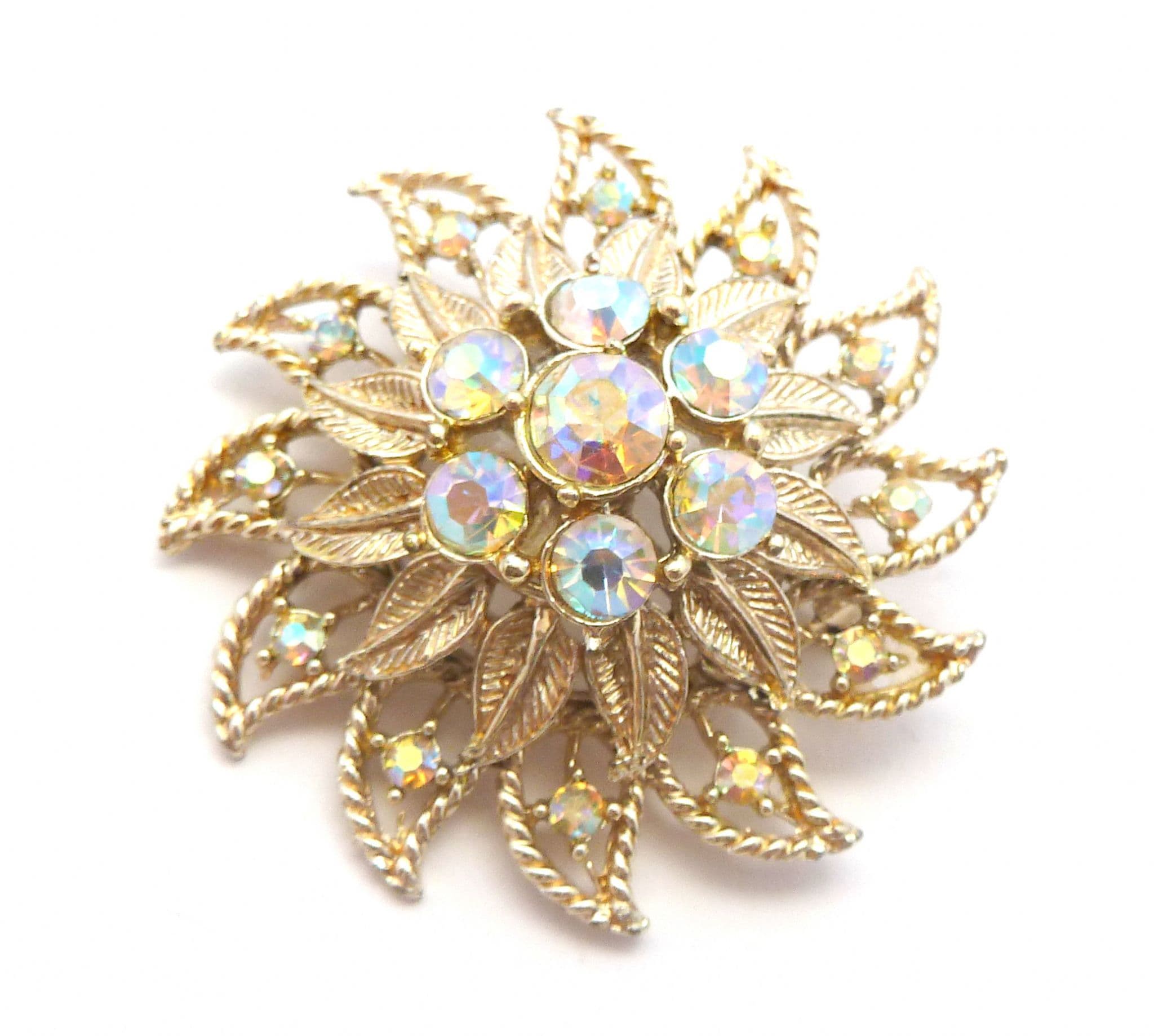 A vintage large rhinestone detailed layered floral design brooch. Formed from gold tone metal in a large layered raised floral design set with aurora borealis rhinestones Circa 1960's - 70's.