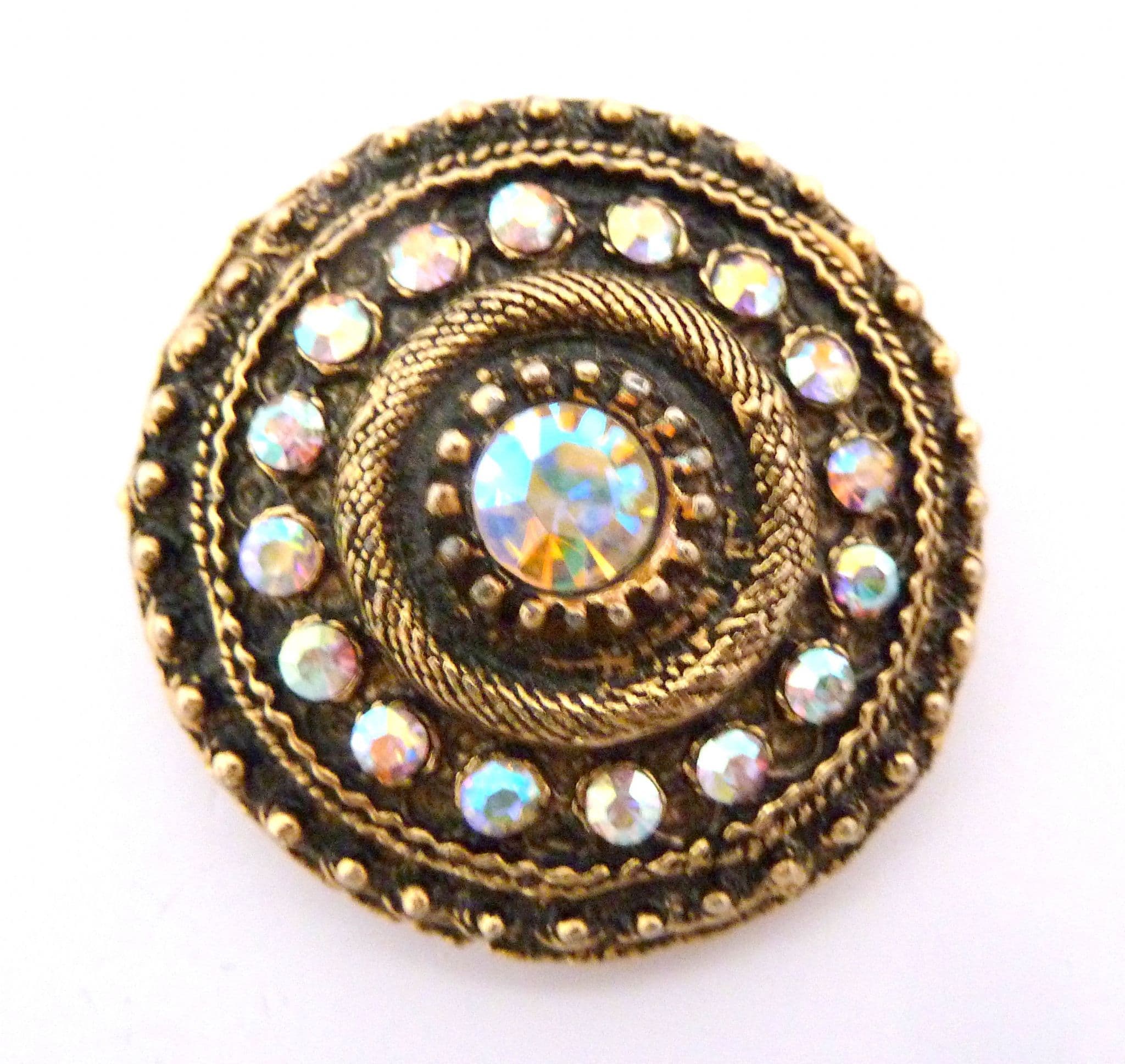 Vintage large heavy aurora borealis rhinestone set brooch. The brooch is formed from antiqued gold tone metal, in a circular shape with a raised tiered deisgn set with aurora borealis rhinestones. Circa 1970's - 80's.