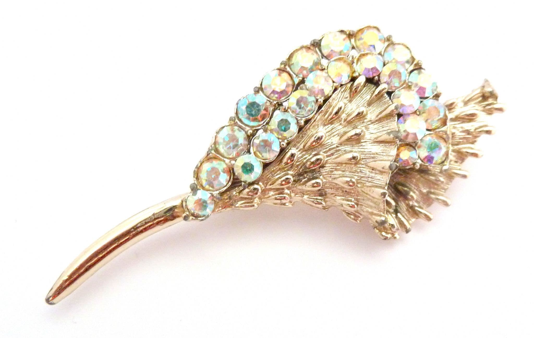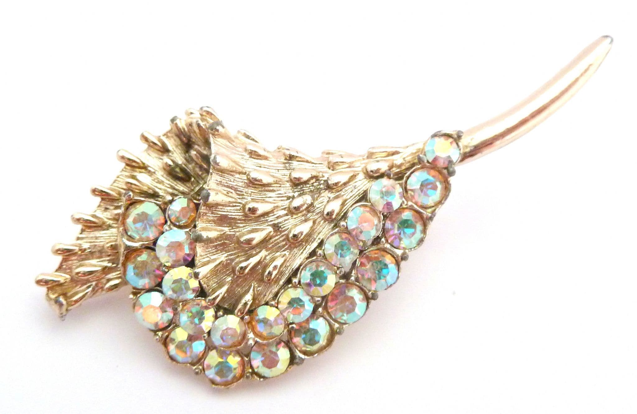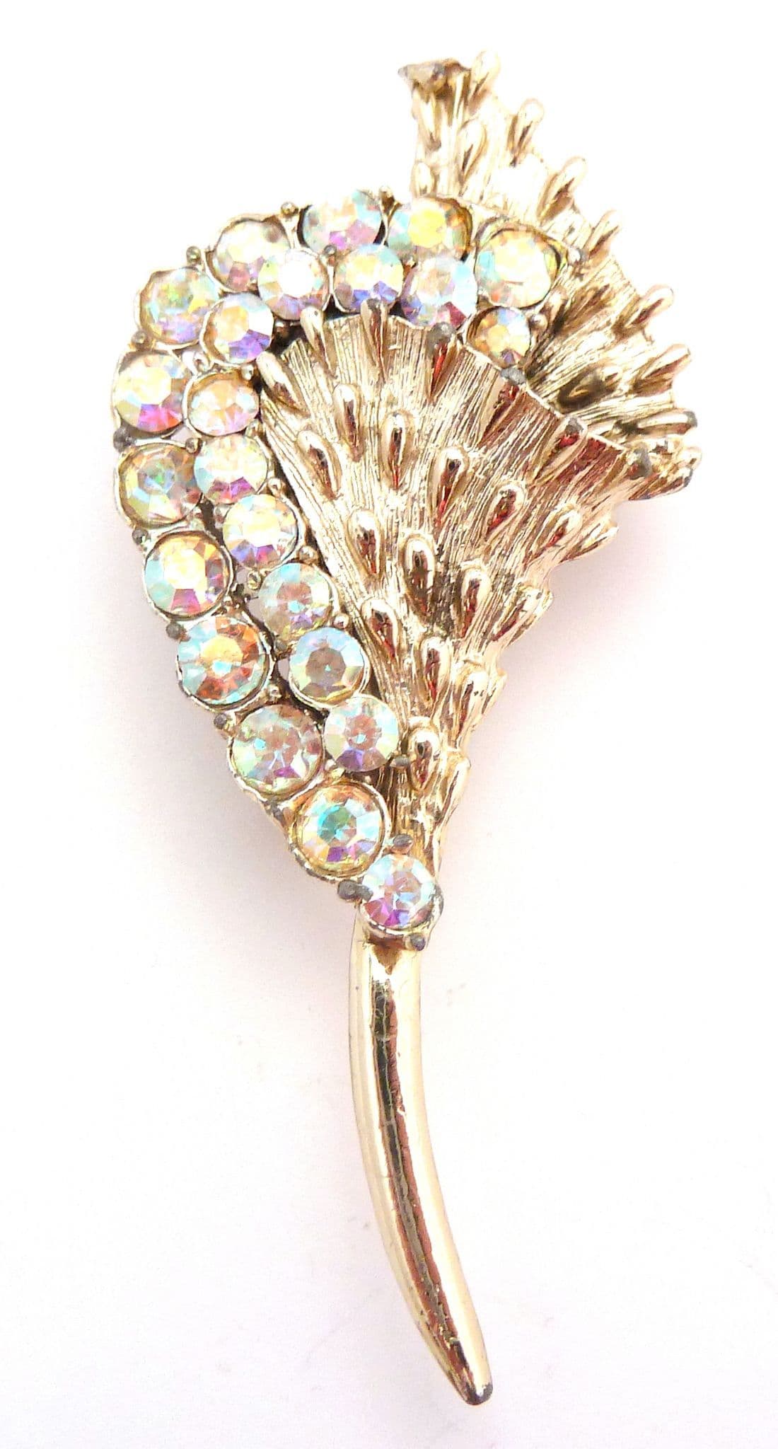 Vintage large aurora borealis rhinestone set spiked flower design brooch. This unusual brooch is formed from textured and polished silver tone metal in a spiked flower design set with a double line of aurora borealis crystal rhinestones. Vintage circa 1950's - 60's.
