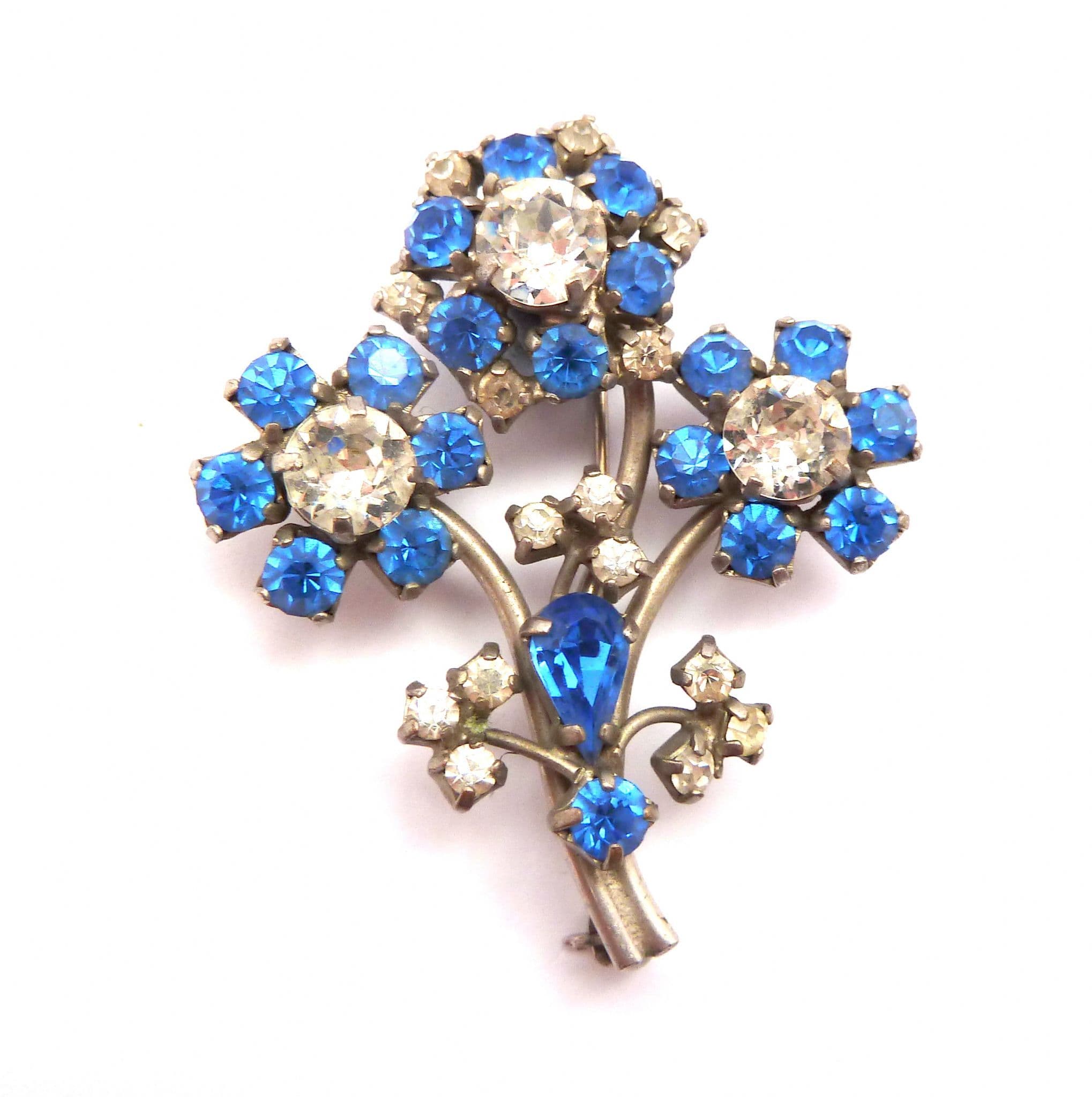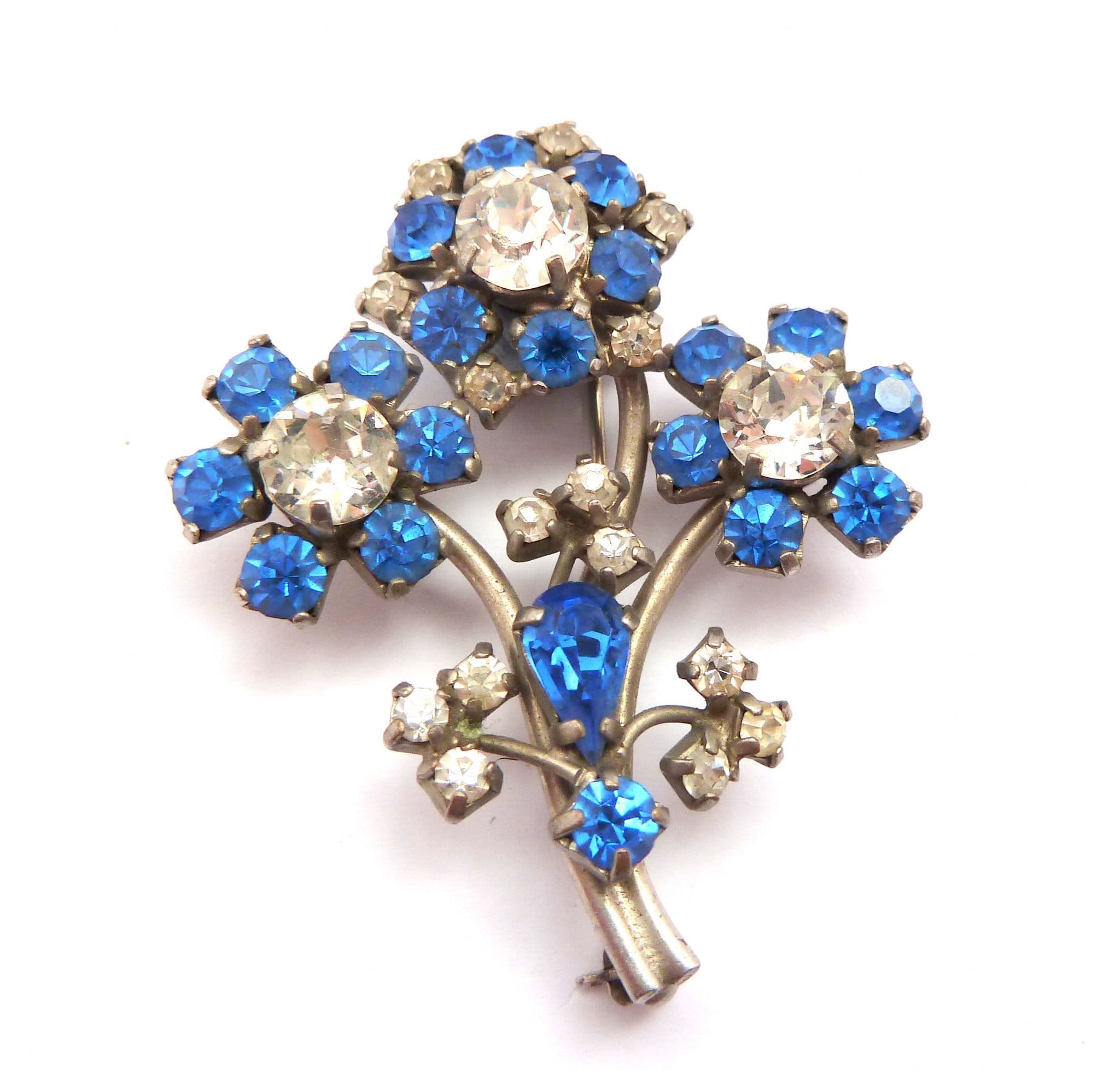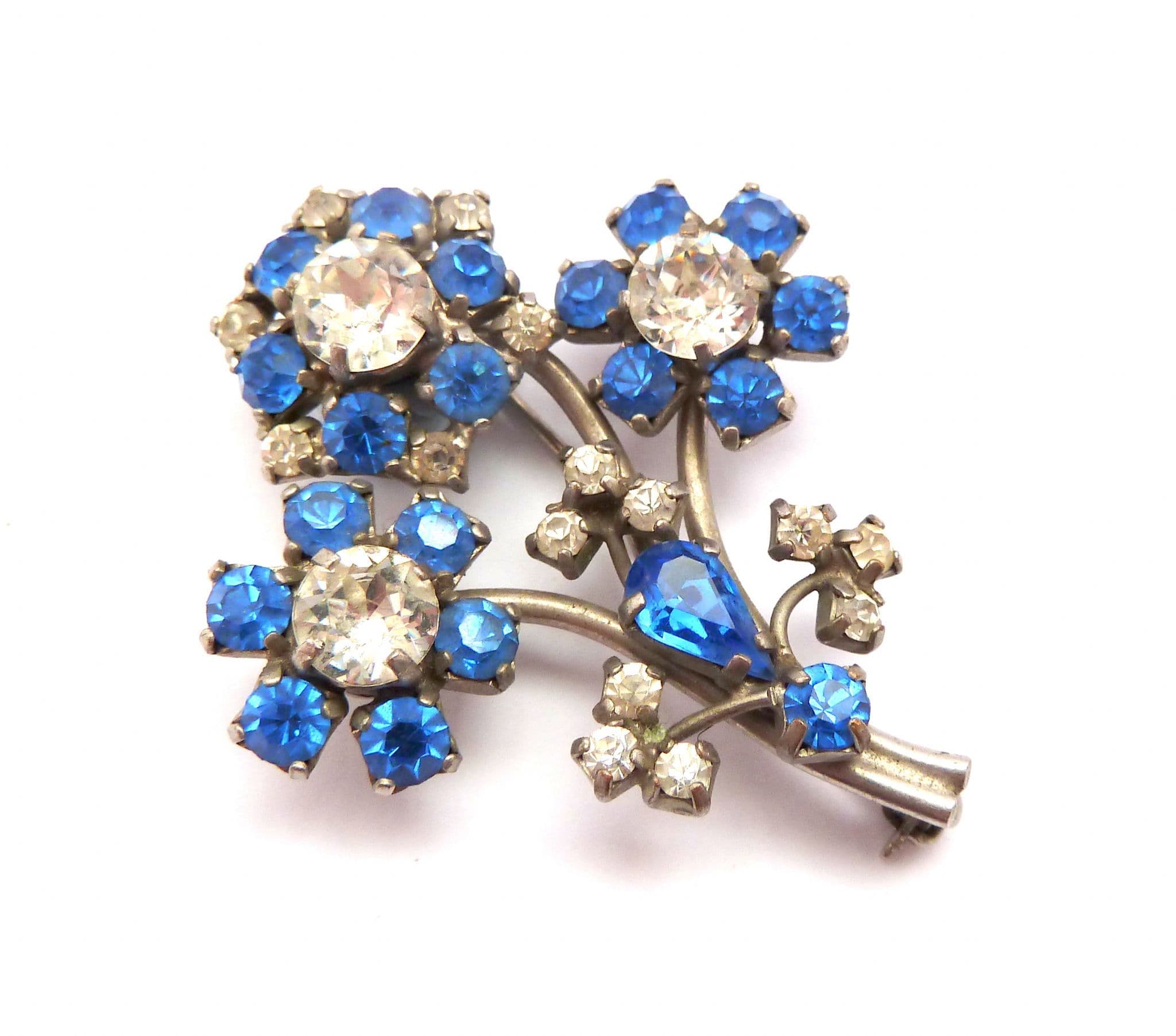 Vintage large clear and blue rhinestone set floral posy design mid century brooch. Formed from silver tone metal, in a floral design the petals of which are set with clear and bluer rhinestones, Fastens with a roll over safety clasp. Circa 1950's.