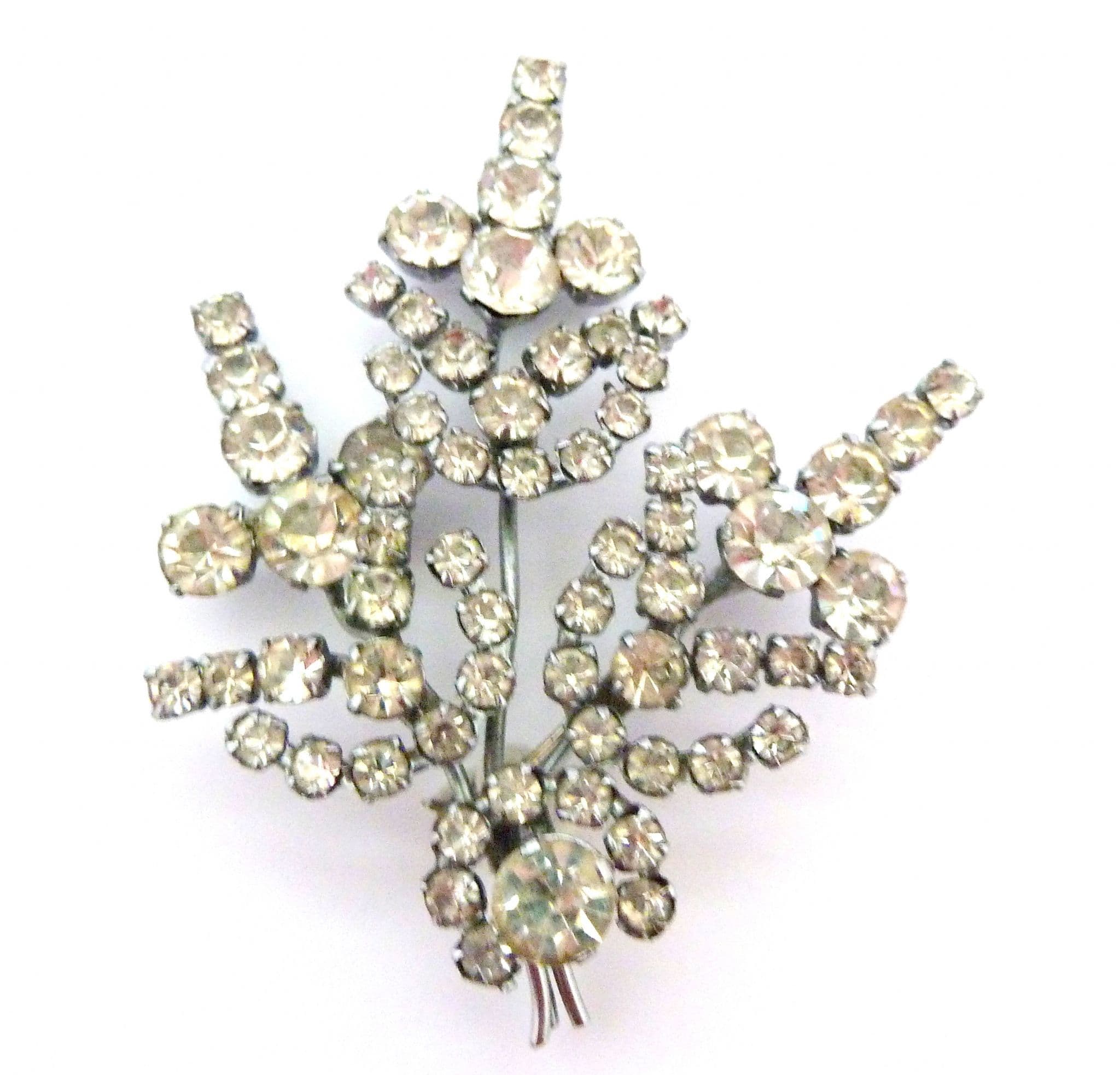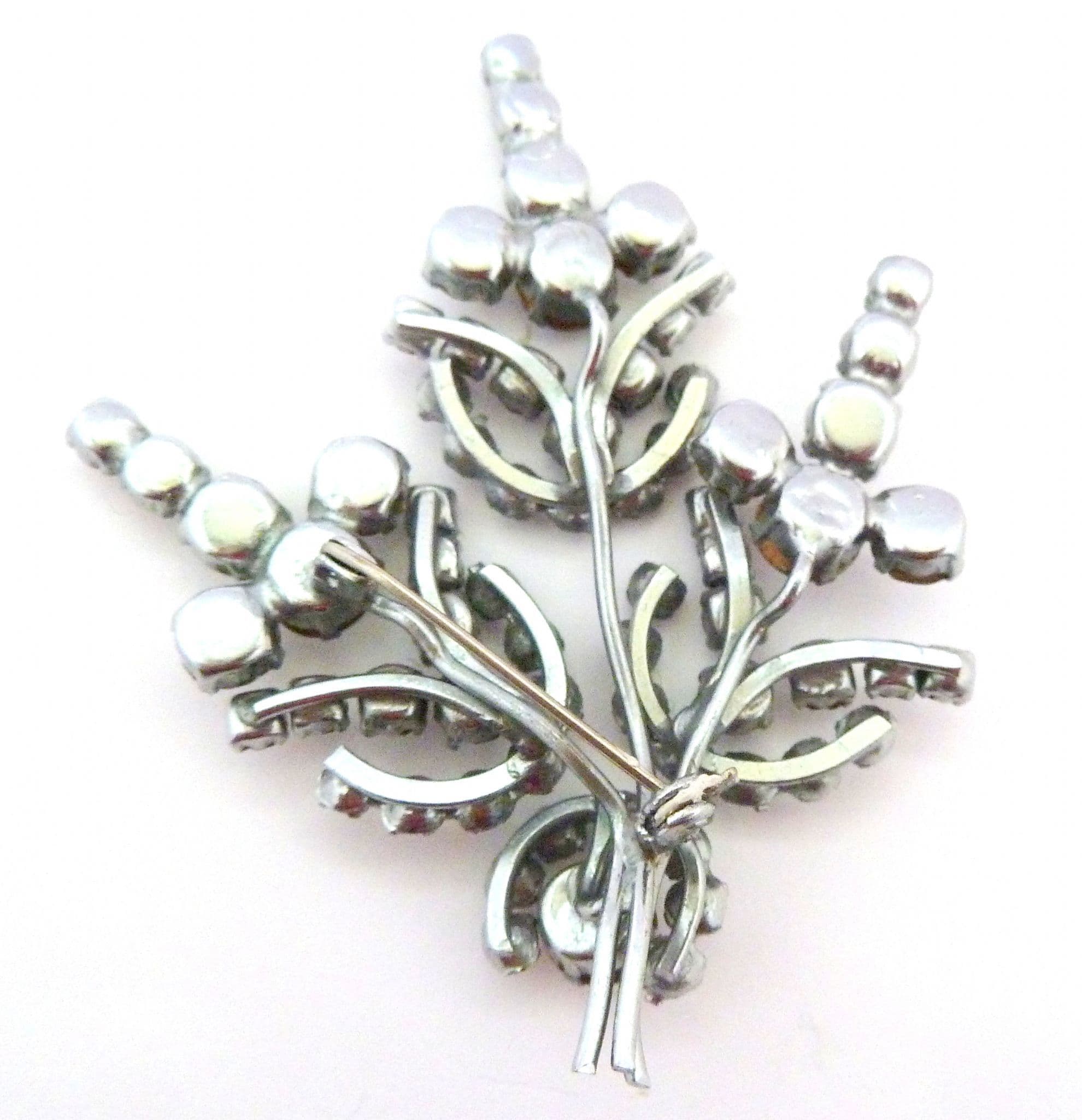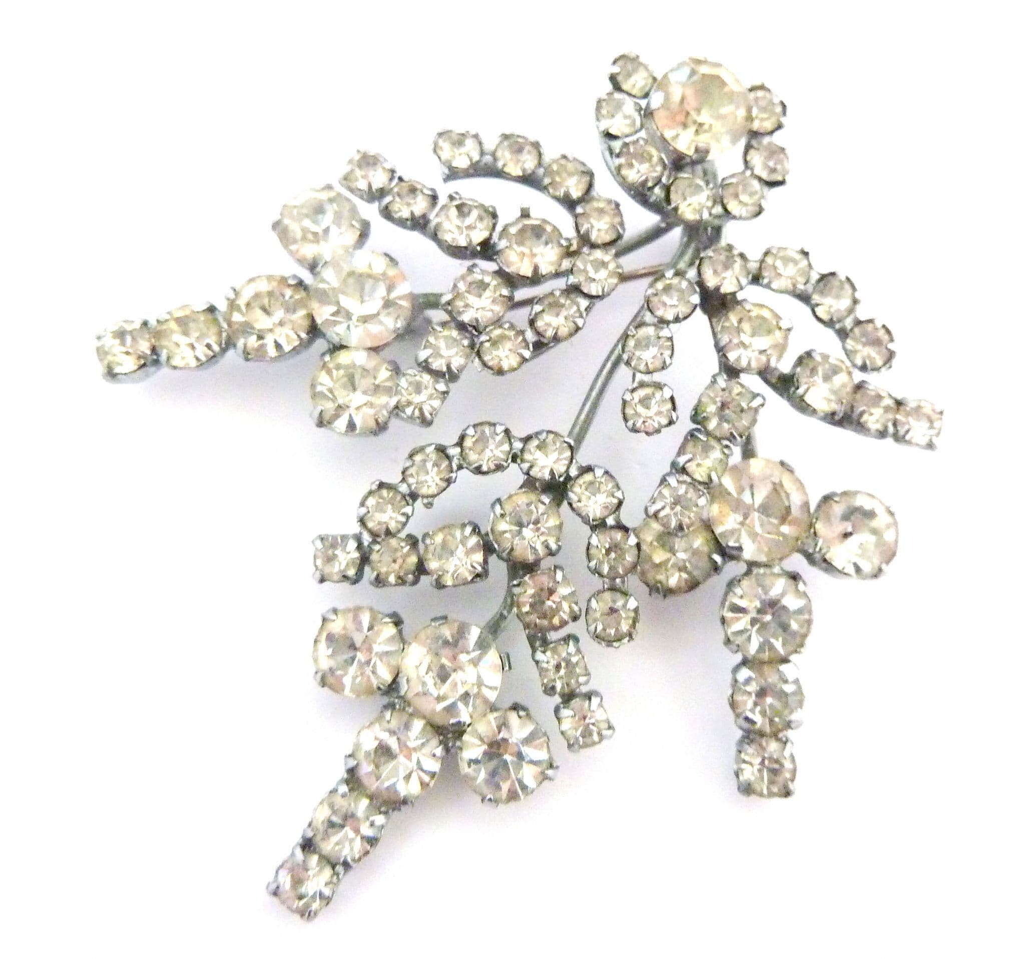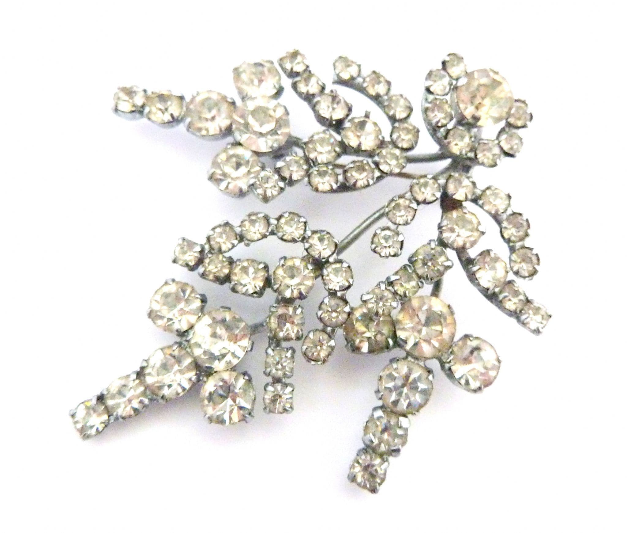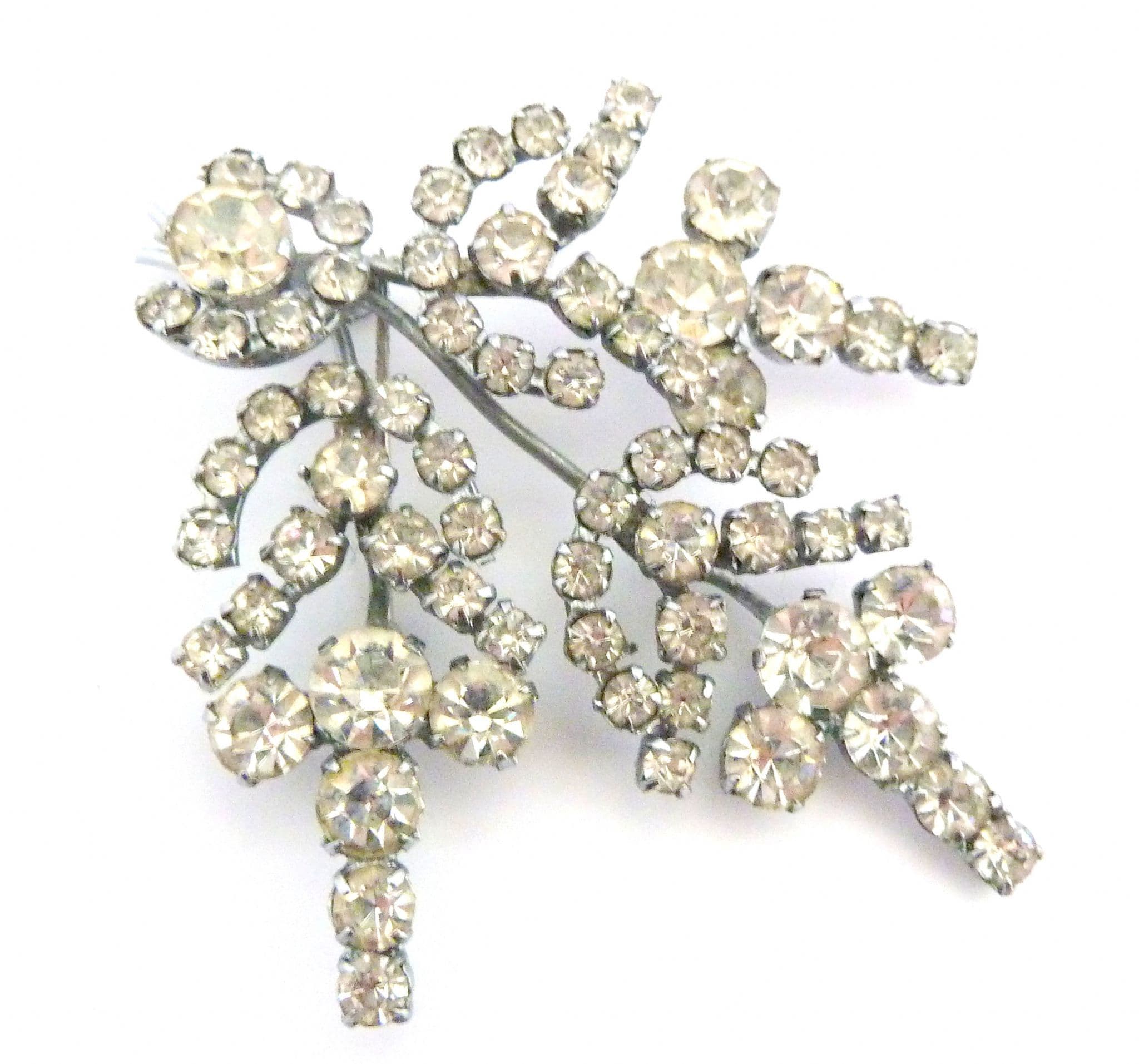 A vintage very large clear rhinestone set abstract floral design brooch. Formed from silver tone metal in a layered design set with large clear rhinestones in an abstract floral design, small pin, so is designed to be worn to the side rather than straight up. Circa 1950's.