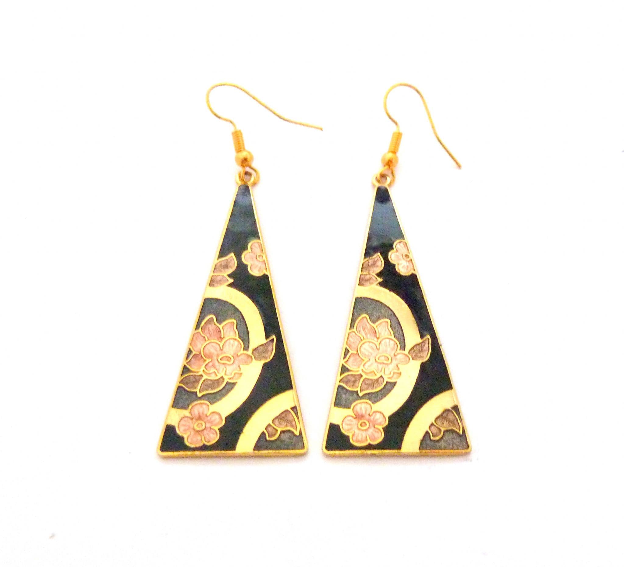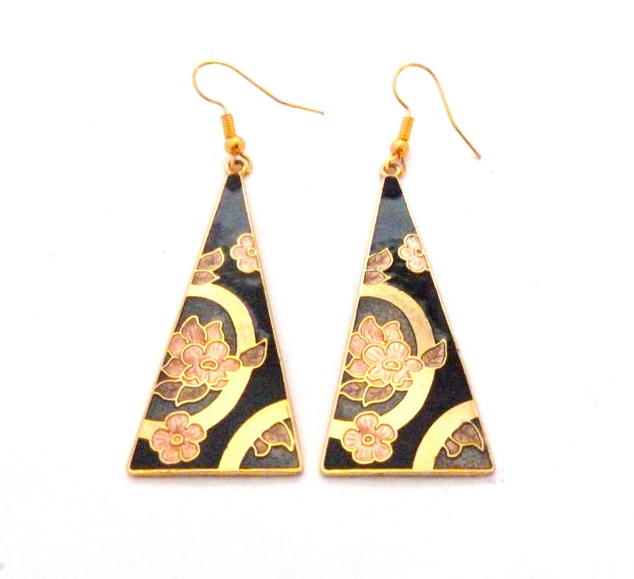 Vintage cloisonne enamel large retro floral design triangular shaped drop earrings. Each earring is formed from cloisonne enamel in a triangular shaped design with a retro abstract floral design. Suitable for pierced ears with fish hook backs. Circa 1980's - 90's.