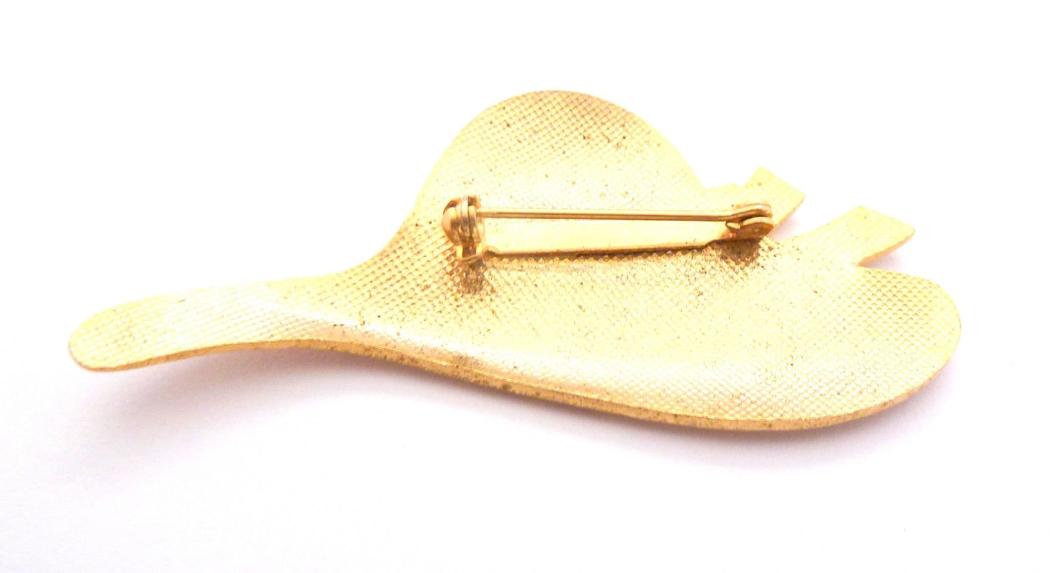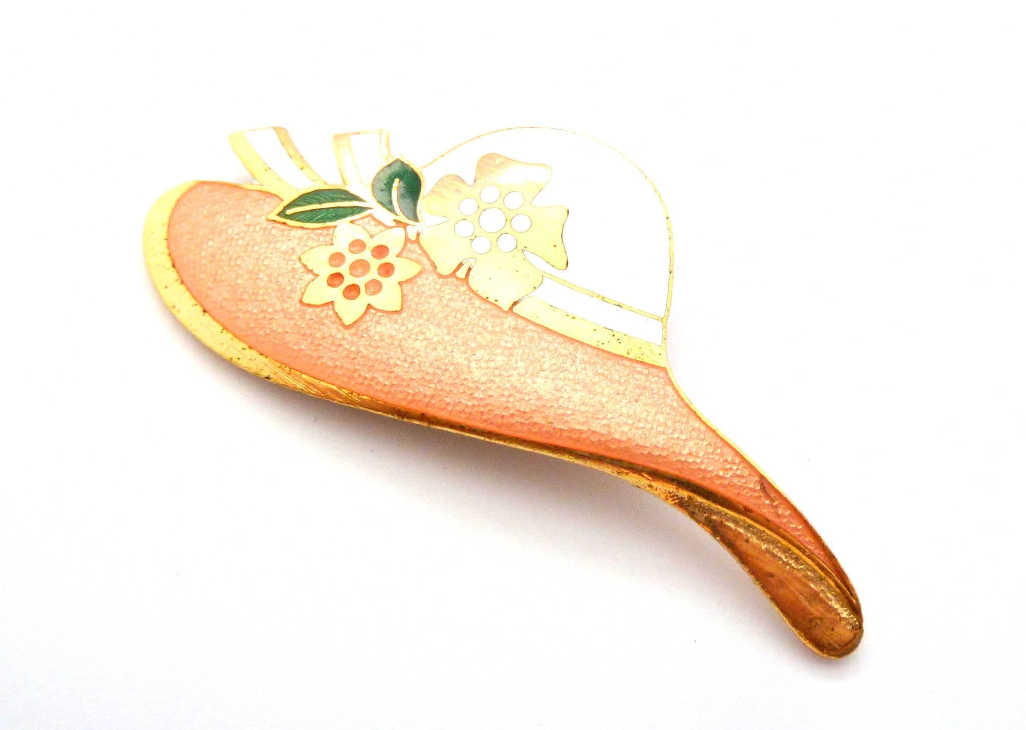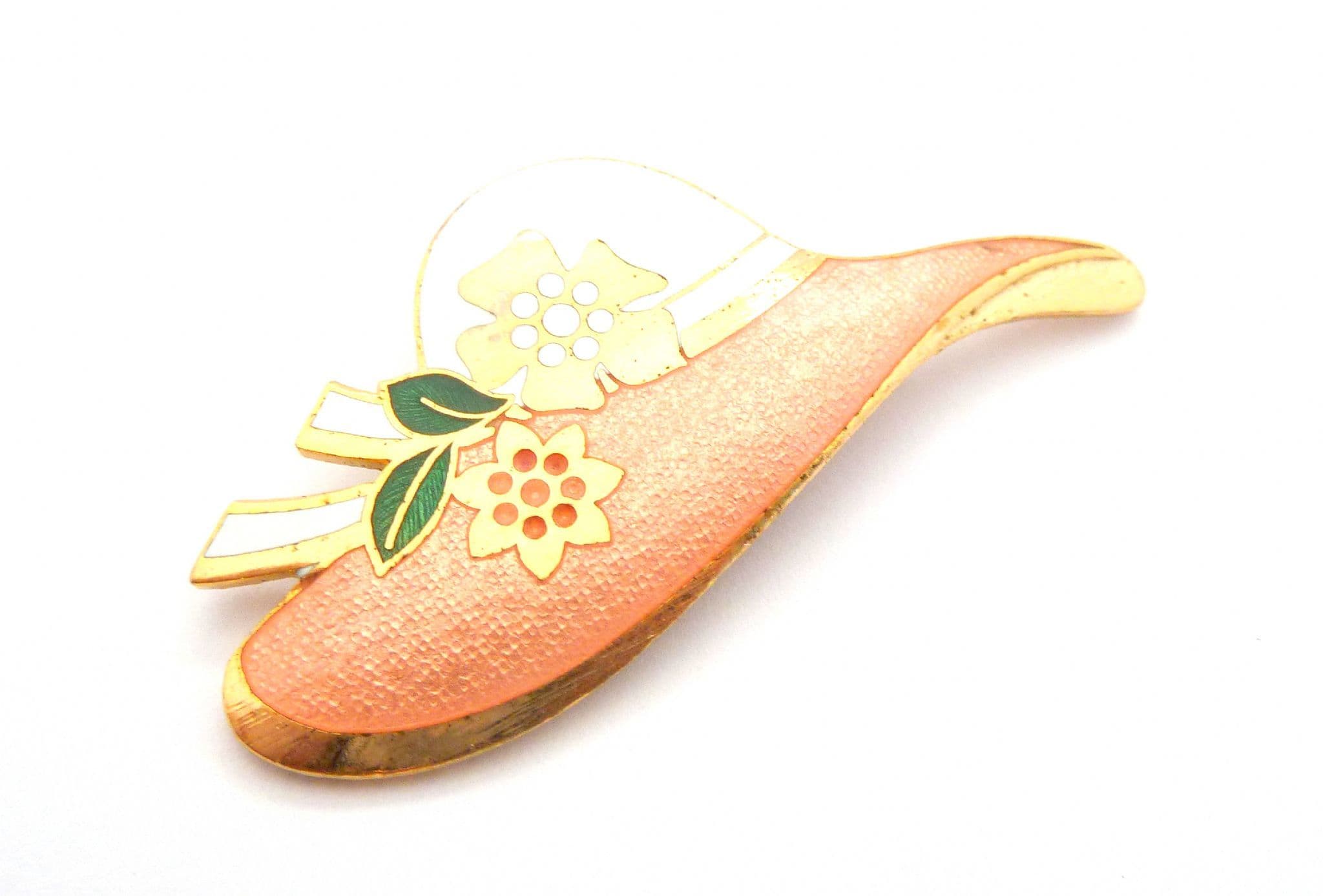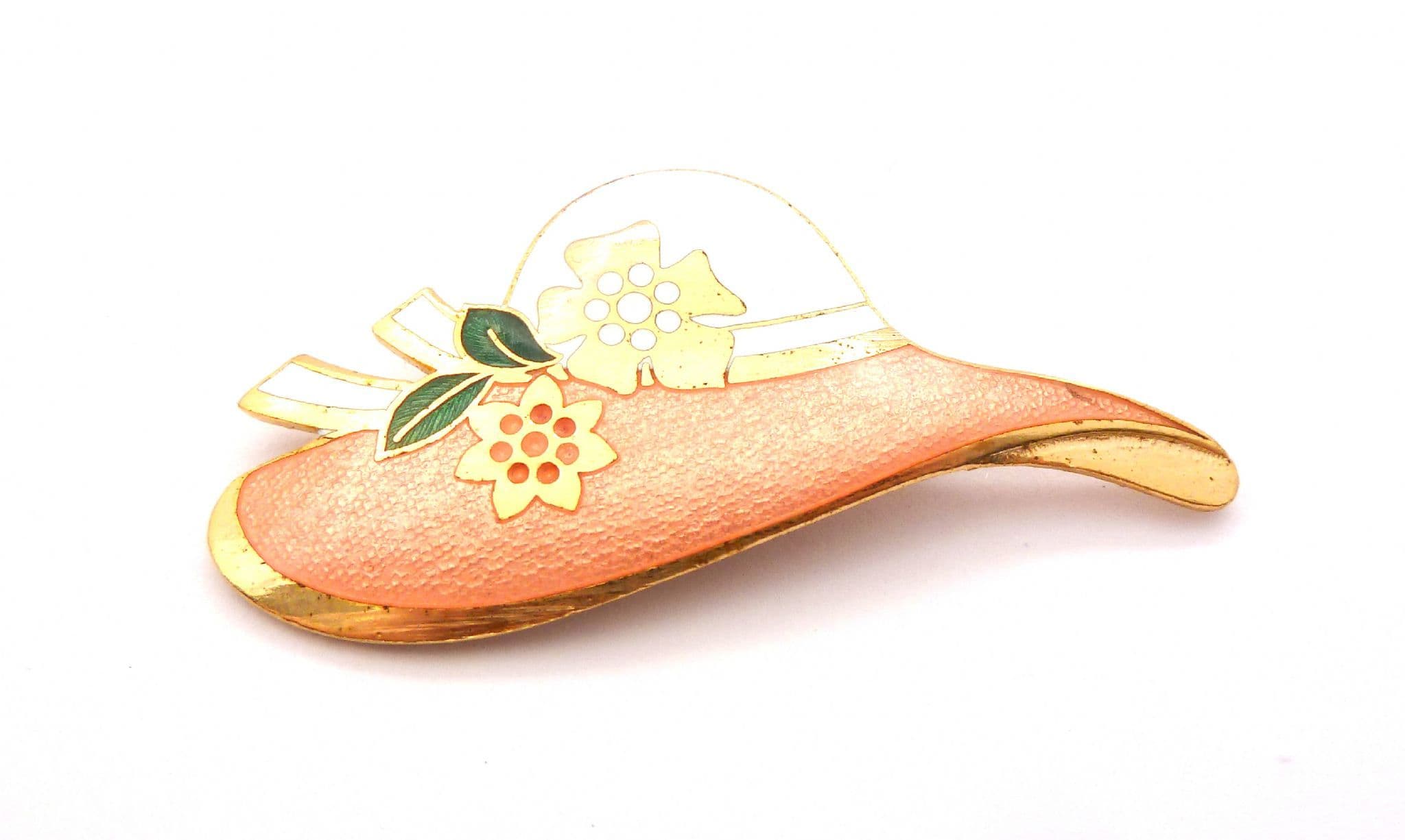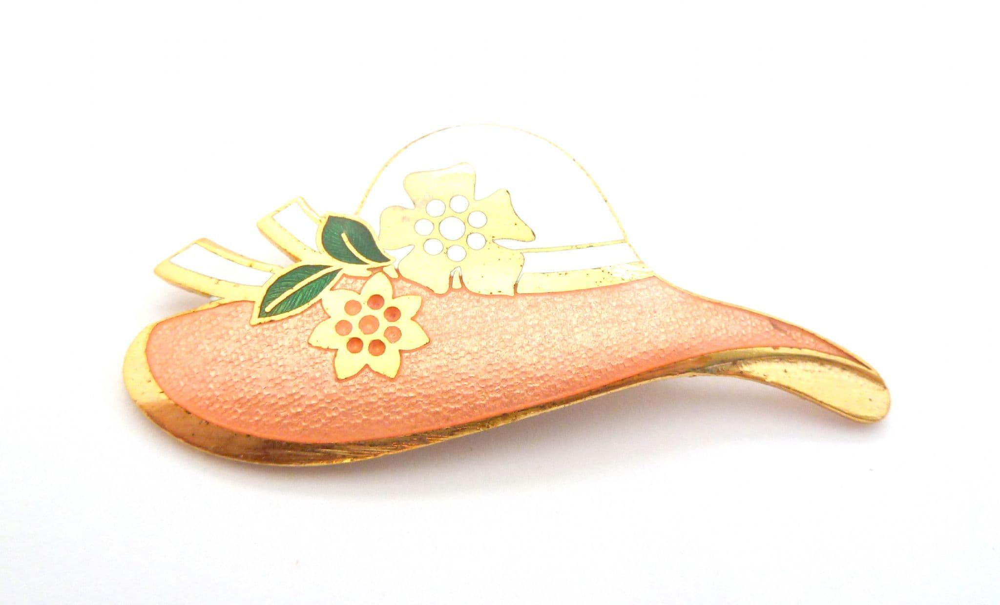Vintage large cloisonne enamel hat design brooch. Formed from gold tone metal in a the shape of a hat with a cloisonne enamel finish and gold tone flowers. Circa 1980's - 90's.