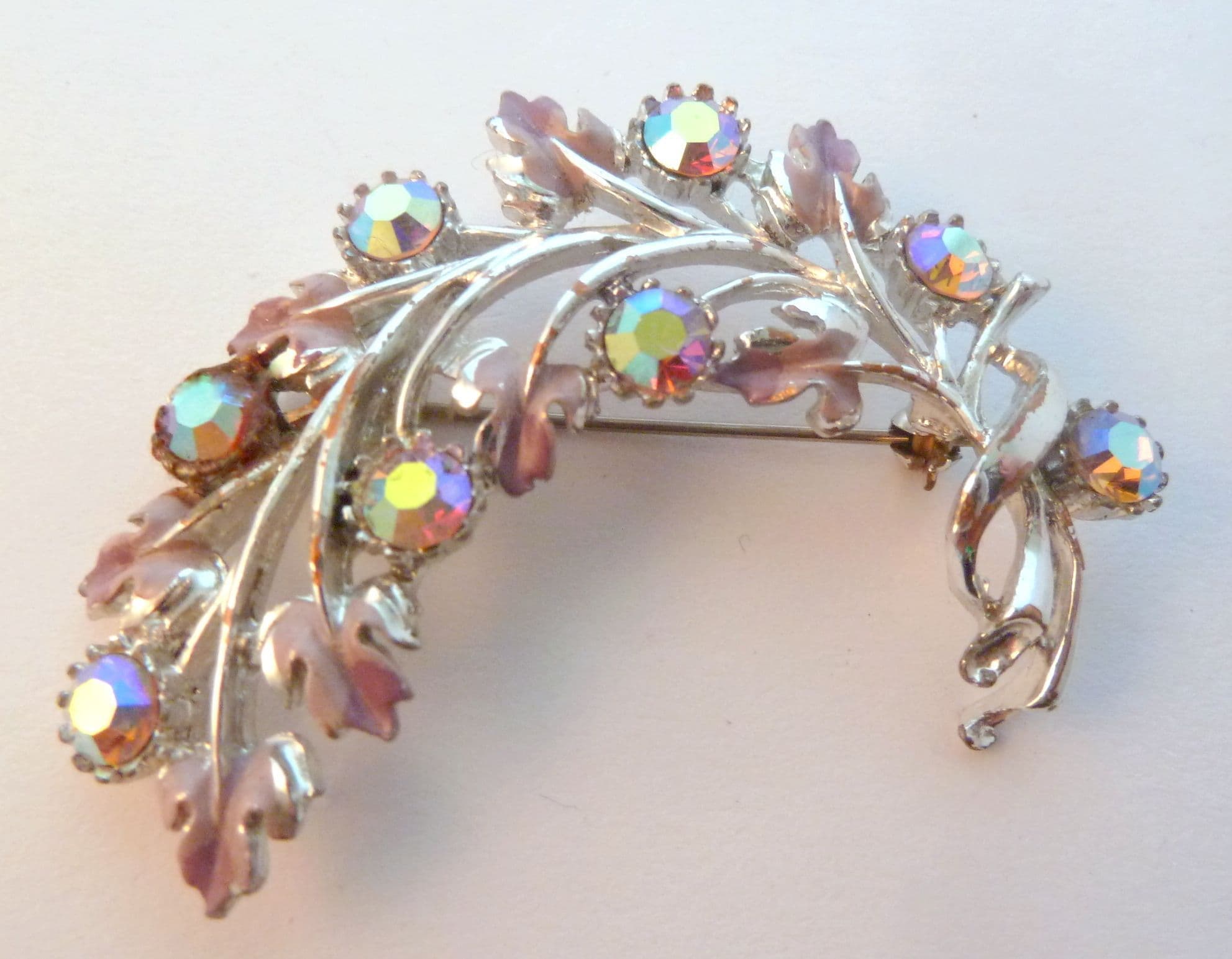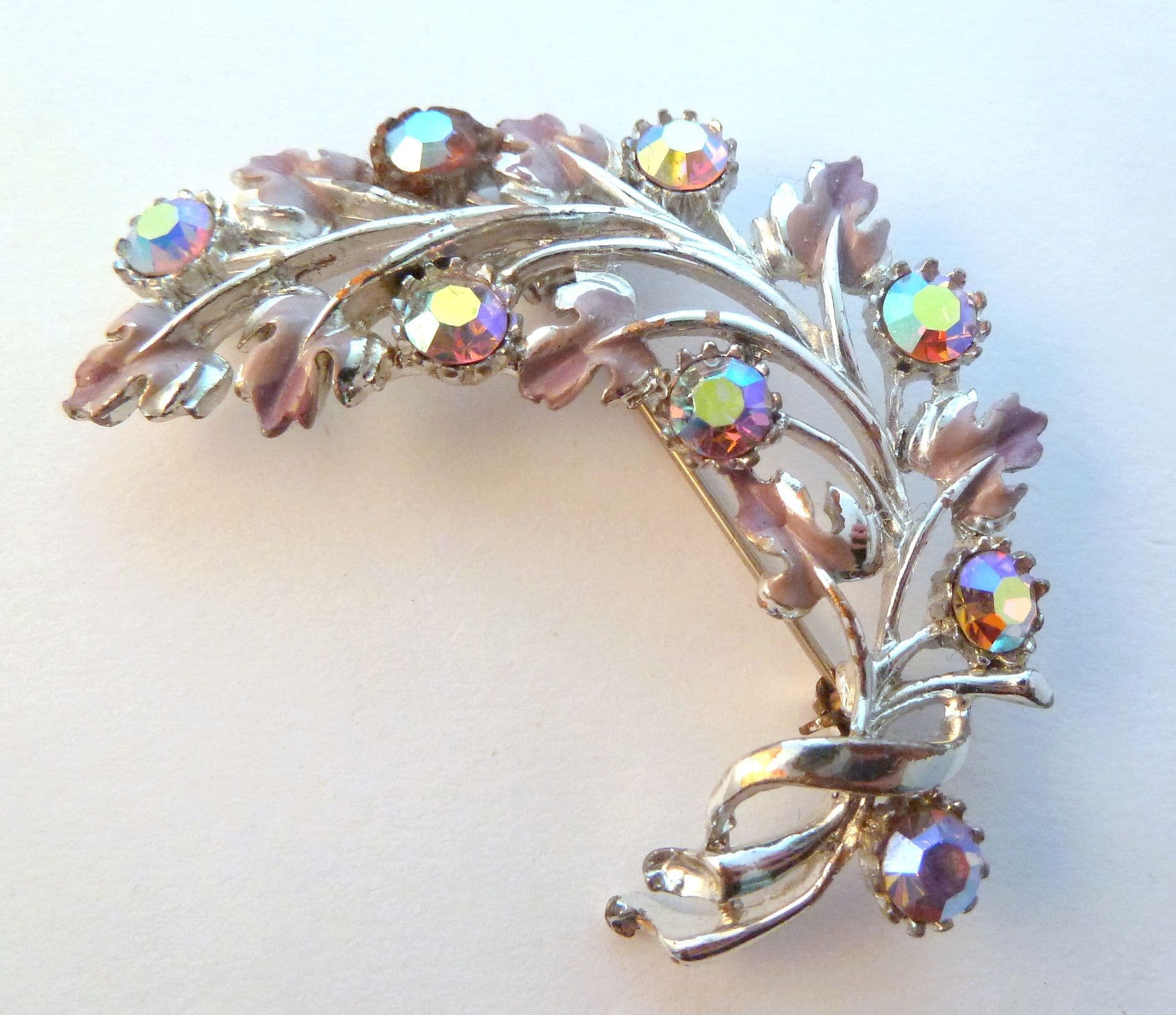 Vintage large curved enamel and aurora borealis rhinestone set brooch. The brooch is formed from silver tone metal in a curving leaf design, set with pink and lilac pastel tones enamel and adorned with large aurora borealis rhinestones. Circa late 1950's - early 60's.