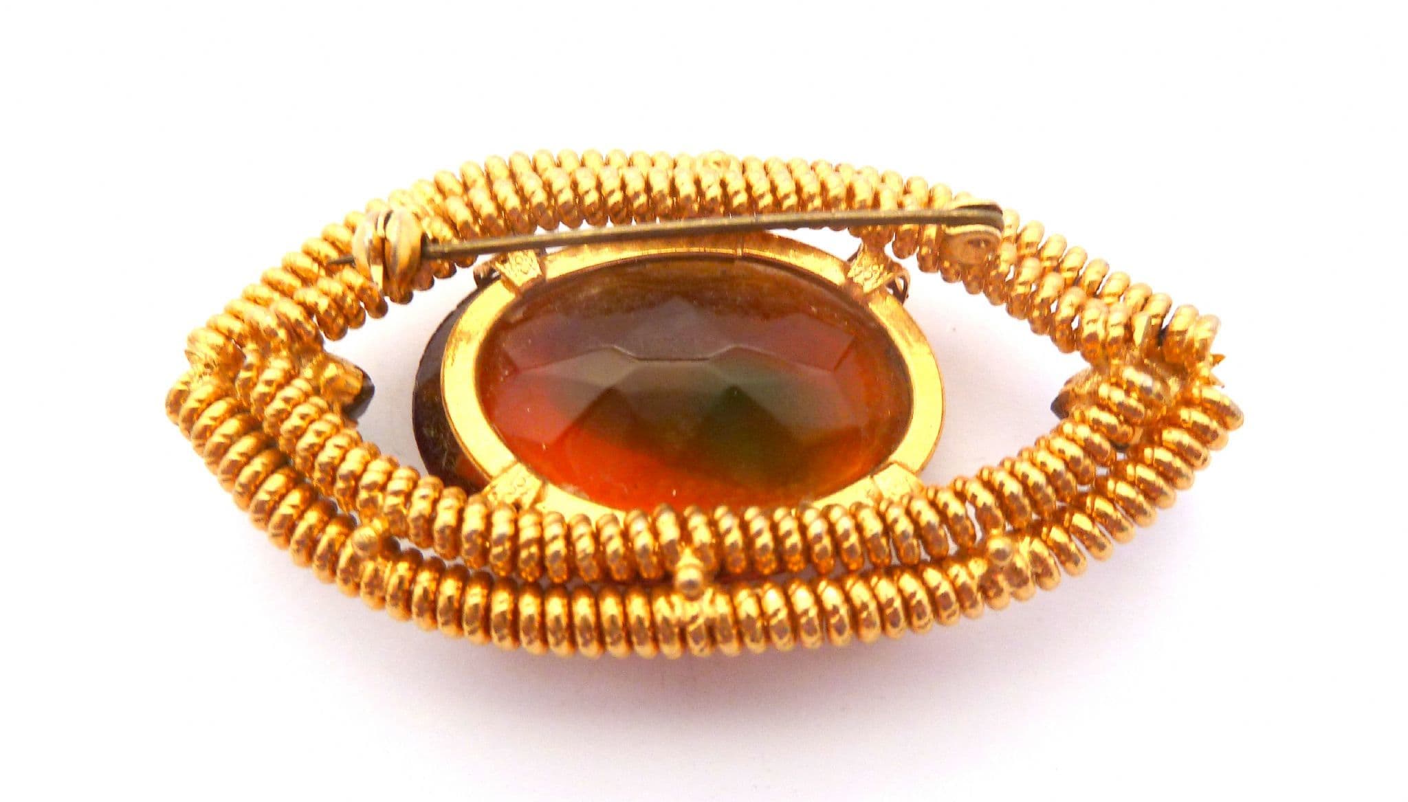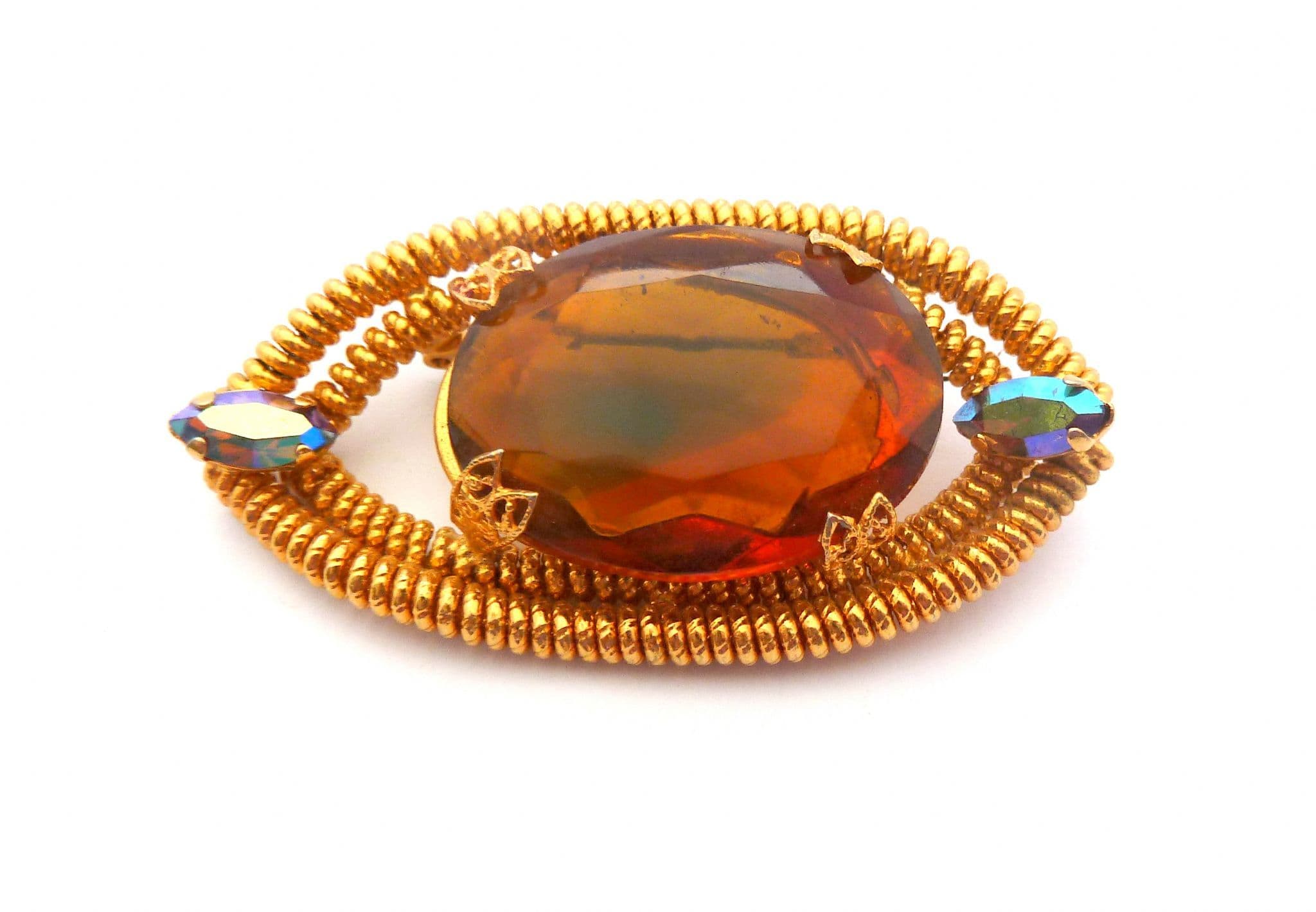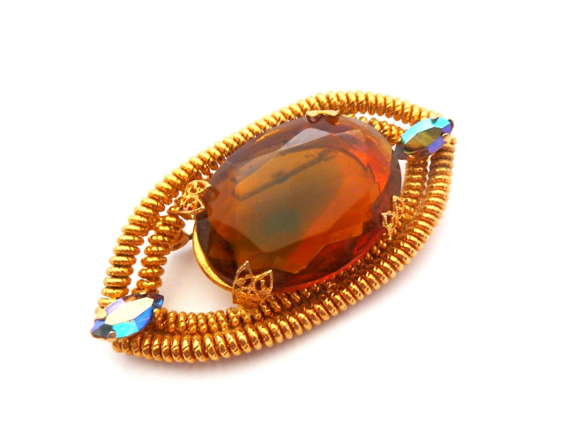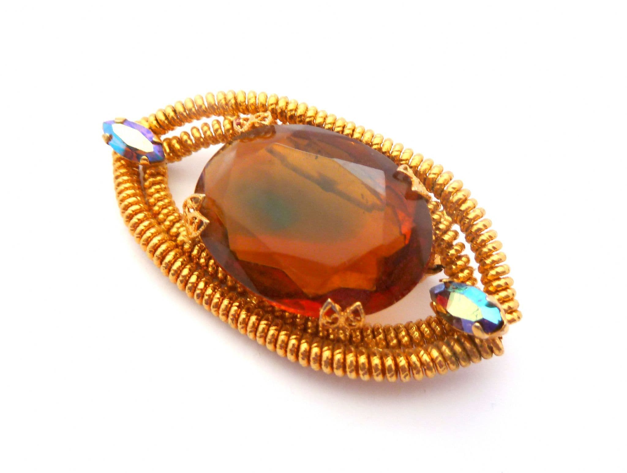 A vintage large faux smoky topaz and aurora borealis rhinestone set brutalist style brooch. The brooch is formed from gold tone metal with a lightly ridged rope style border set with a large smoky topaz coloured glass central piece, with an aurora borealis navette rhinestone to each side of the central stone, the brooch has a rollover safety clasp fastening. Circa 1970's.