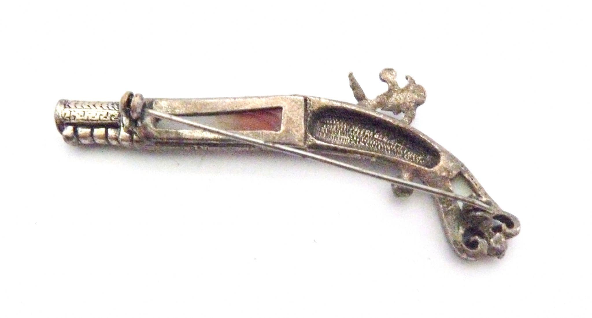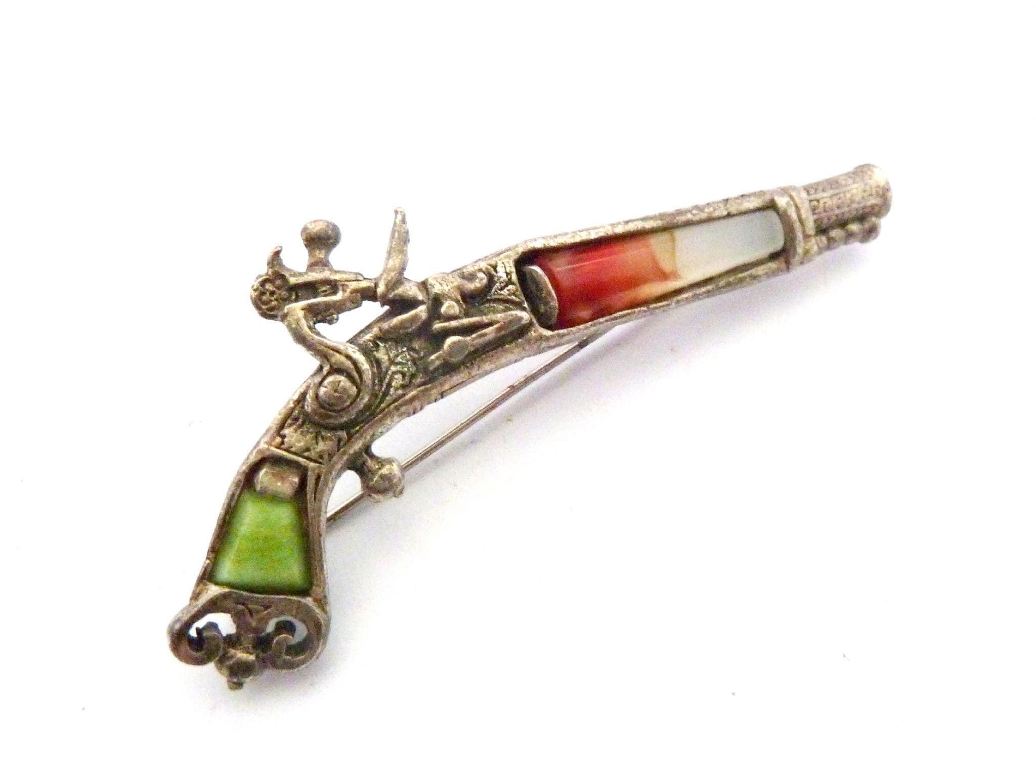 Vintage large flintlock pistol design brooch manufactured by Miracle a designer jewellery brand of A Hill and company Ltd. The brooch is formed from silver tone metal in the design of an old flintlock pistol set with faux agate glass. Circa 1960's - 70's. Signed Miracle to the back of the brooch.
