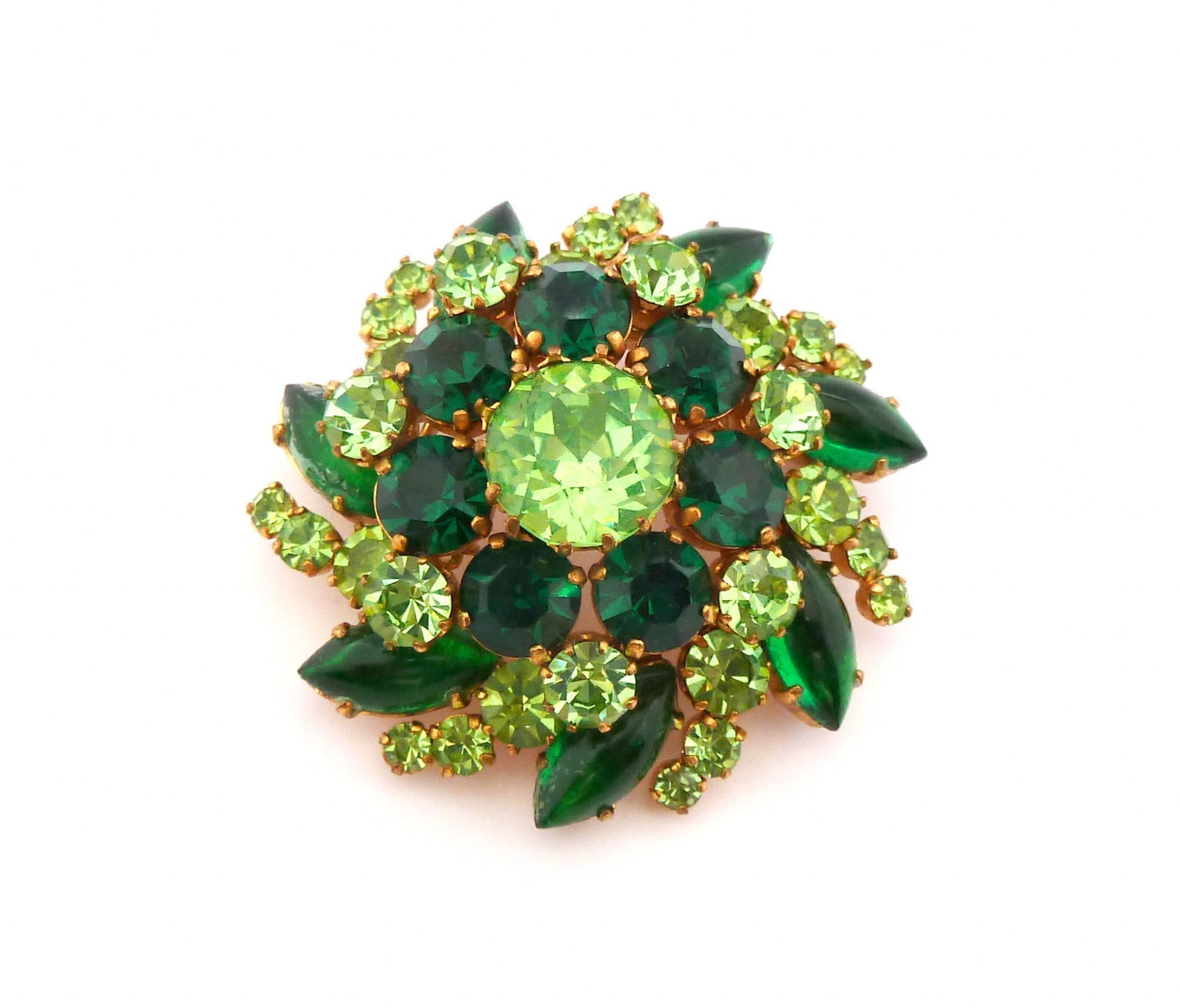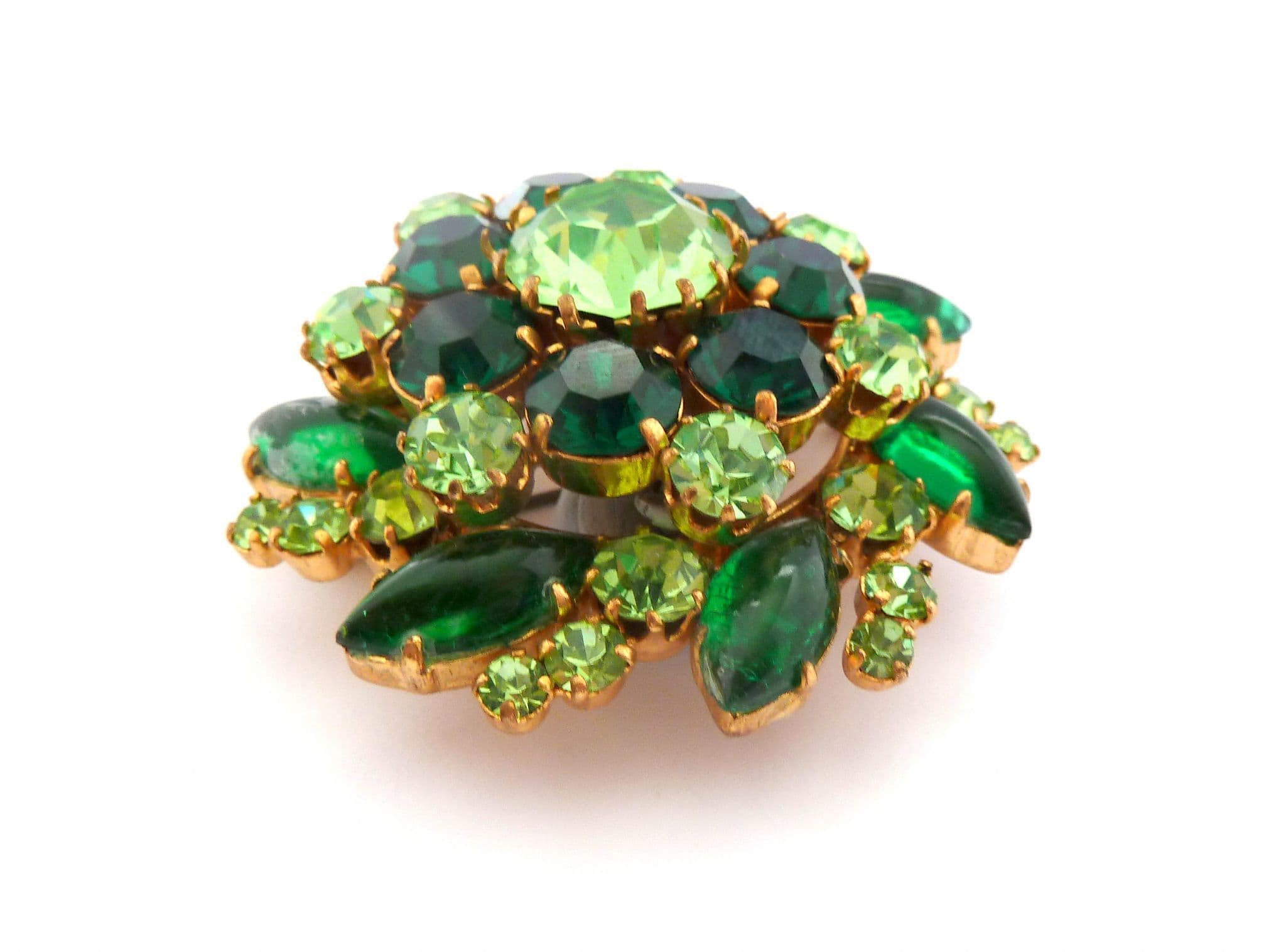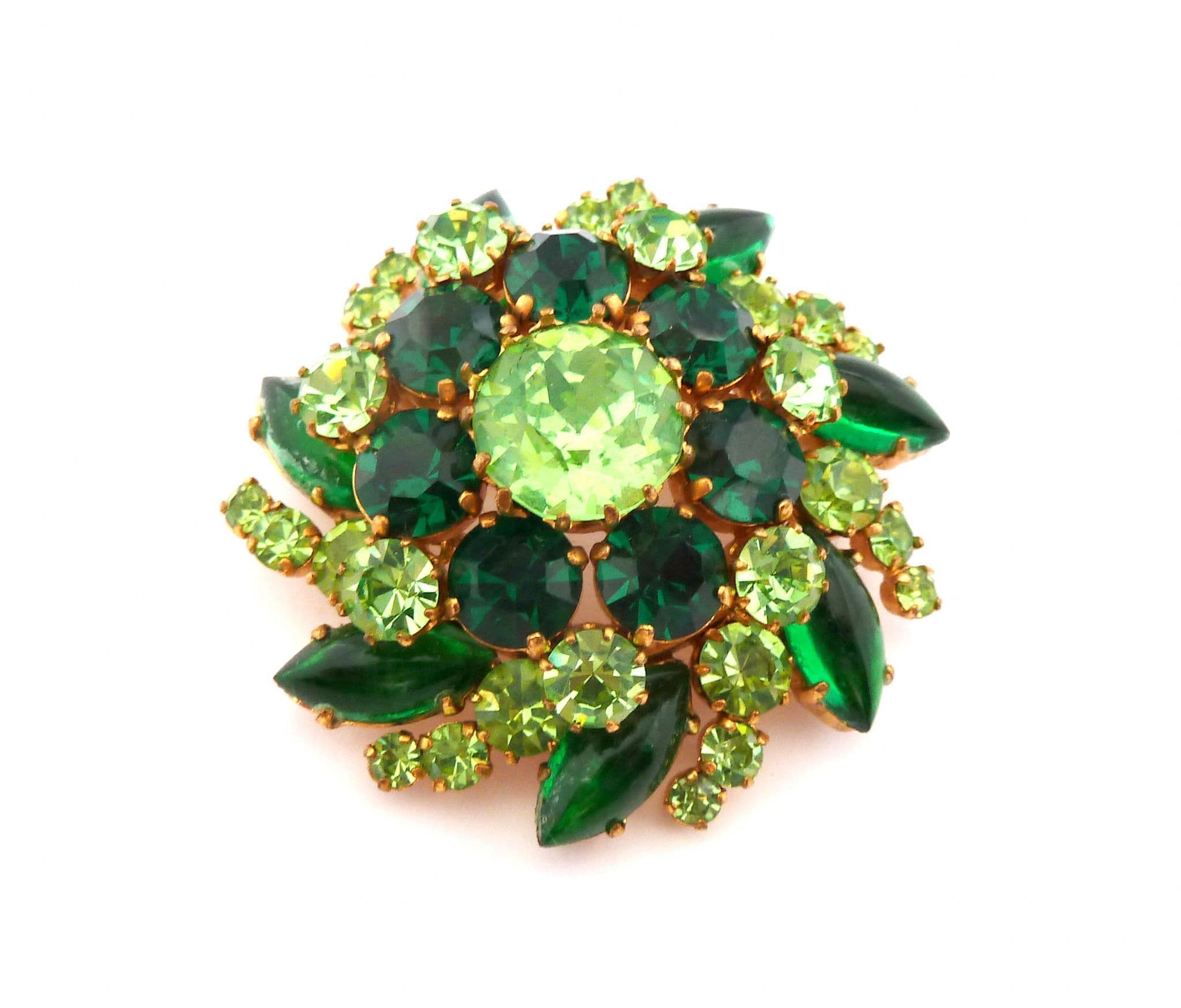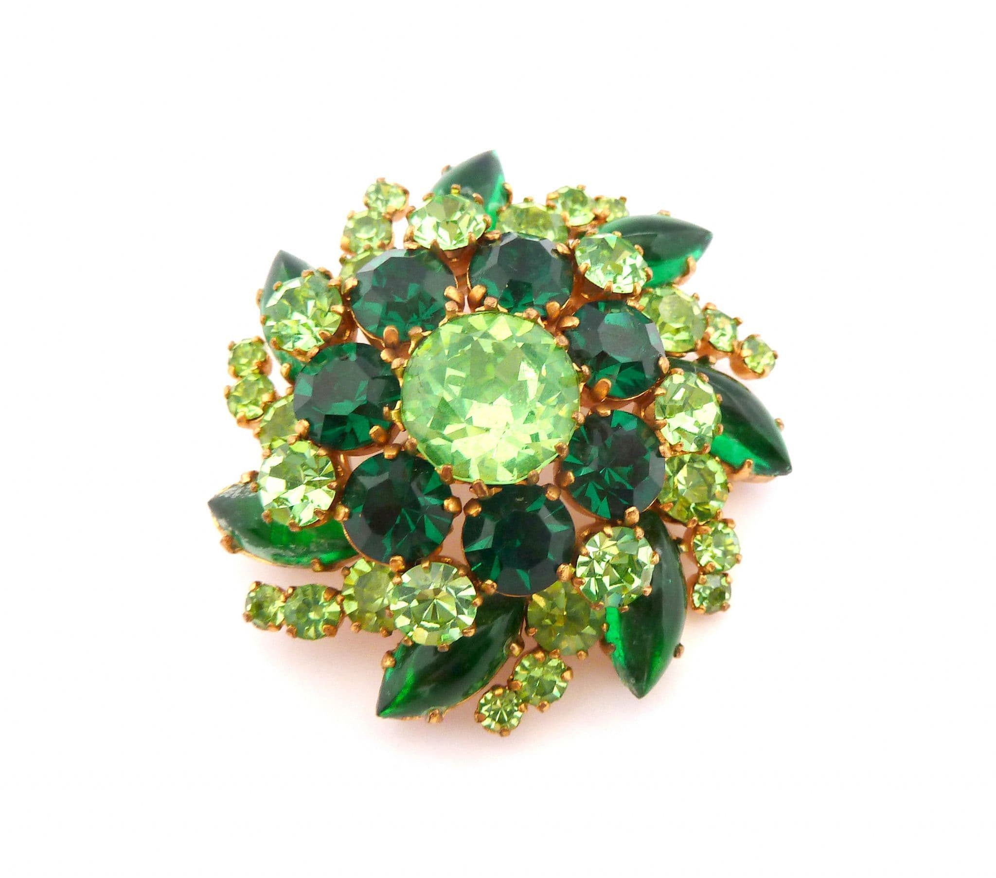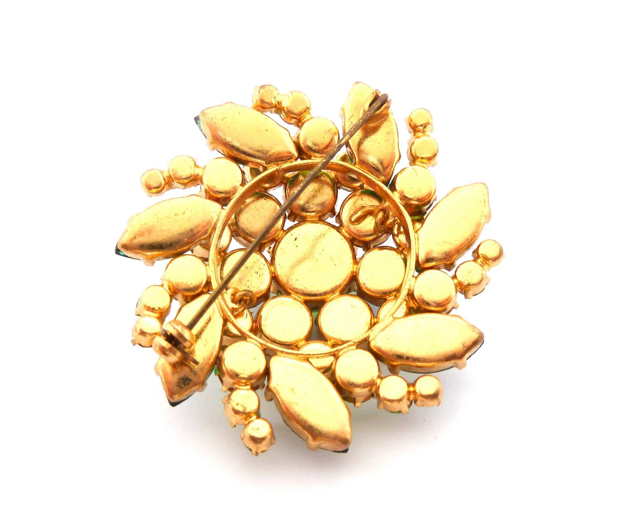 A vintage large peridot and emerald green coloured glass rhinestone layered floral geometric design statement brooch. The brooch is formed with from gold tone metal in a layered peridot and emerald green coloured rhinestone design, The brooch has a roll over safety clasp fastening. Circa 1950's - 60's.