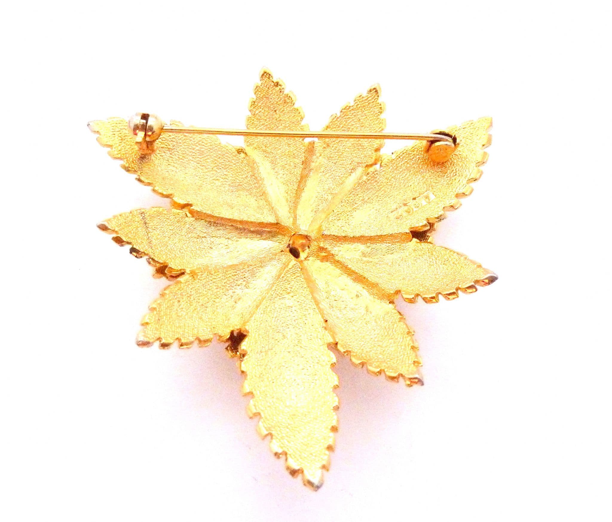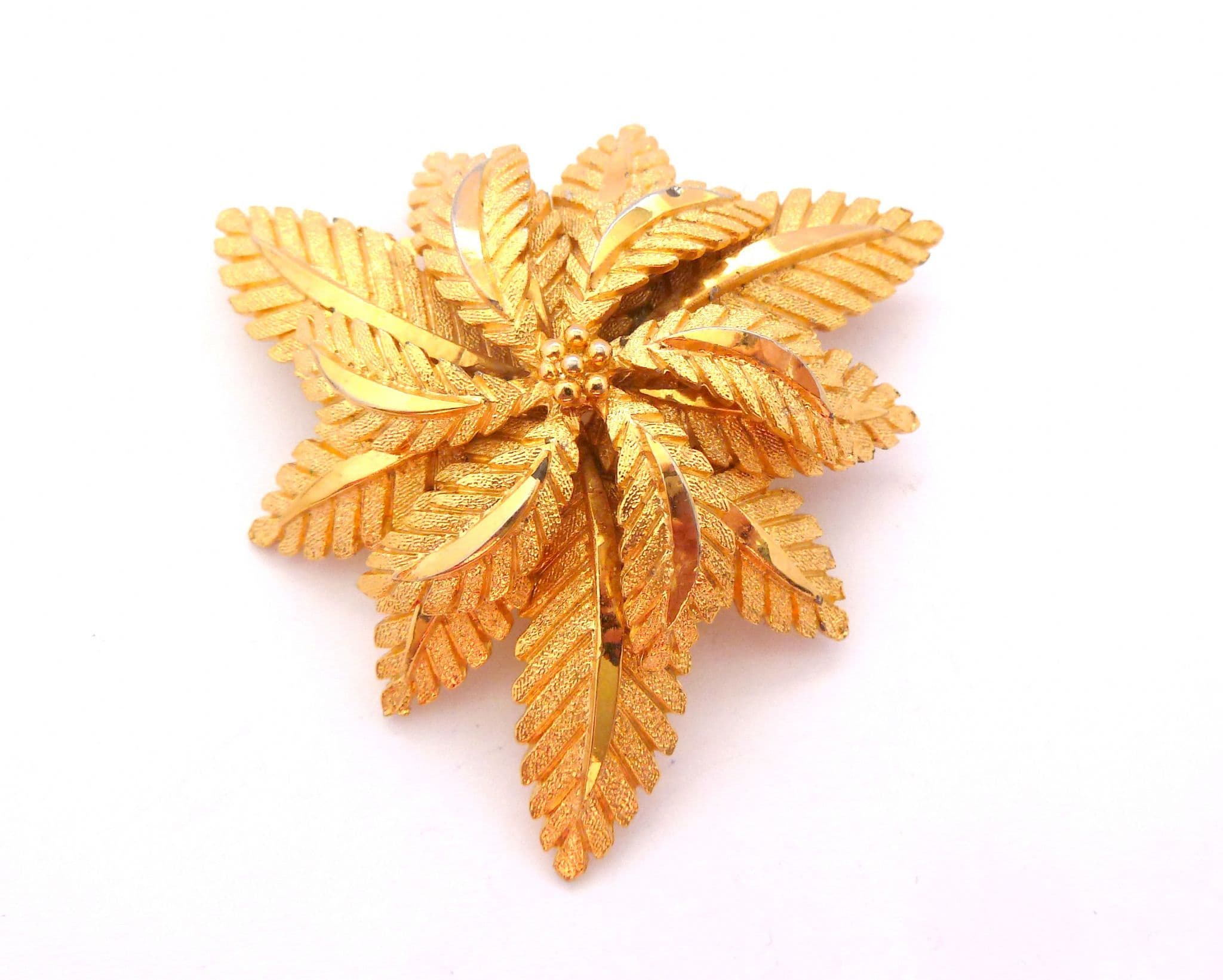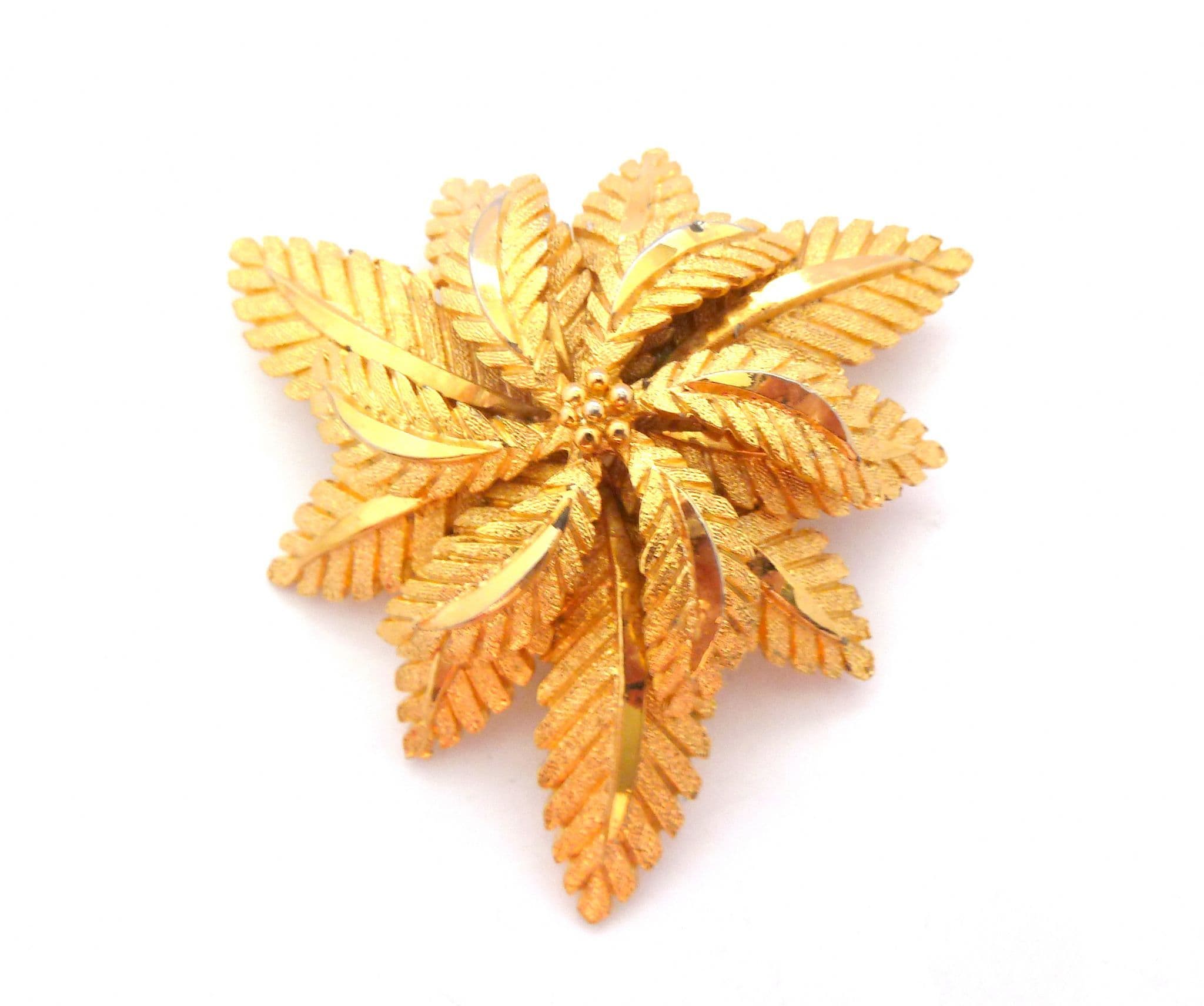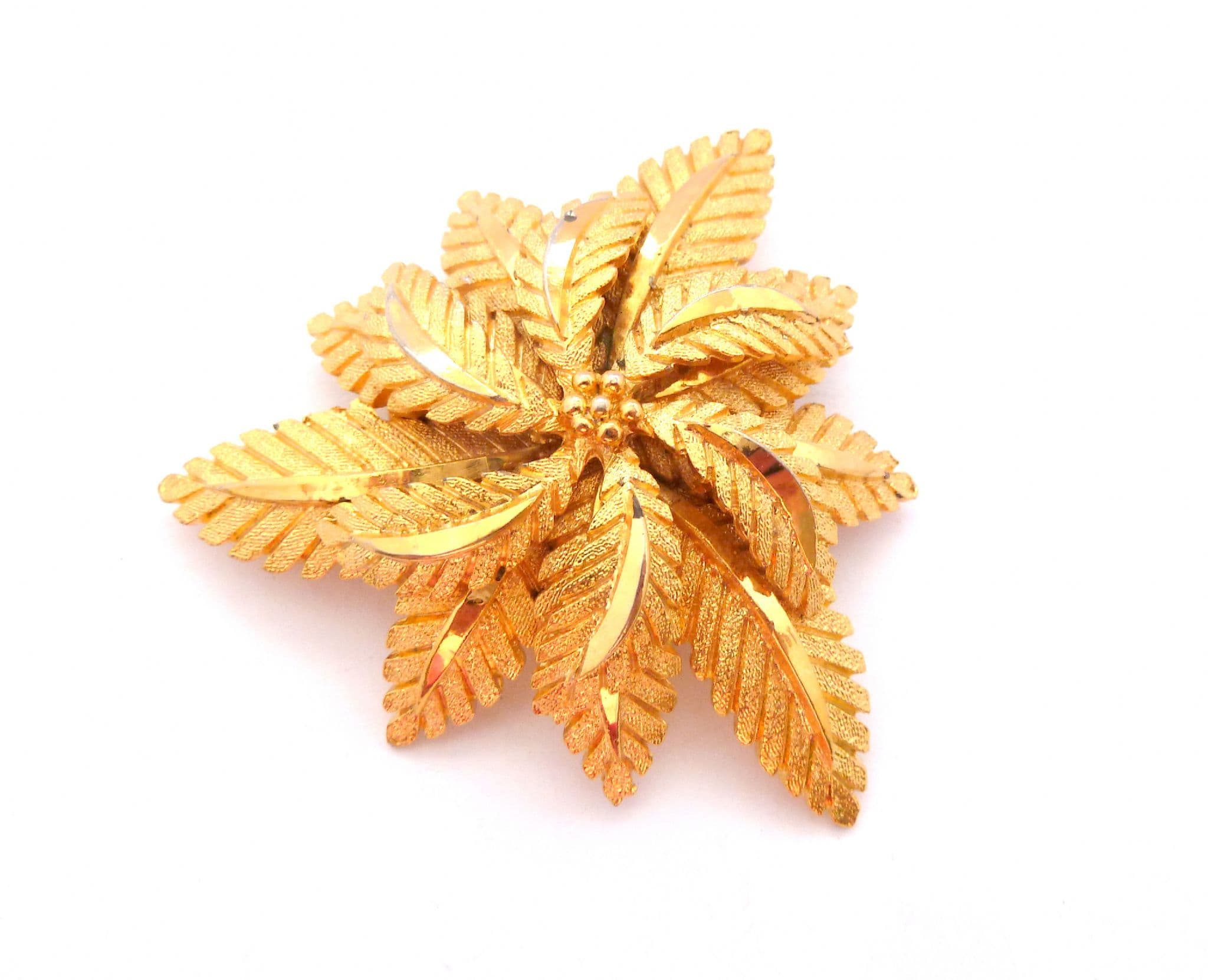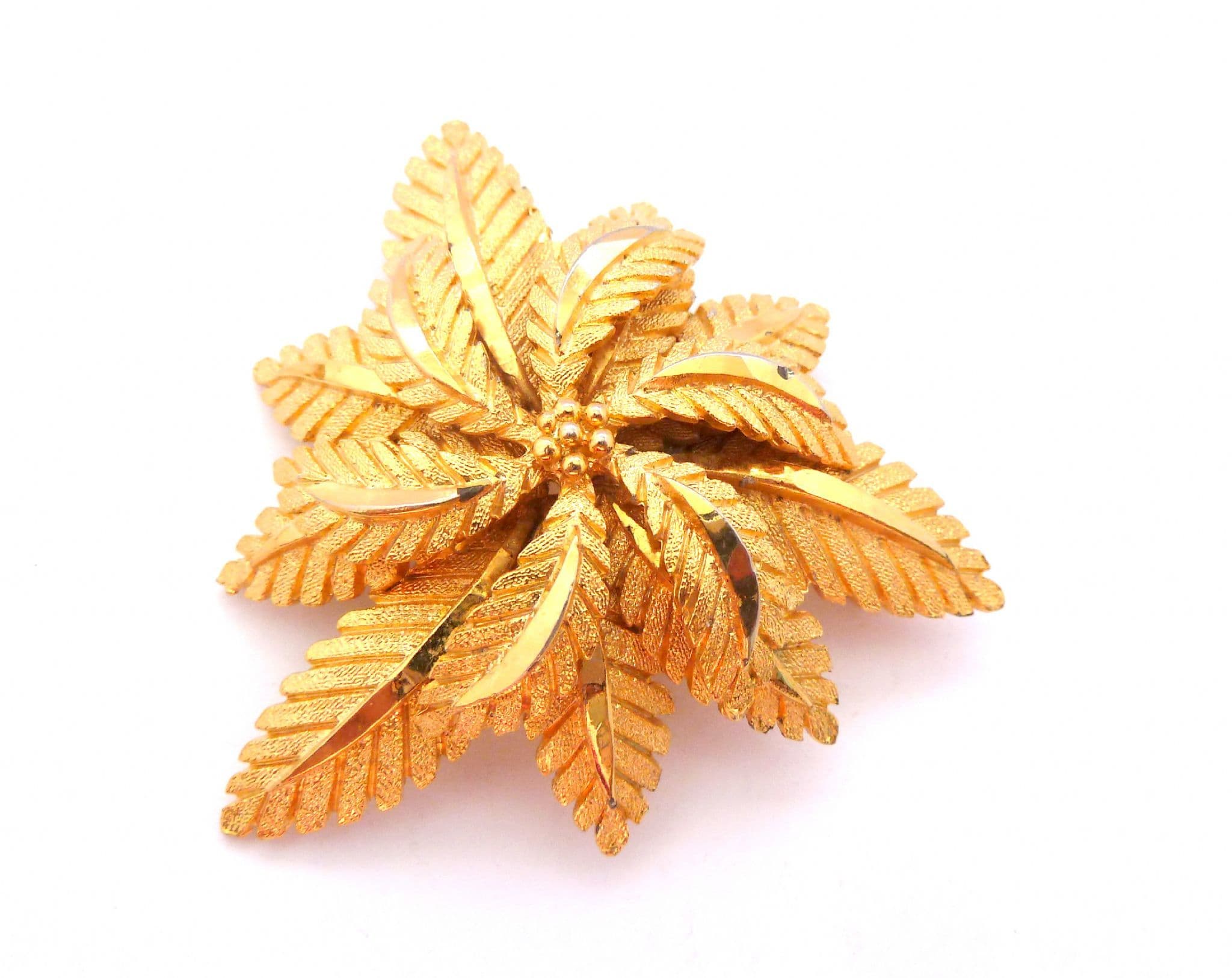 Vintage large modernist style layered flower and leaf design brooch attributed to Sphinx. Formed from textured and polished gold tone metal in a large layered flower and leaf corsage style design. Circa 1970's. Manufacturers number stamp to back