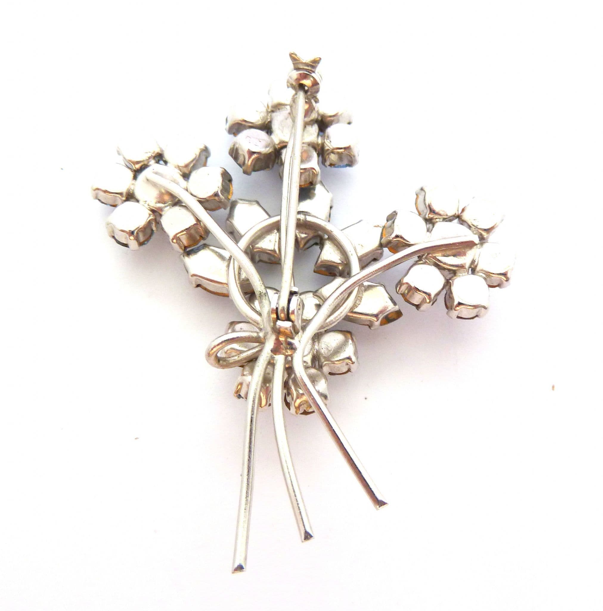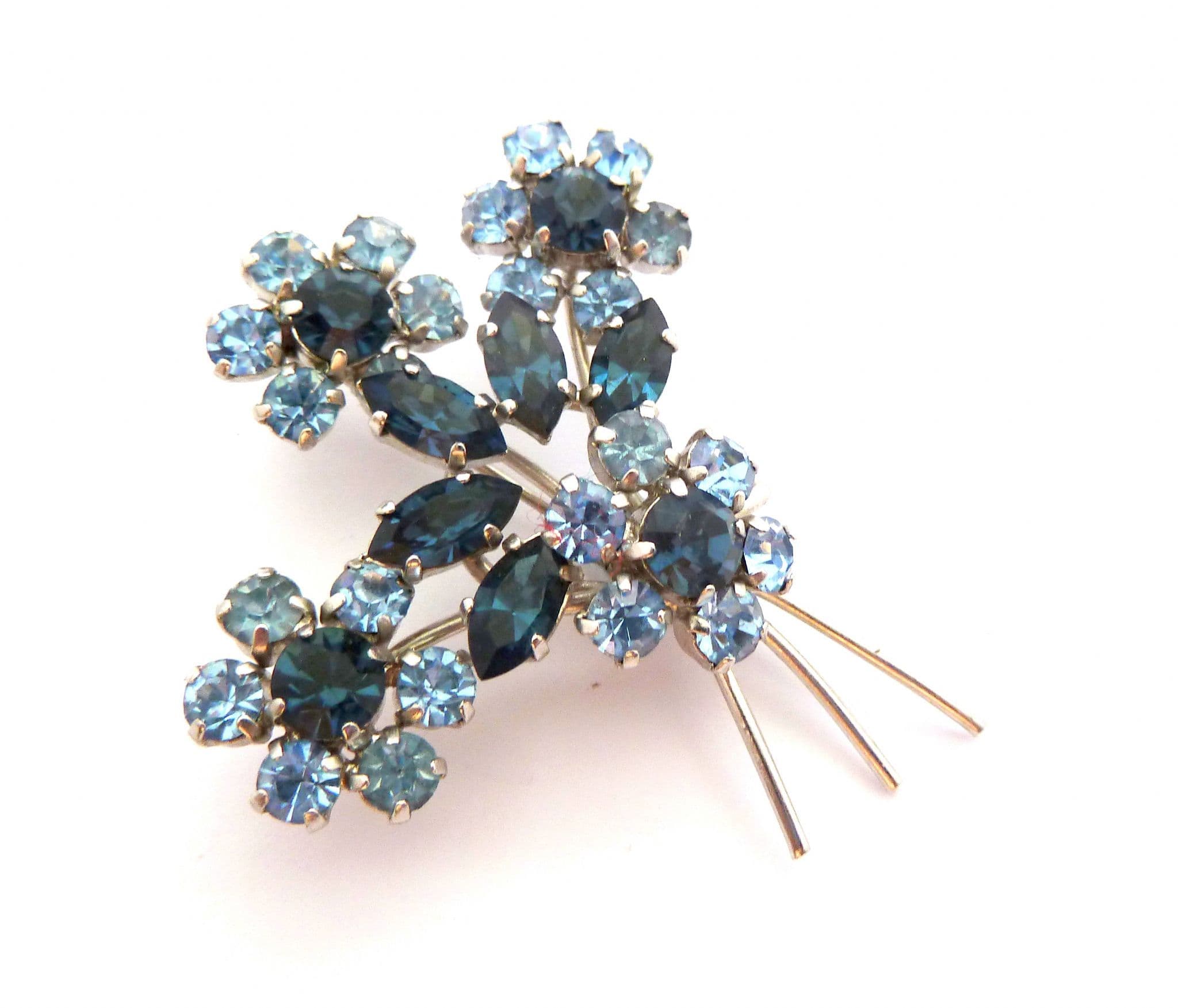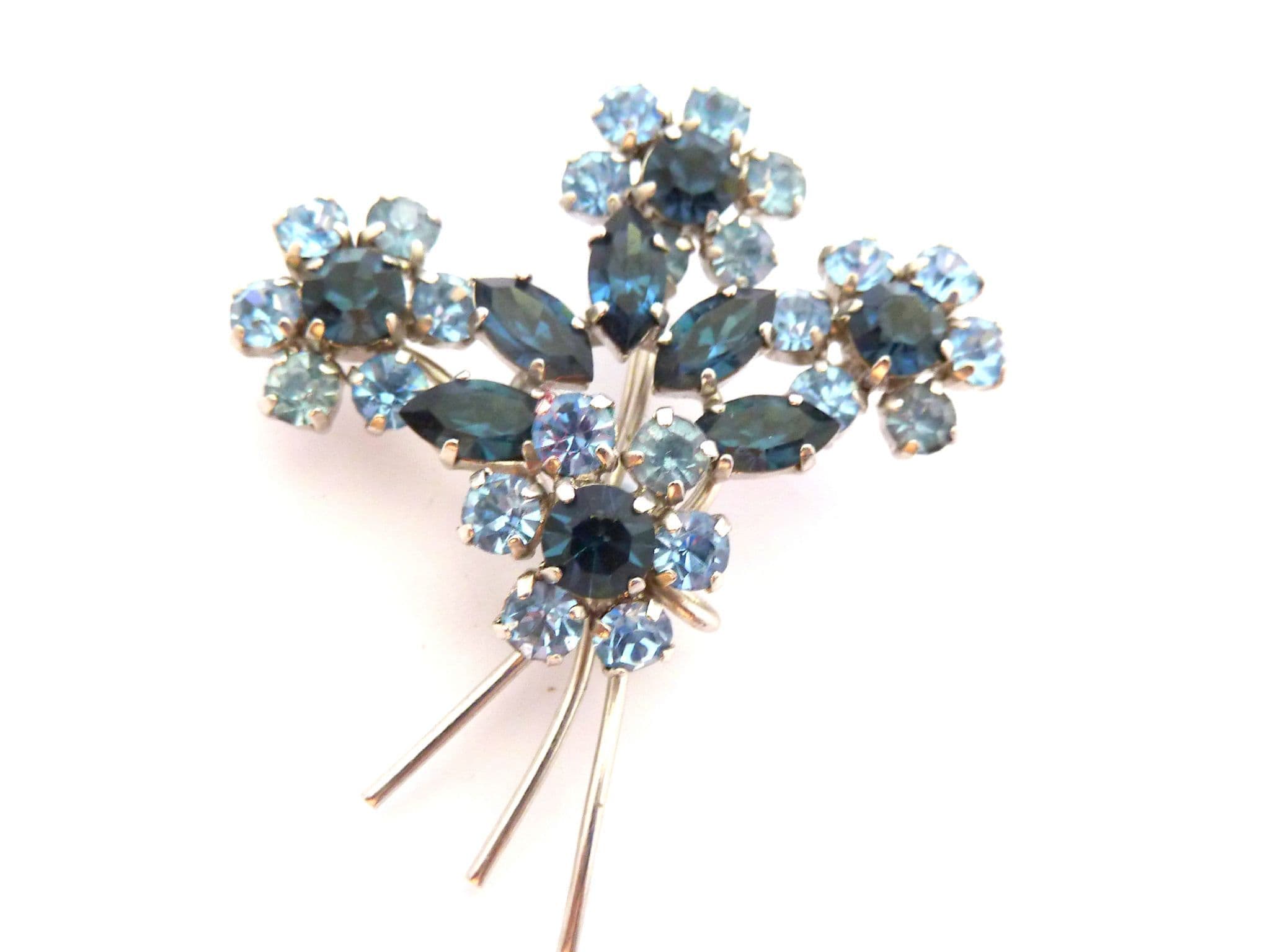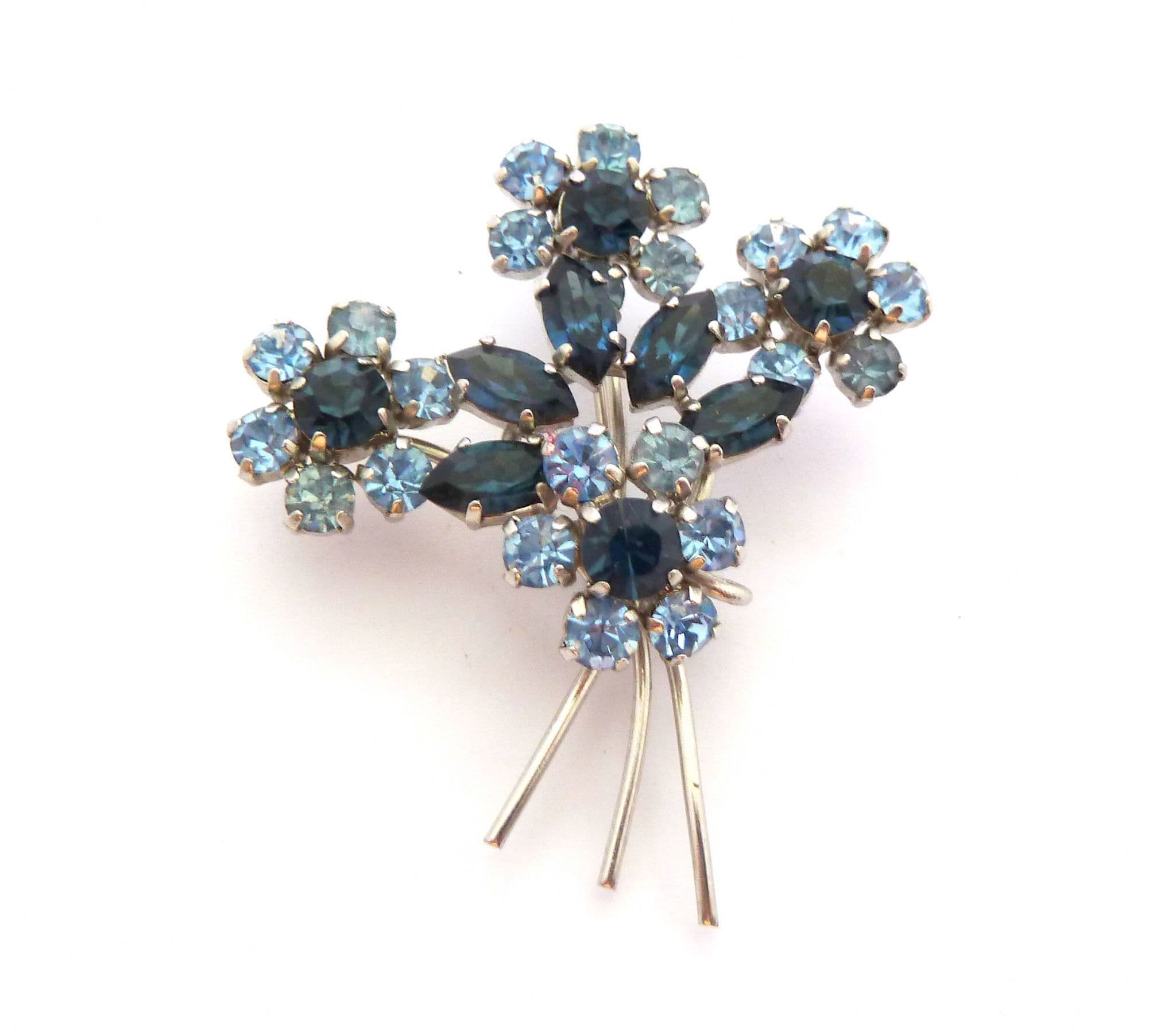 Vintage large light and dark blue rhinestone set floral posy design mid century brooch. Formed from silver tone metal, in a floral design the petals of which are set with light and dark blue rhinestones, Fastens with a roll over safety clasp. Circa 1950's.