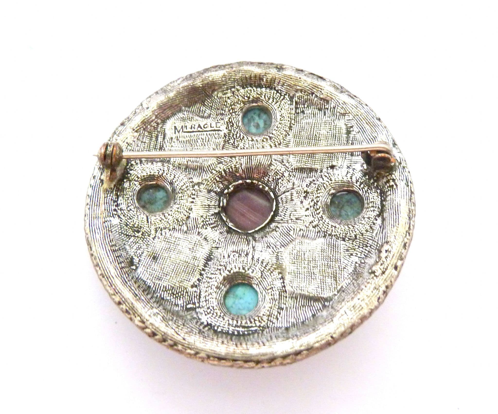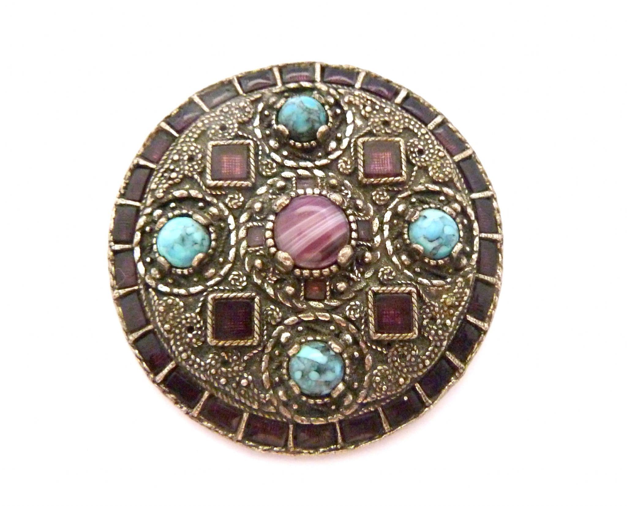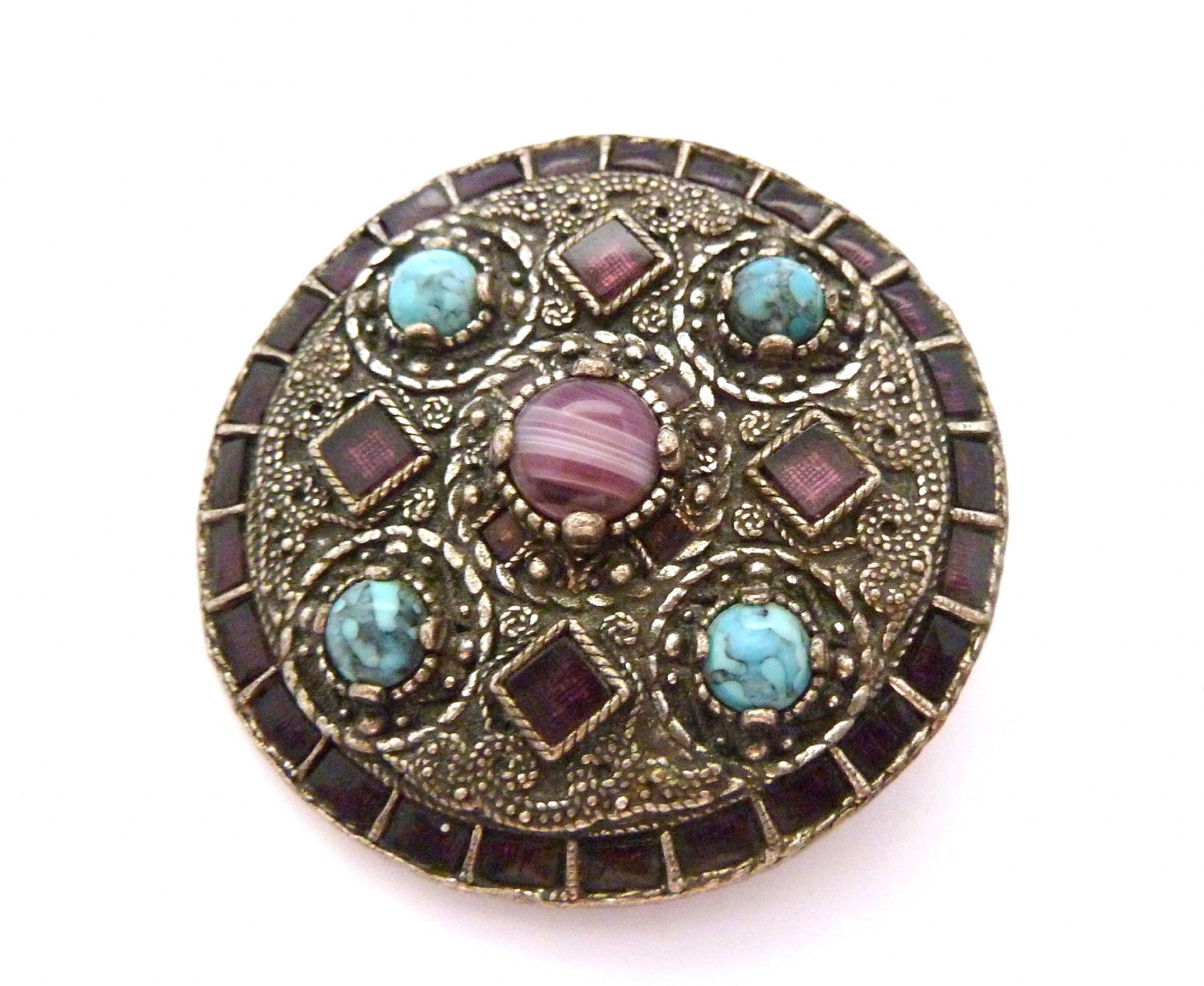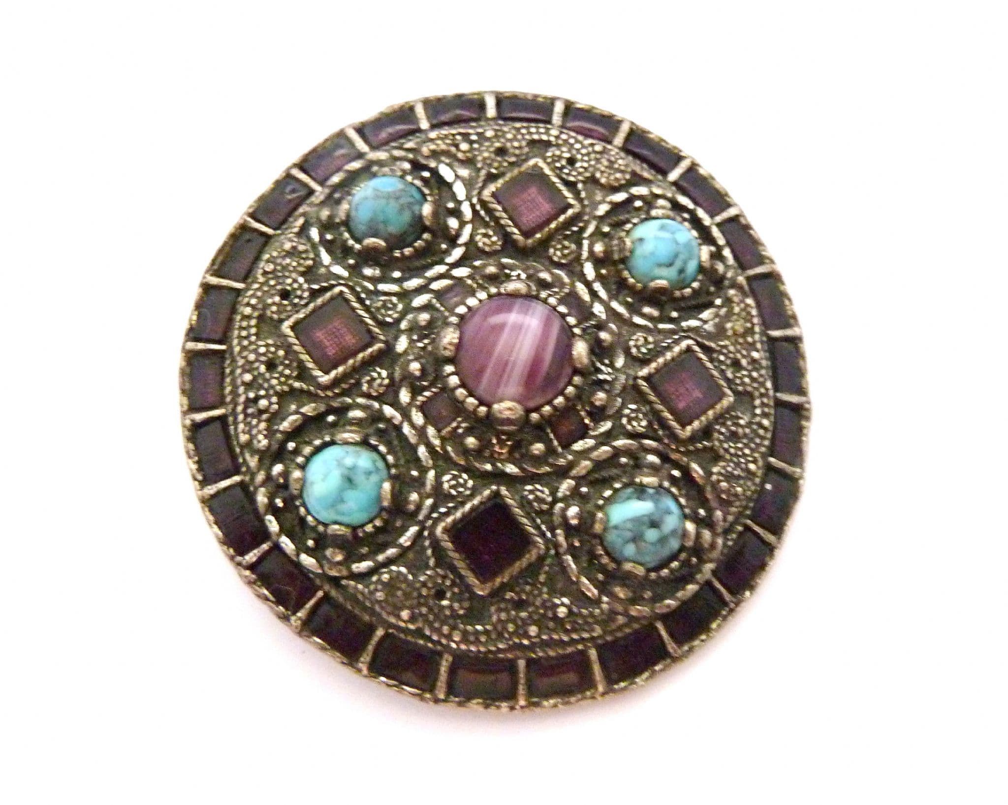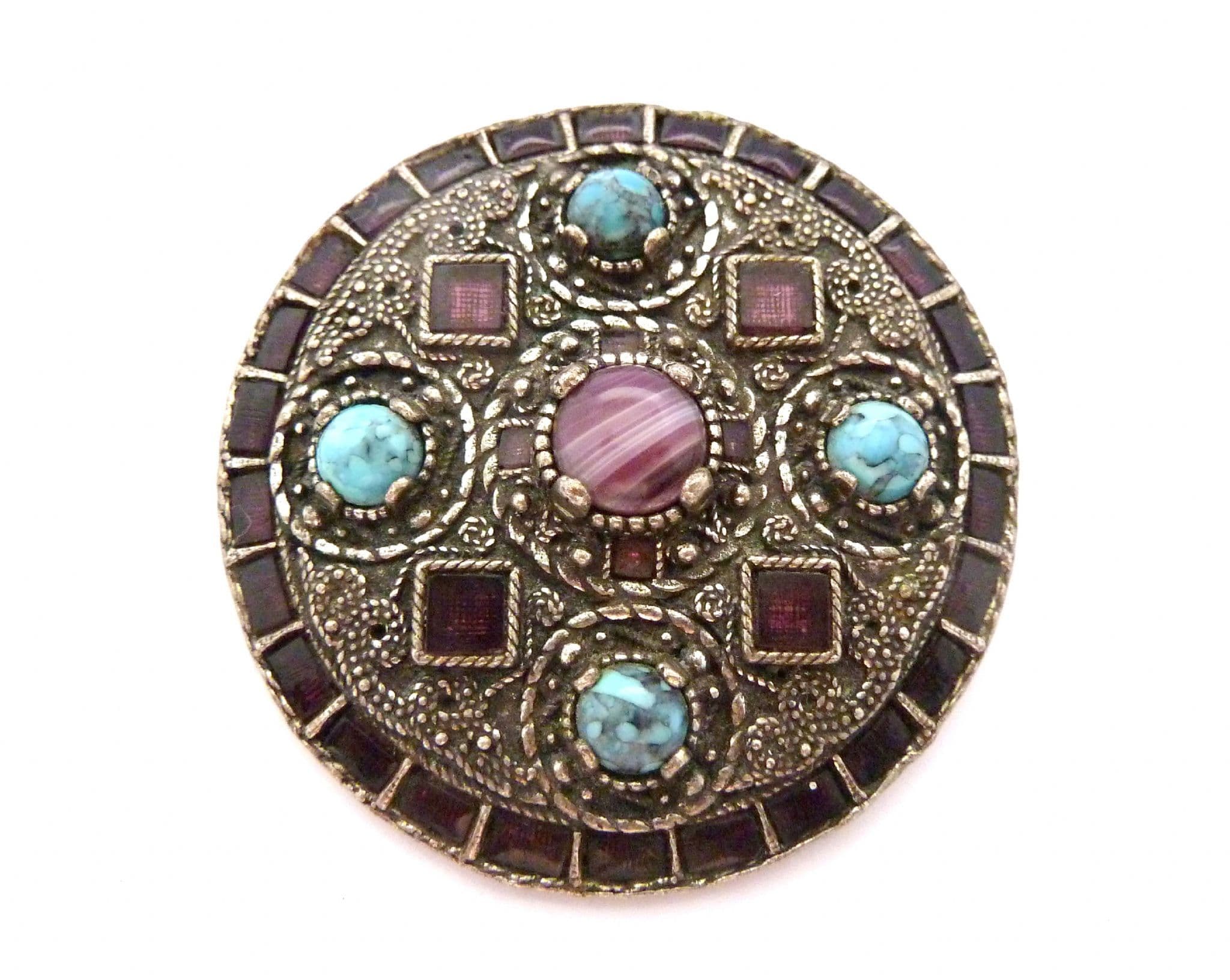 Vintage large Celtic Saxon style faux amethyst and turquoise set statement design brooch by Miracle. The brooch is formed from silver tone metal in a large Celtic Saxon design in which are set faux amethyst glass pieces and faux turquoise cabochons. Circa 1970's - 80's