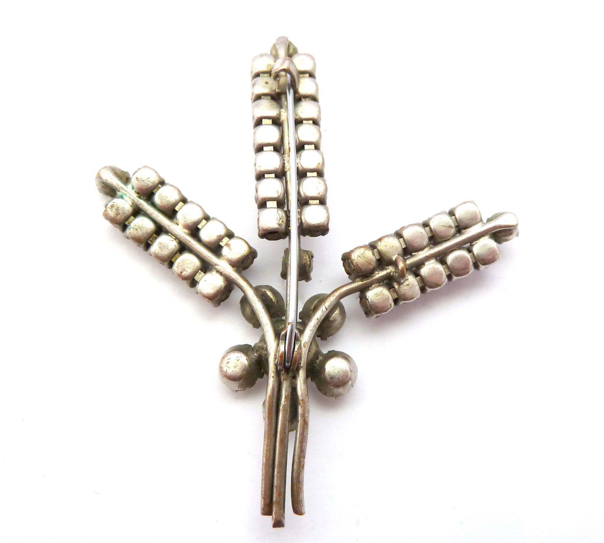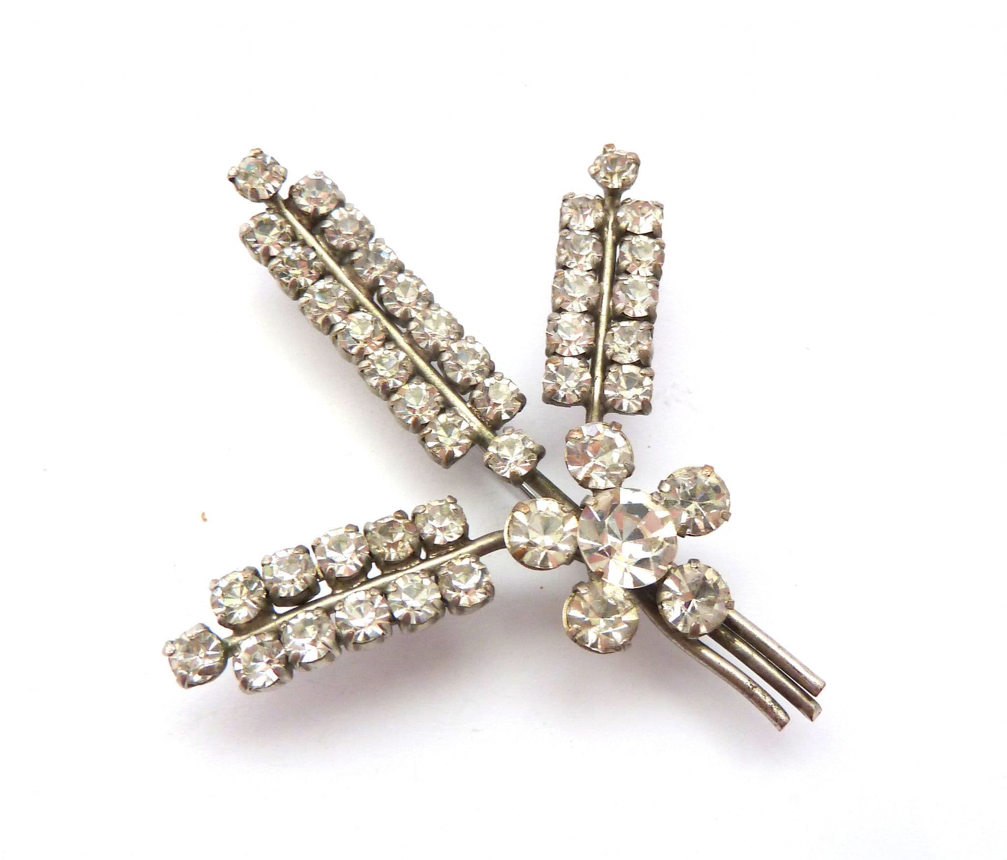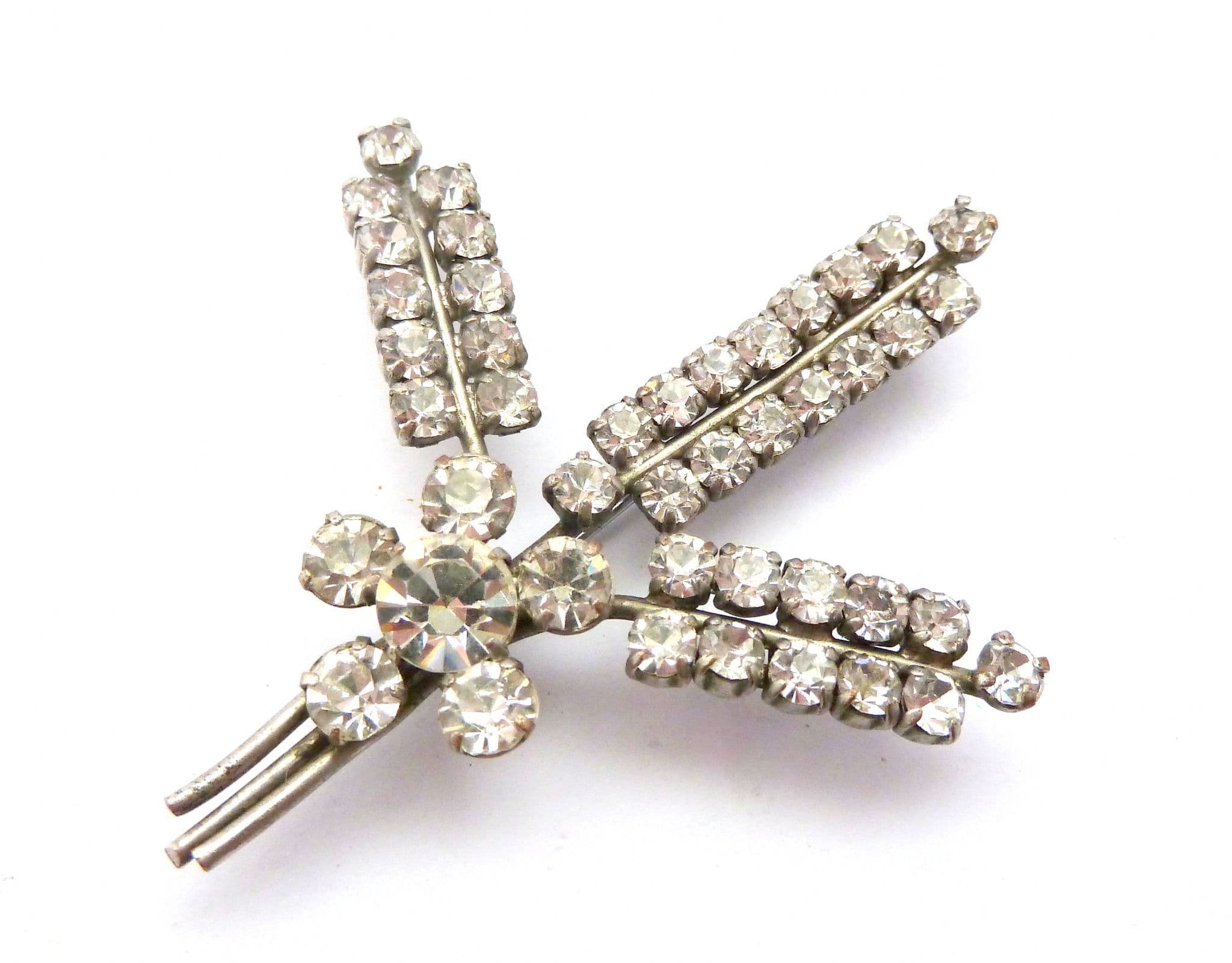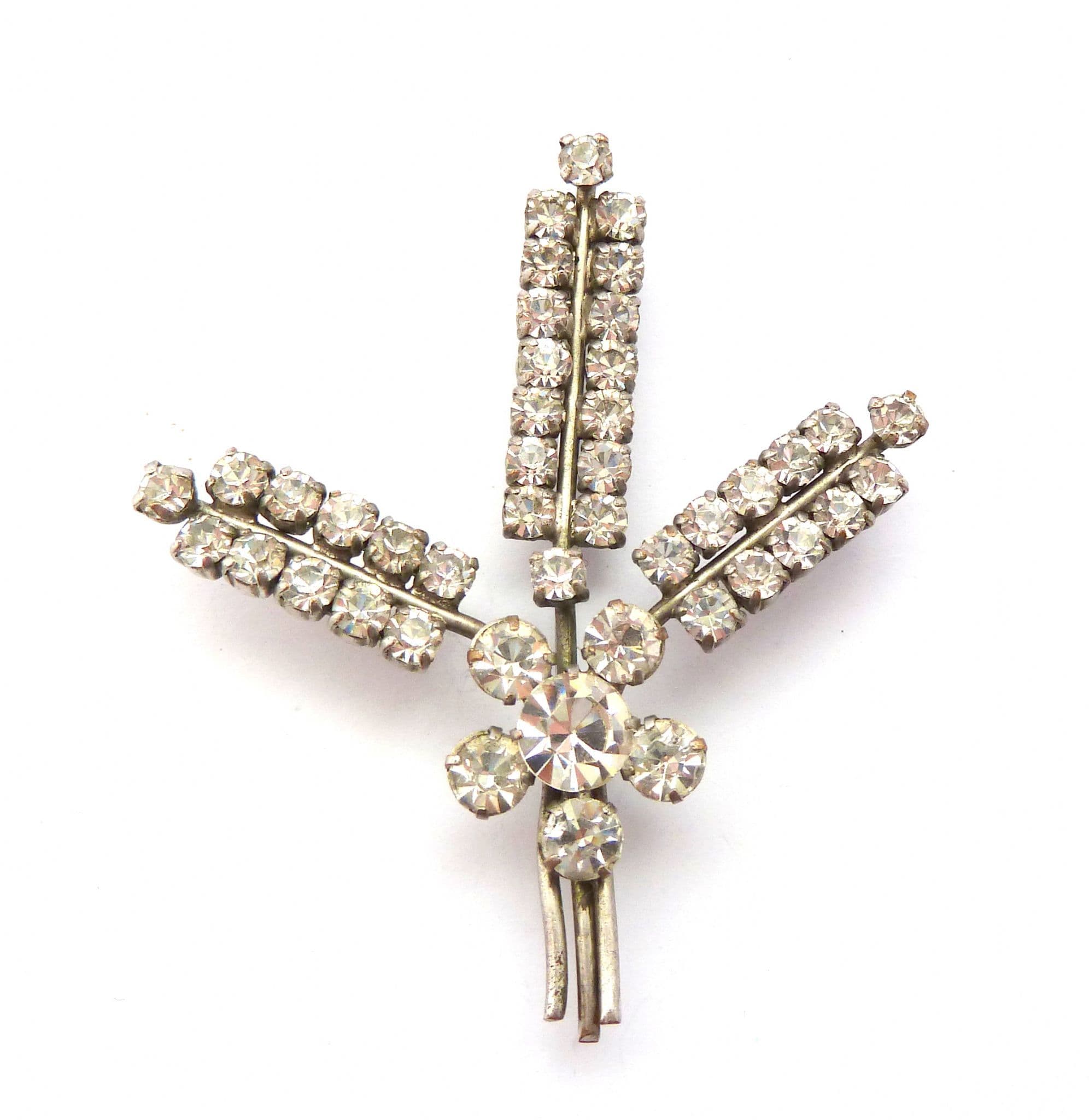 A vintage large rhinestone set abstract modernist floral design brooch. The brooch is formed with from silver tone metal in an abstract modernist floral design set with clear rhinestones. The brooch has a secure roll over safety clasp fastening. Circa 1950's.