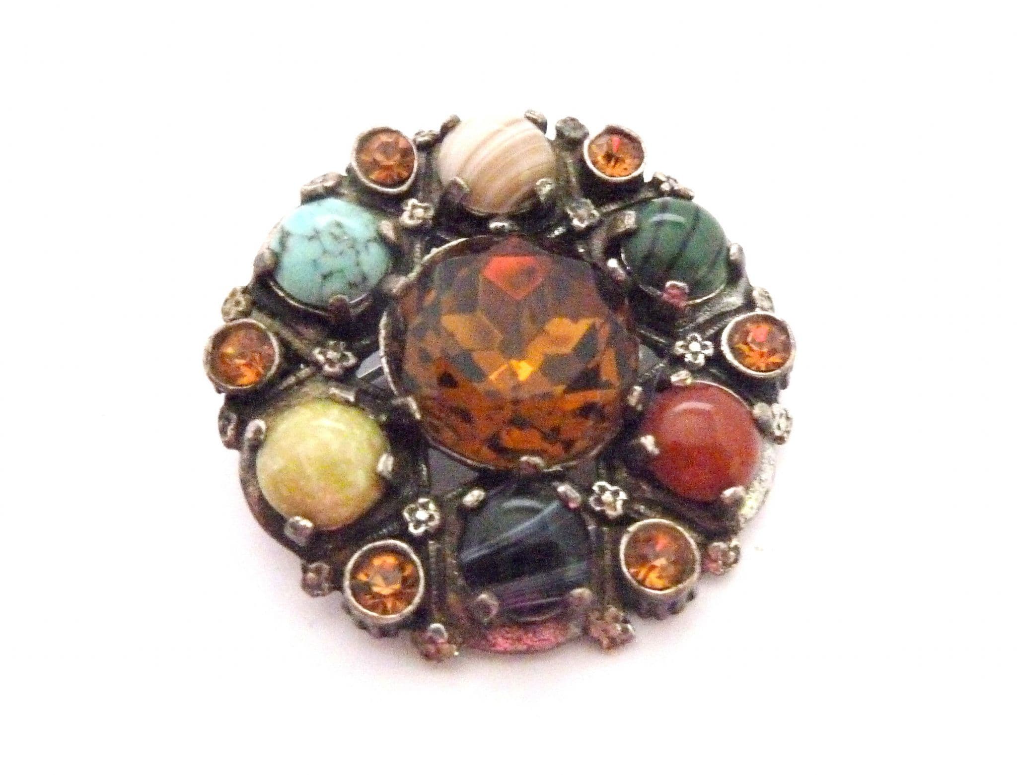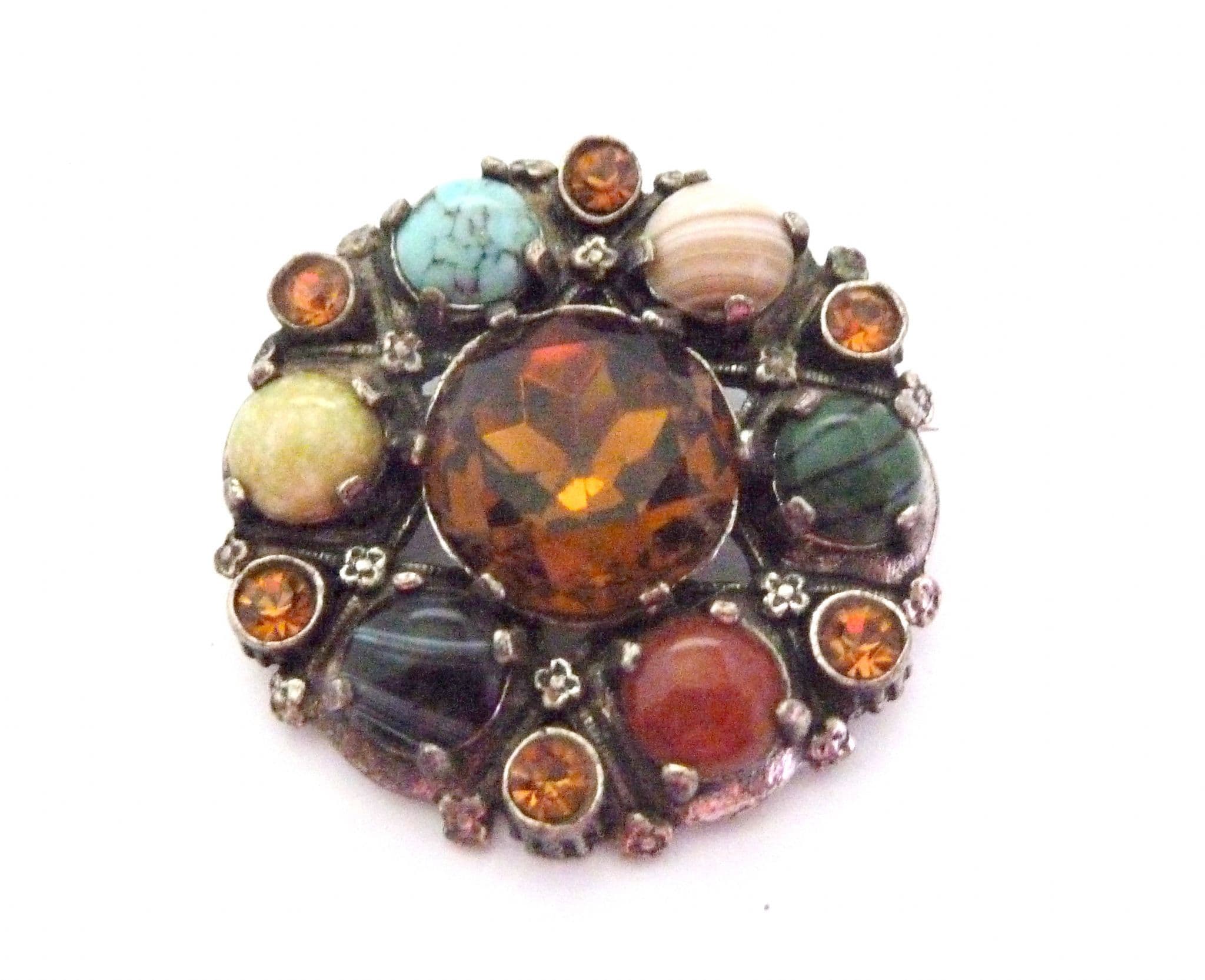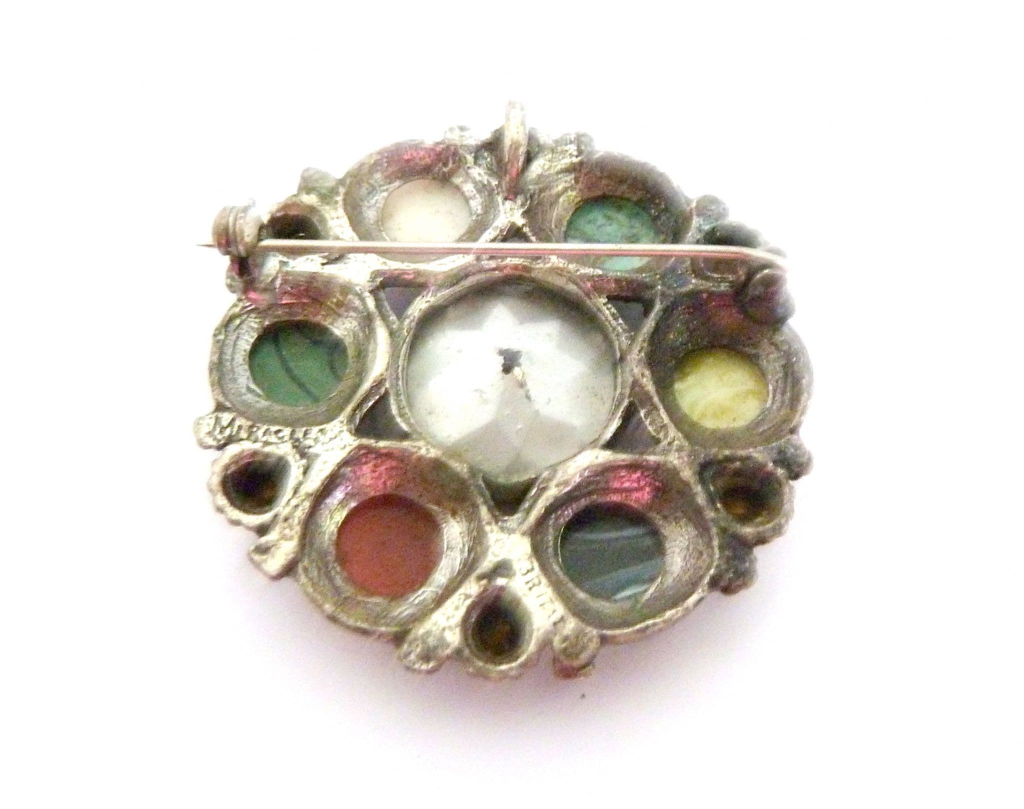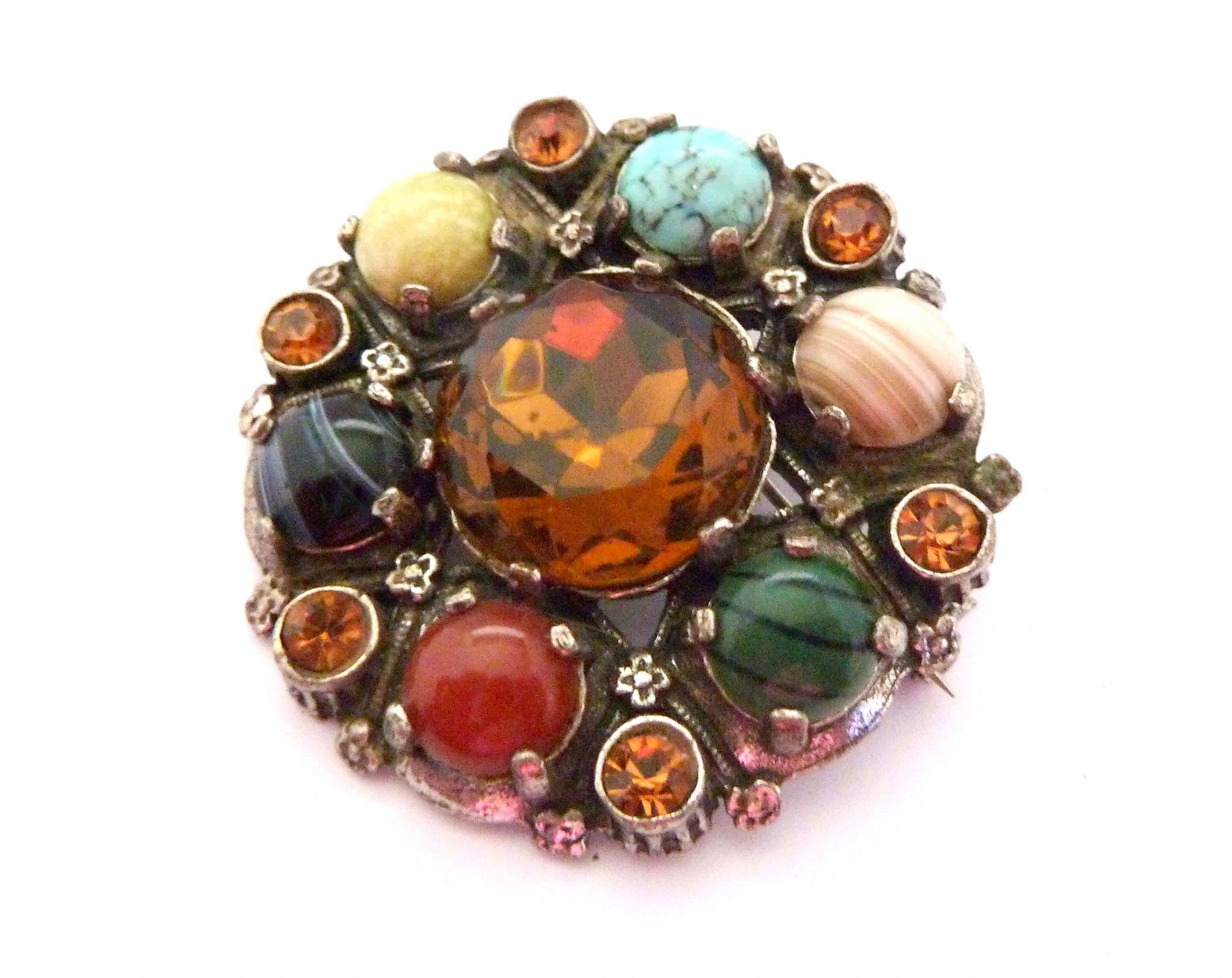 A Celtic Scottish style large brooch manufactured under the trade name Miracle by A Hill and company Ltd. The brooch is fashioned in a circular design with a large central faux Cairngorm rhinestone and is surrounded by six mock gemstones cabochons and rhinestones set in silver tone metal with Tudor rose flower detailing. Circa 1960's - 70's . Signed Miracle to the back of the brooch.