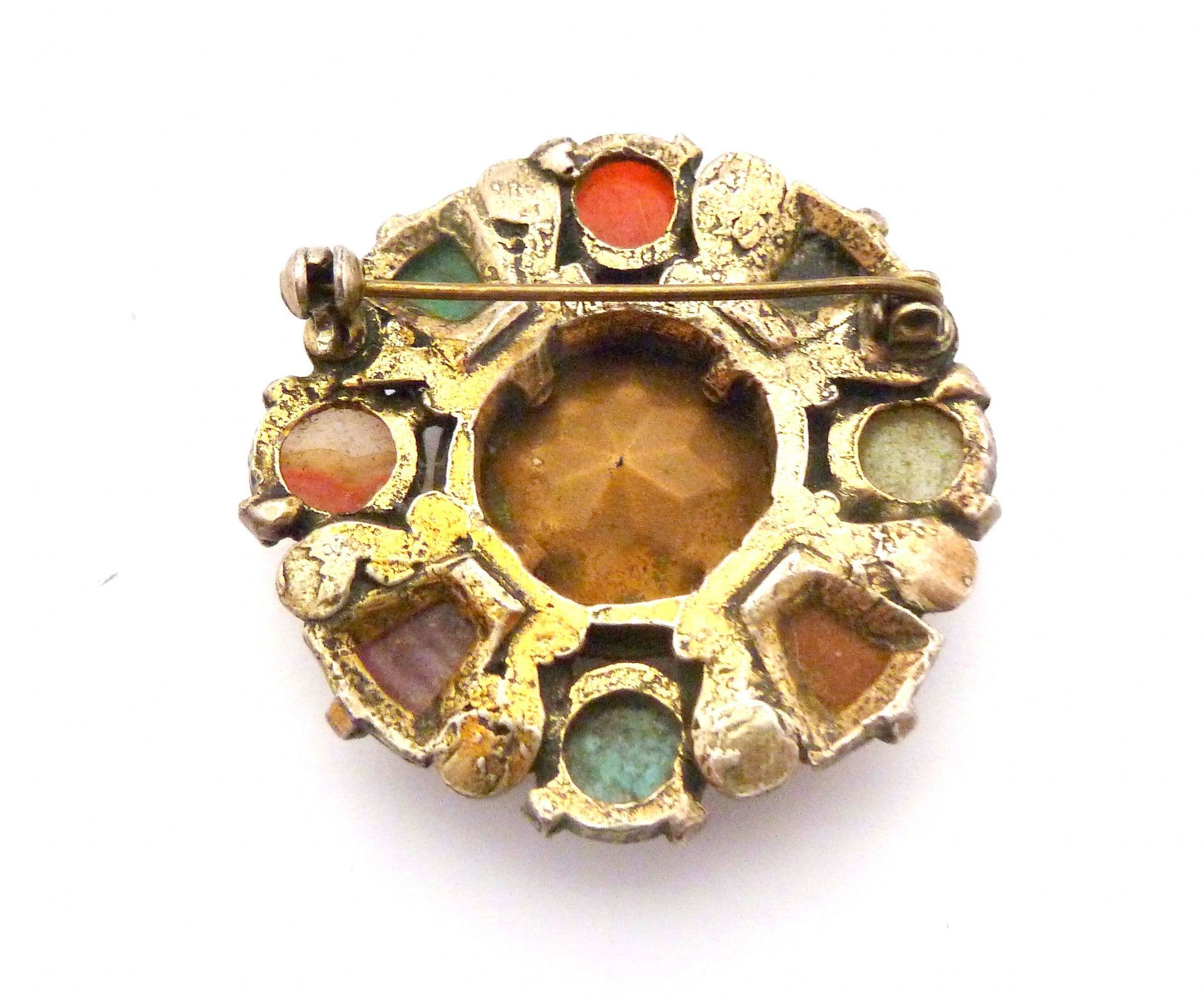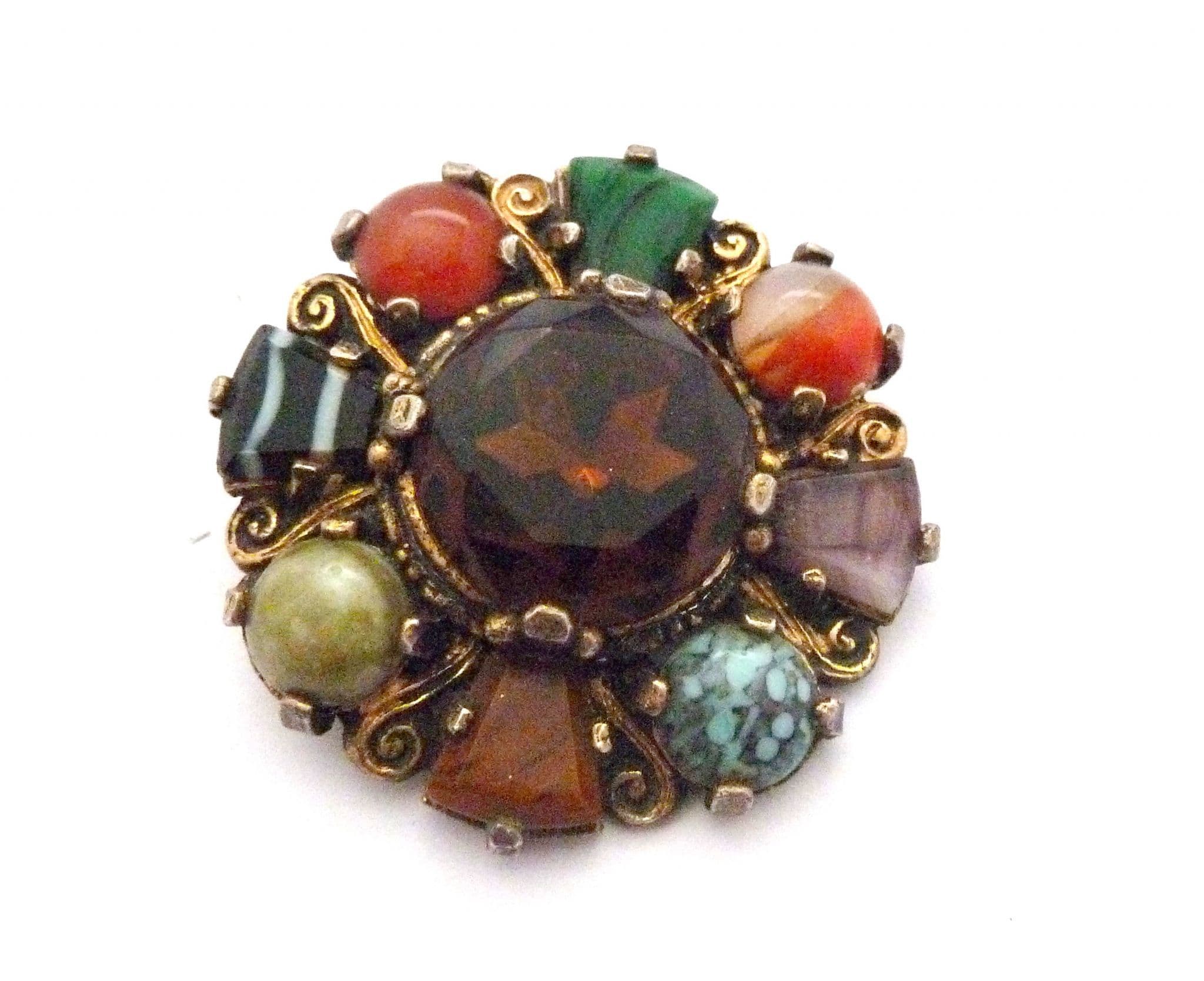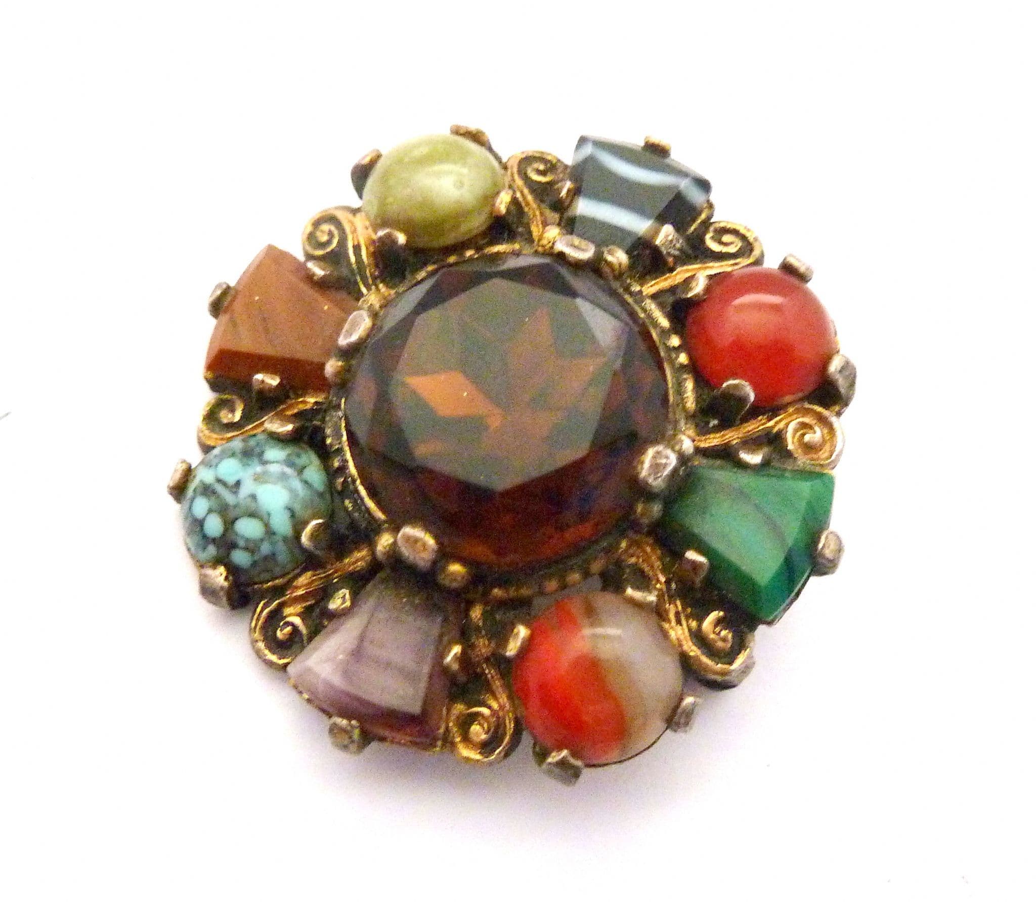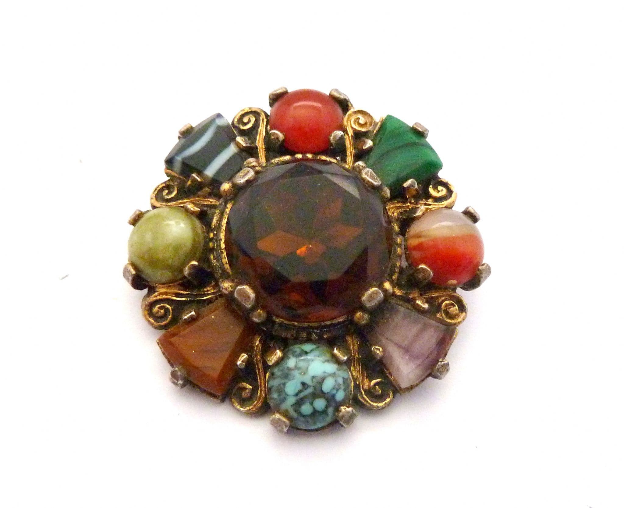 A Celtic Scottish style large brooch manufactured under the trade name Miracle by A Hill and company Ltd. The brooch is fashioned in a circular design with a large central faux Cairngorm rhinestone and is surrounded by, eight mock gemstones, four rounded ones and four rectangular ones, set in gold tone metal. The setting has lovely Celtic style scroll work. Circa 1960's - 70's . Signed Miracle faintly to the back of the brooch.