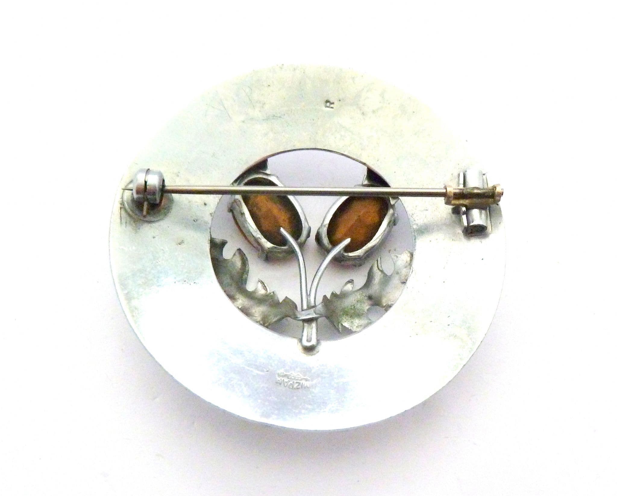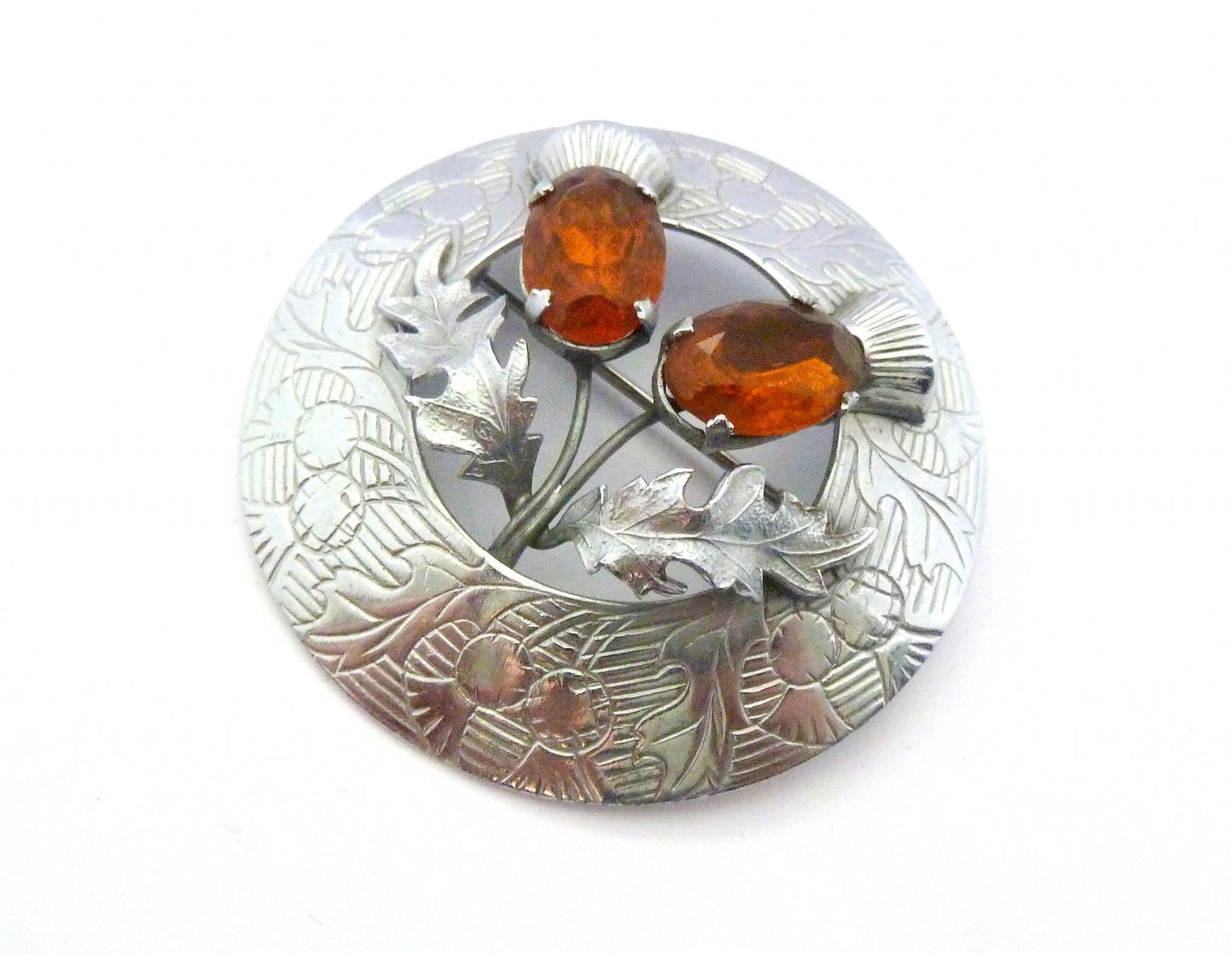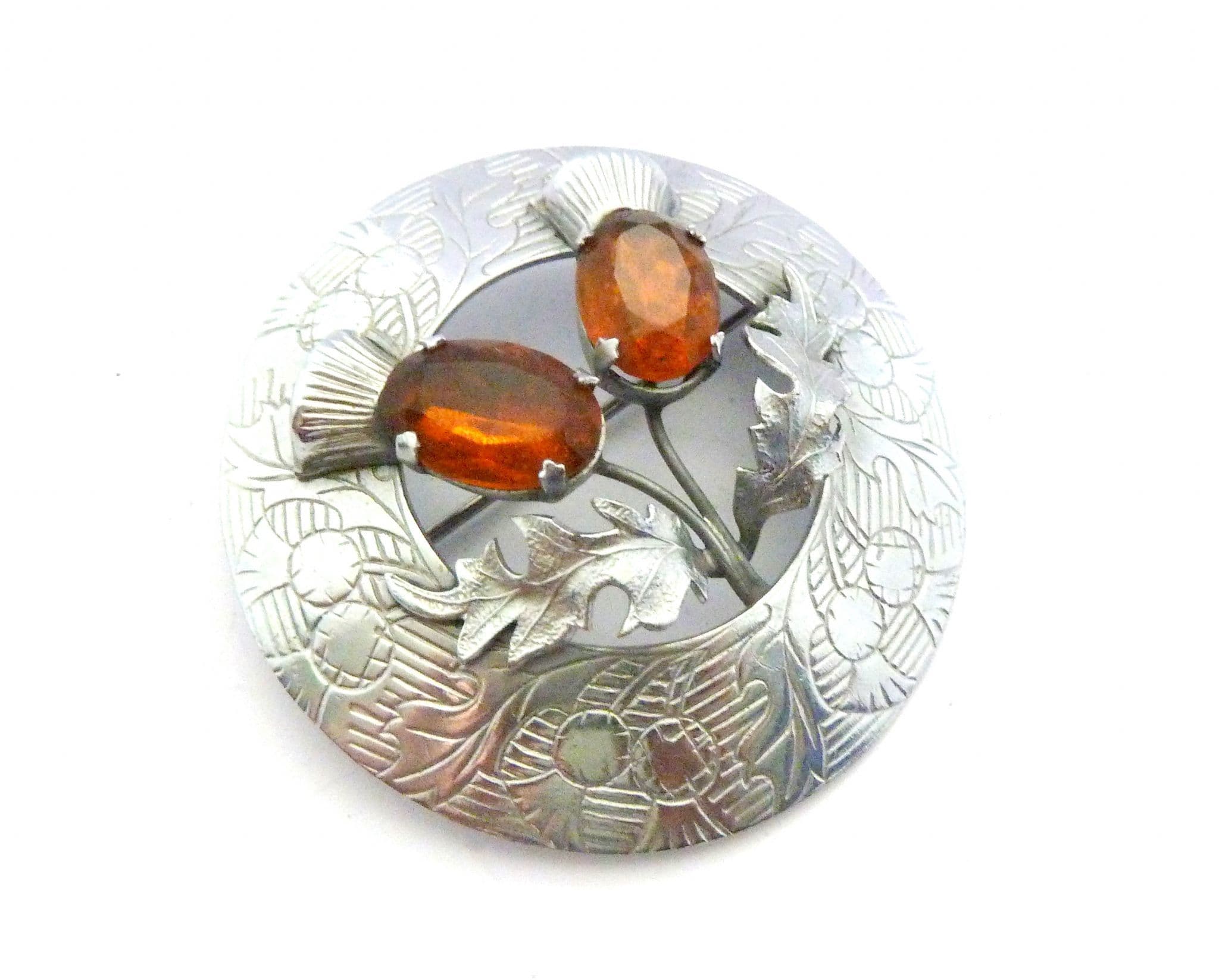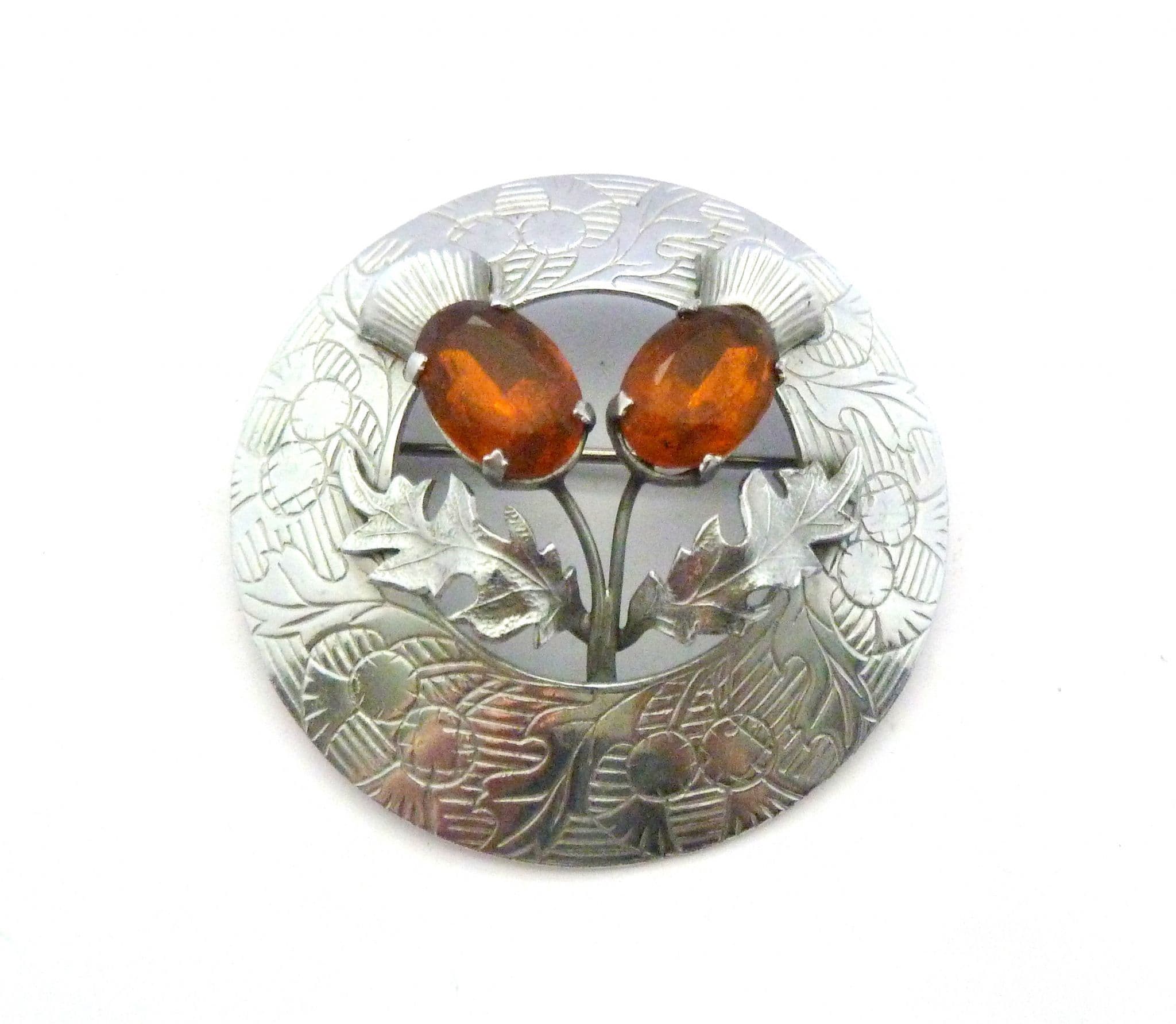 Vintage large Scottish style faux amethyst glass rhinestone set thistle flower design brooch by Mizpah. The brooch is formed from chrome plated metal with a circular shaped design and two thistle flowers with mock citrine glass rhinestones. Secure roll over safety clasp. Circa 1950's