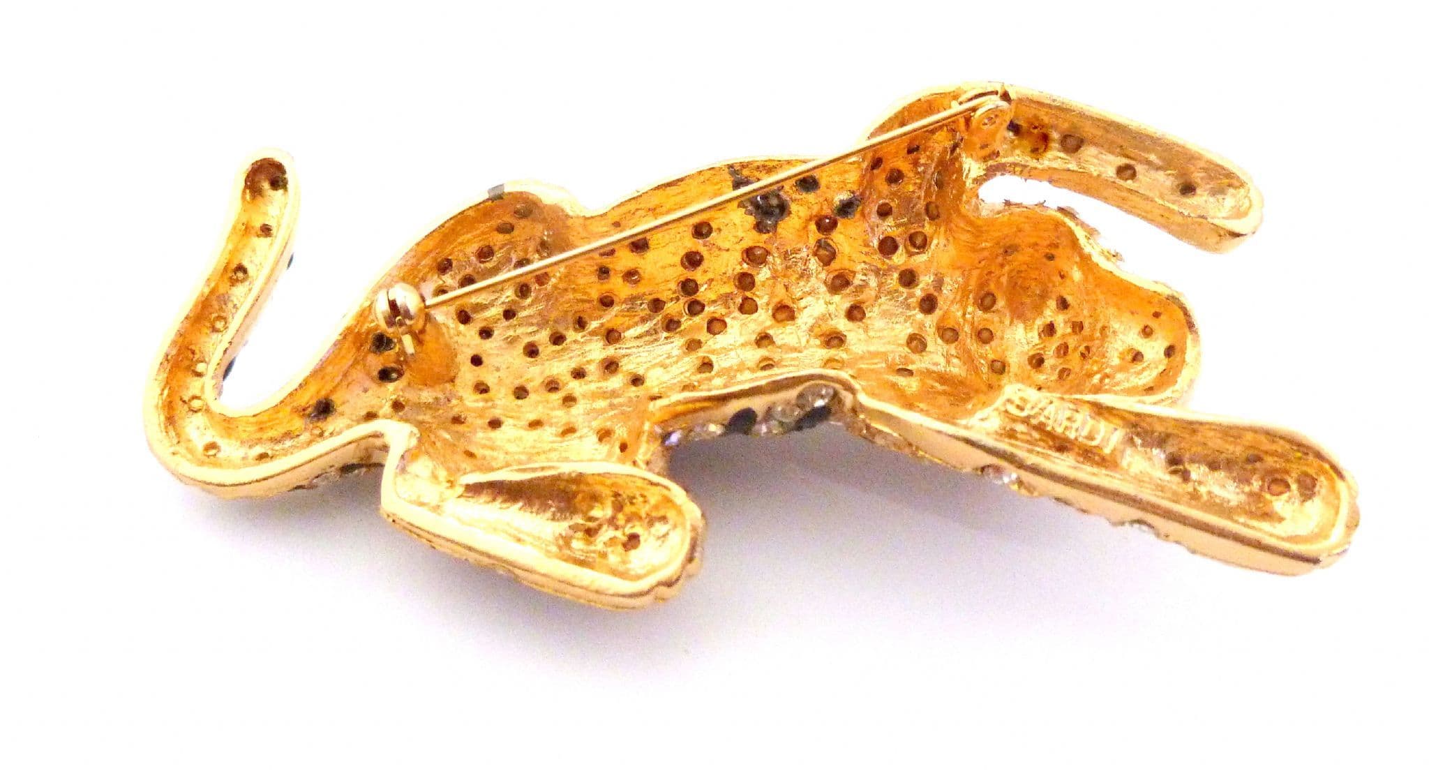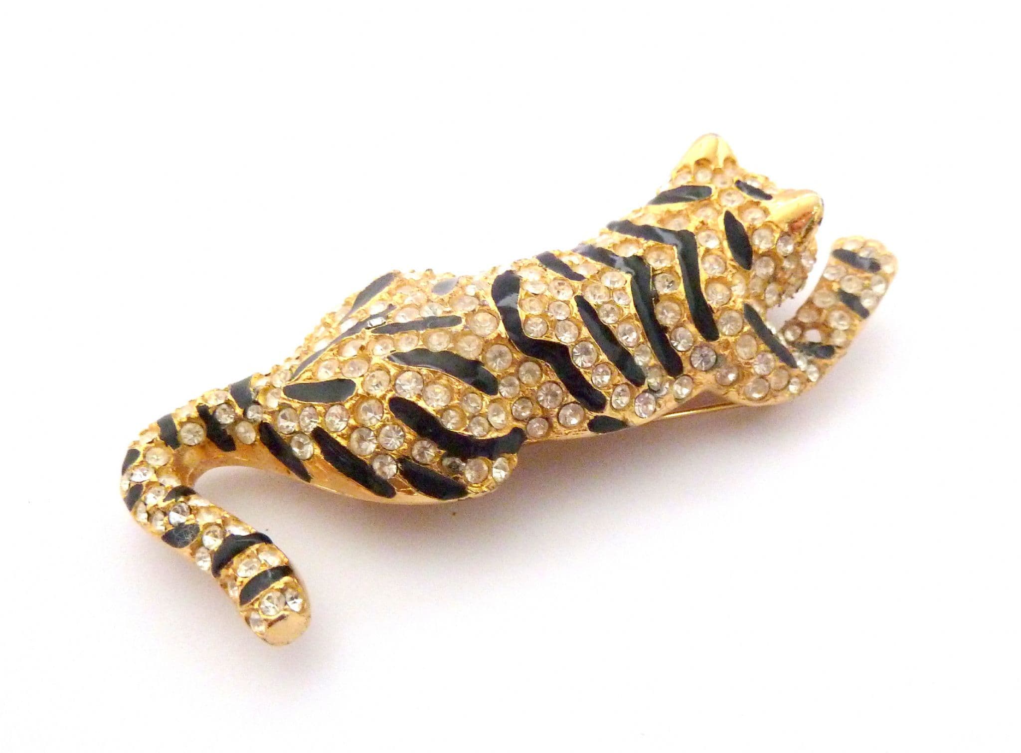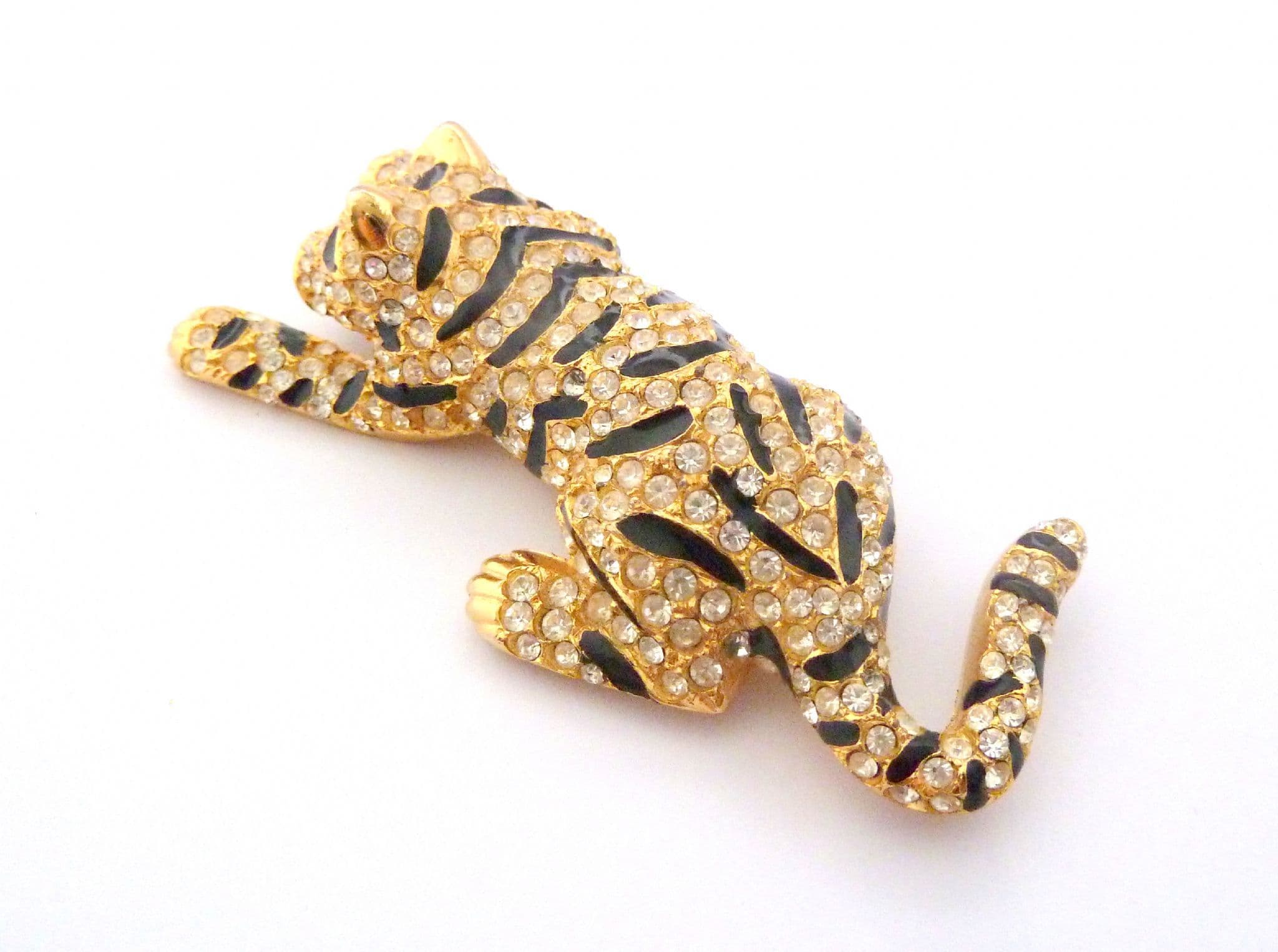 A vintage large enamel and rhinestone tiger big cat design brooch by Sardi. The brooch is formed from gold tone metal in a large 3D design of a tiger with clear rhinestone and enamel detailing . Circa late 1980's - 90's.