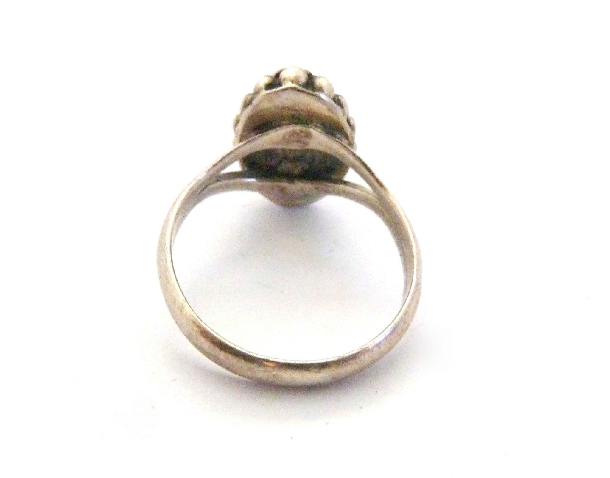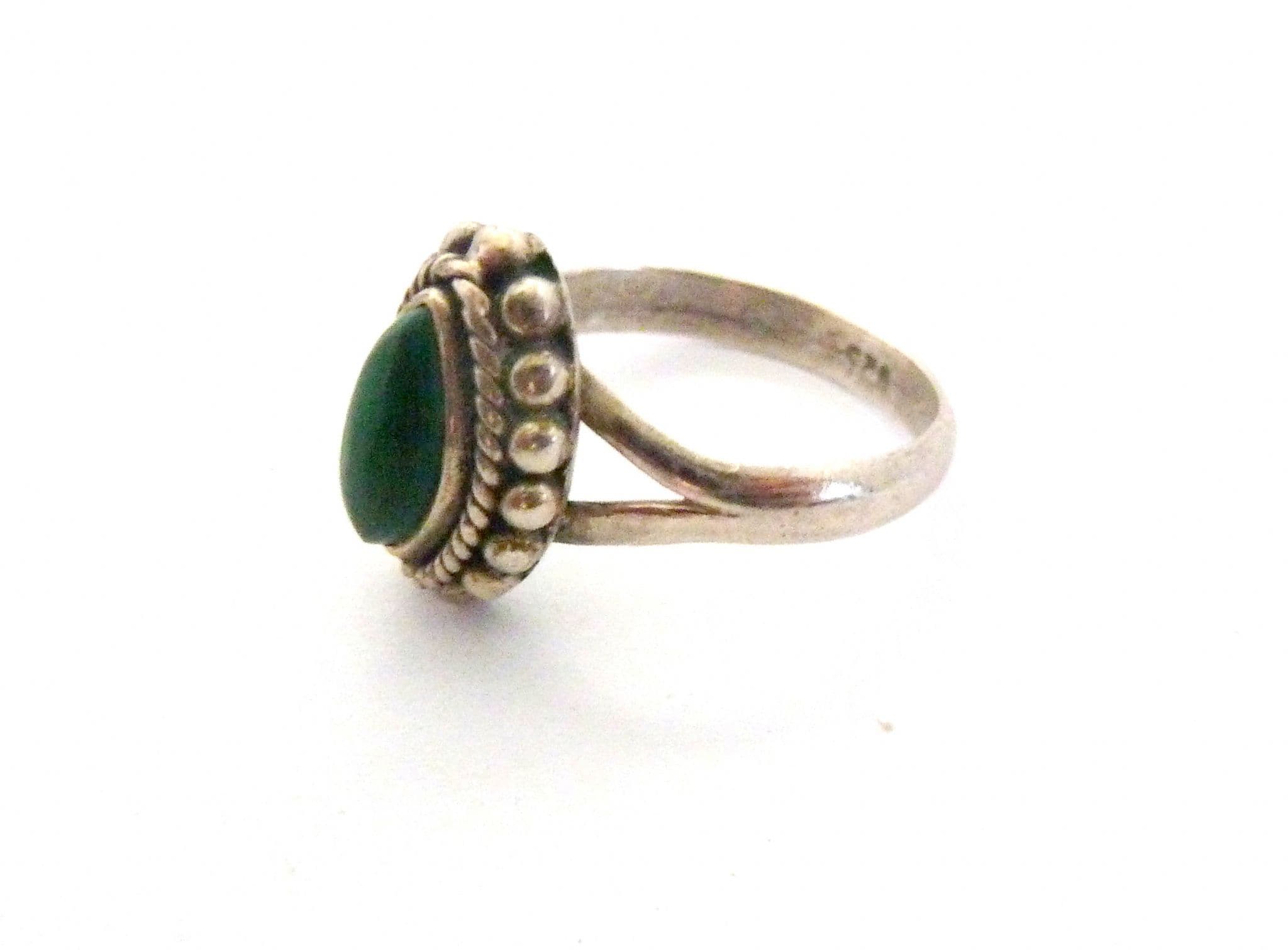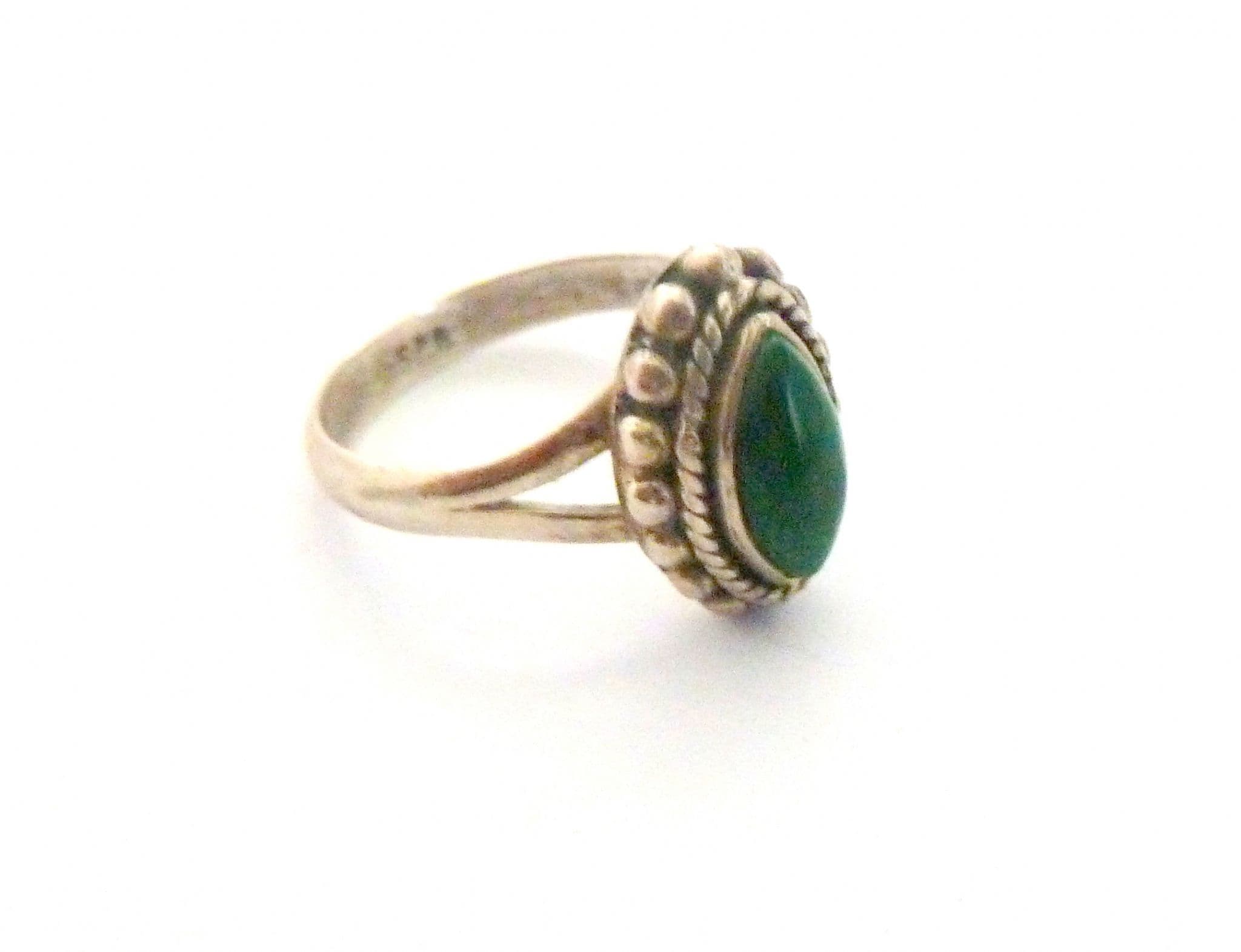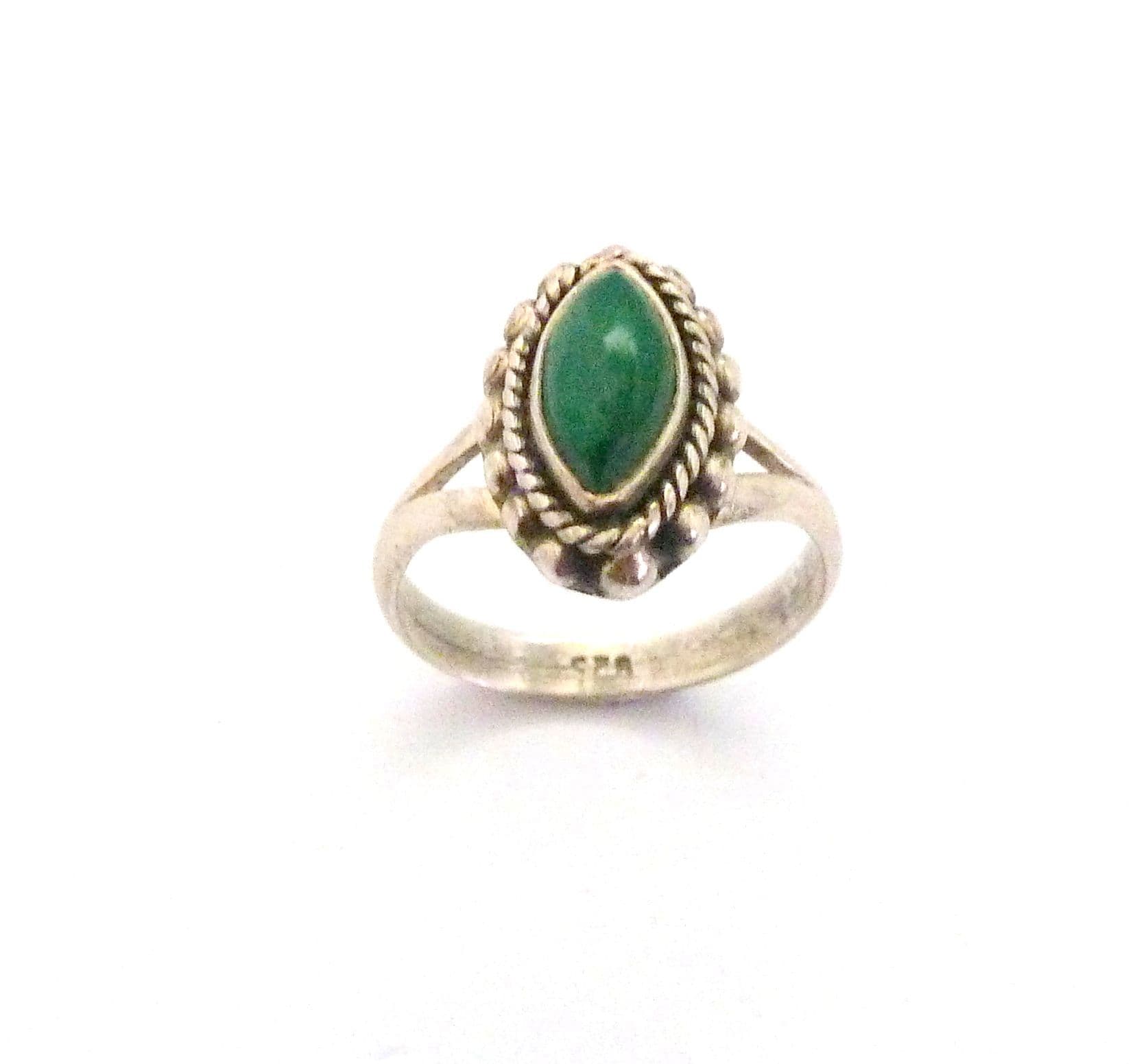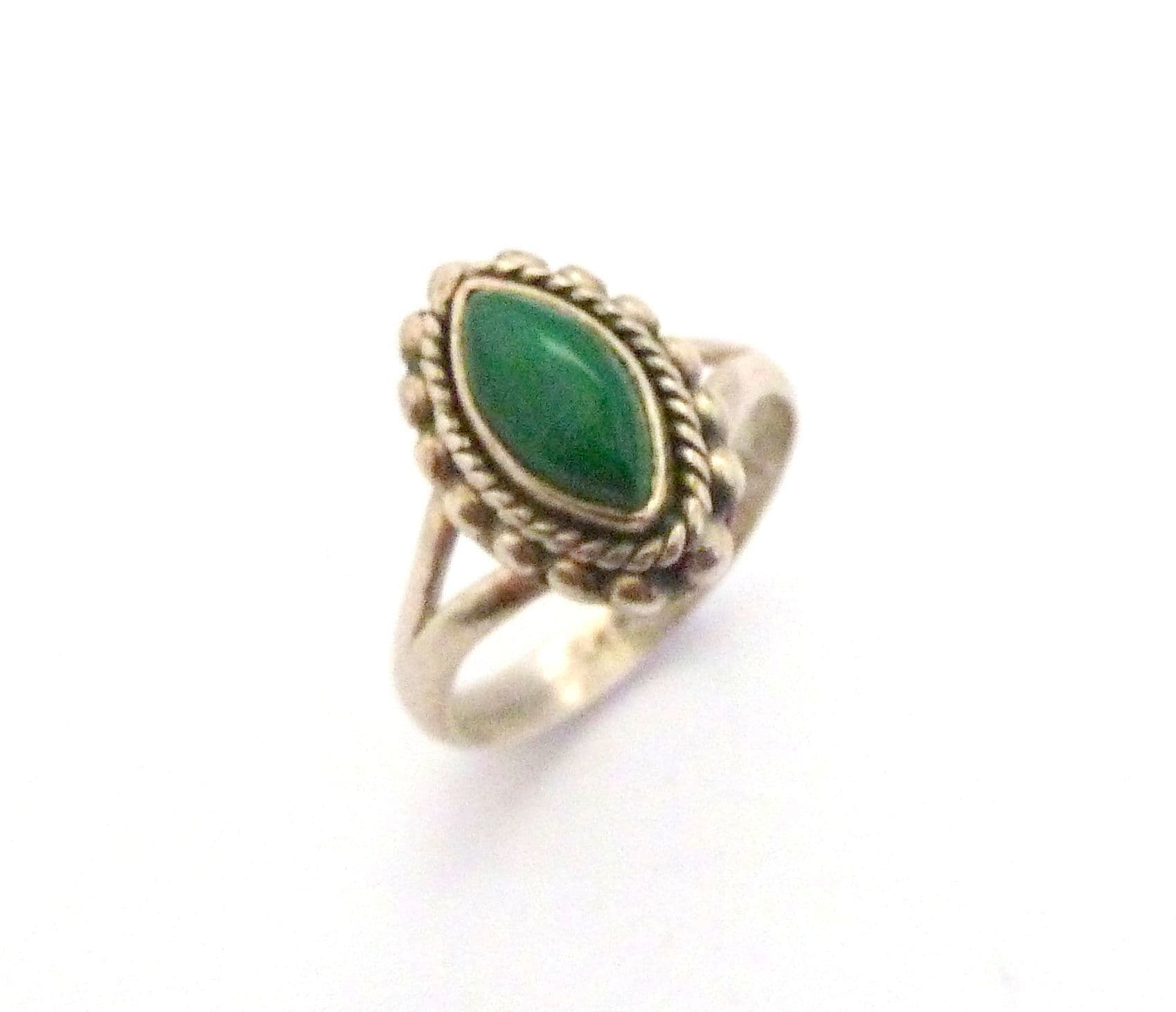 A malachite gemstone set boho style sterling silver ring The ring is stamped 925 to the inside of the band . The central design is in a marquise shape. It is suitable for a UK size N, US size 6 3/4.
