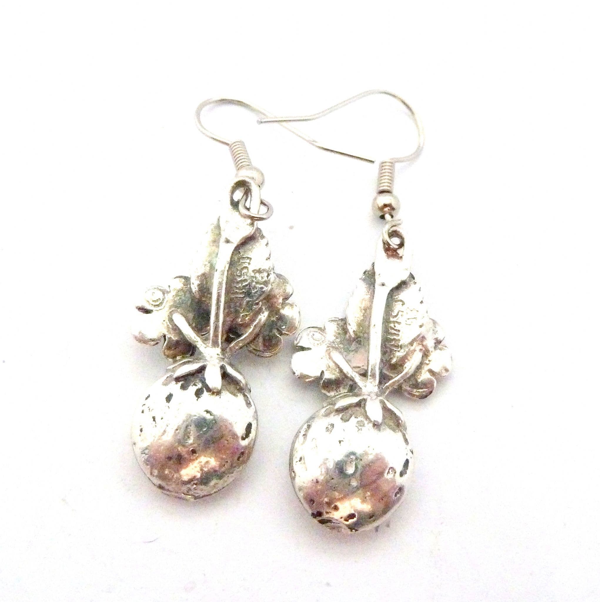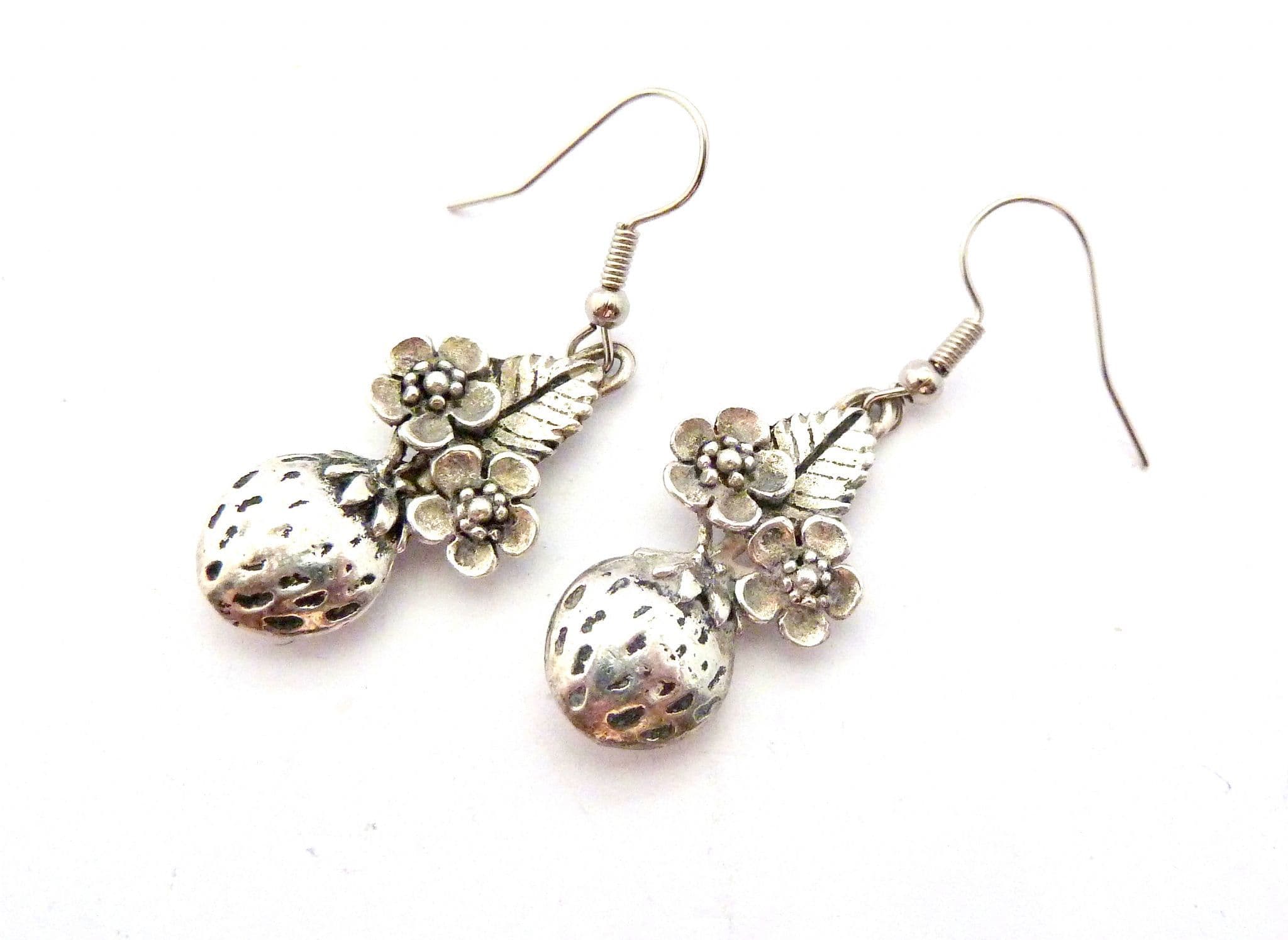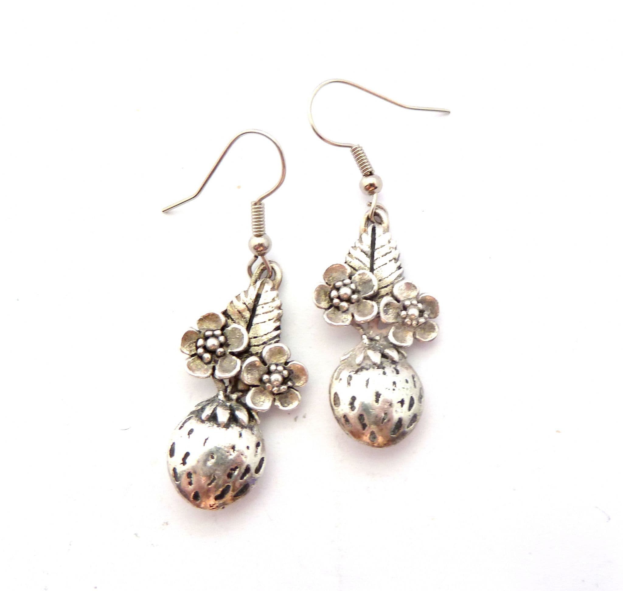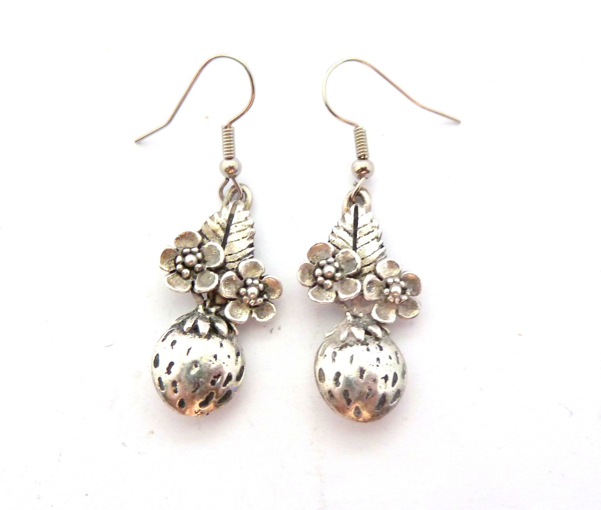 Vintage silver plated pewter strawberry and flower design drop earrings by MasJ. Each earrings is formed from silver plated pewter in a flower leaf and strawberry fruit drop design. Suitable for pierced ears with fish hook backs. Stamped MasJ 93 with copyright symbol to the backs. Circa 1993