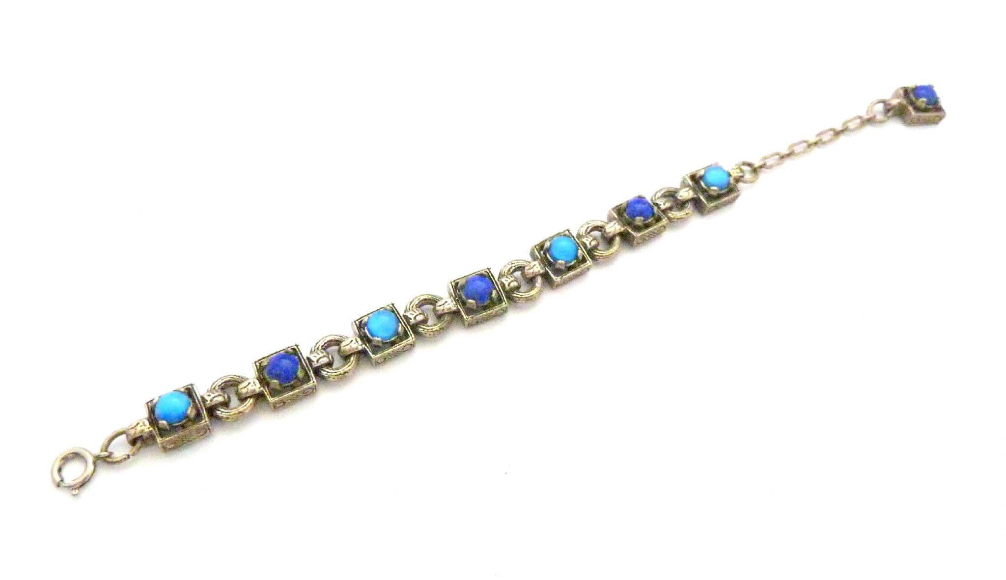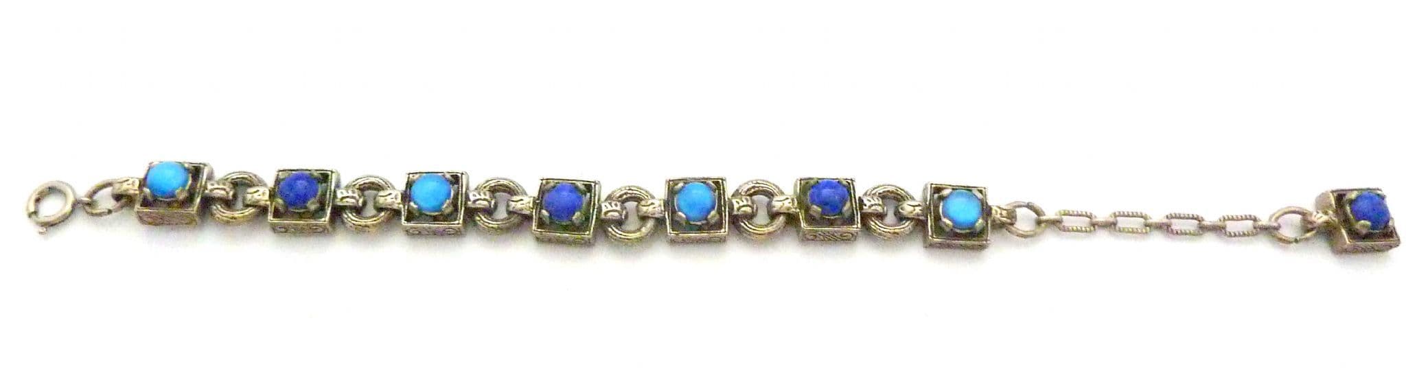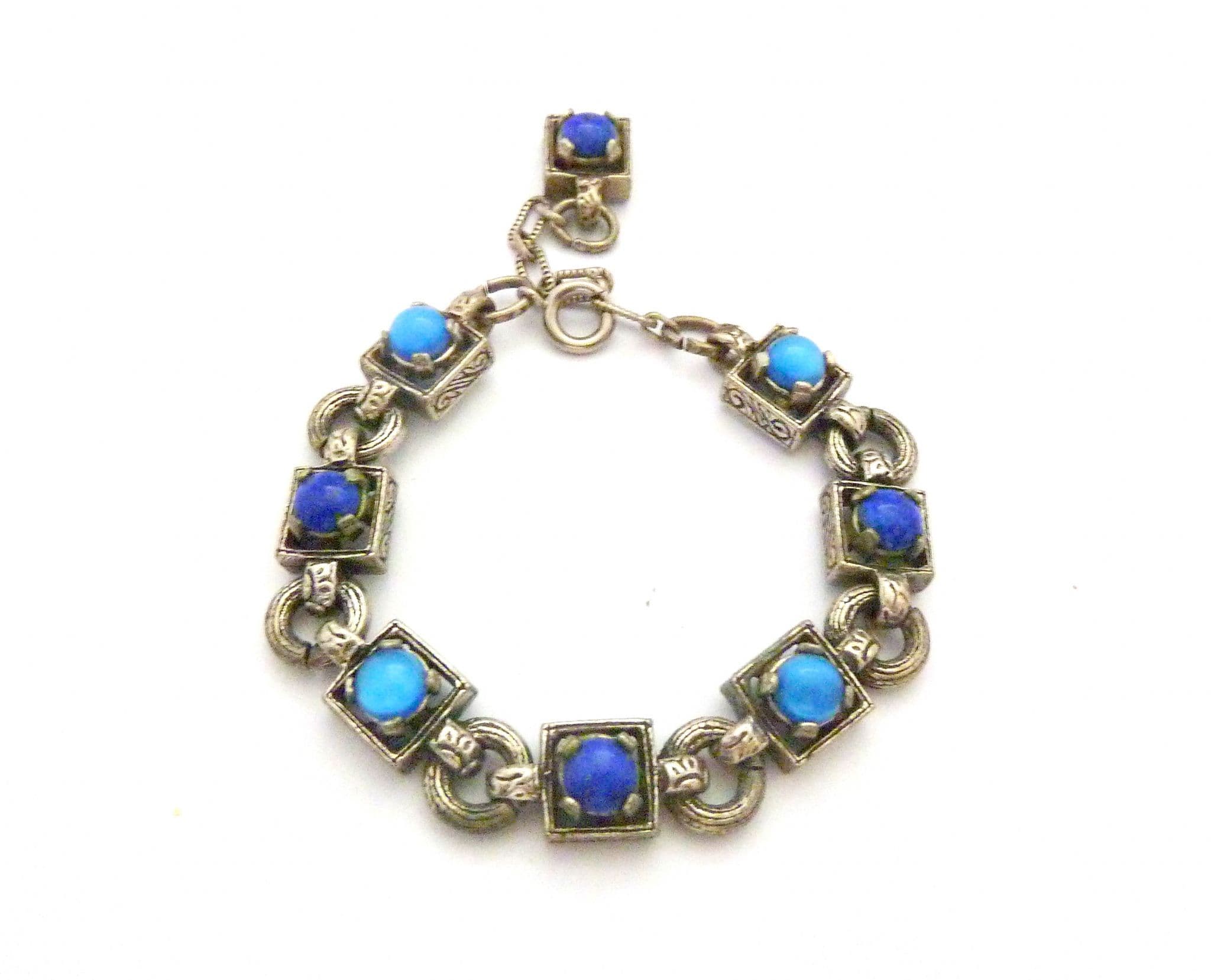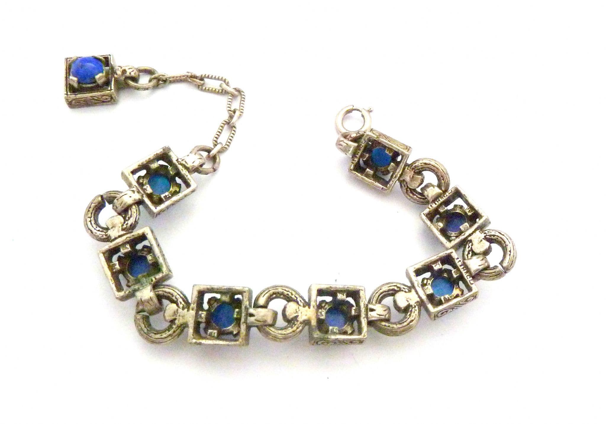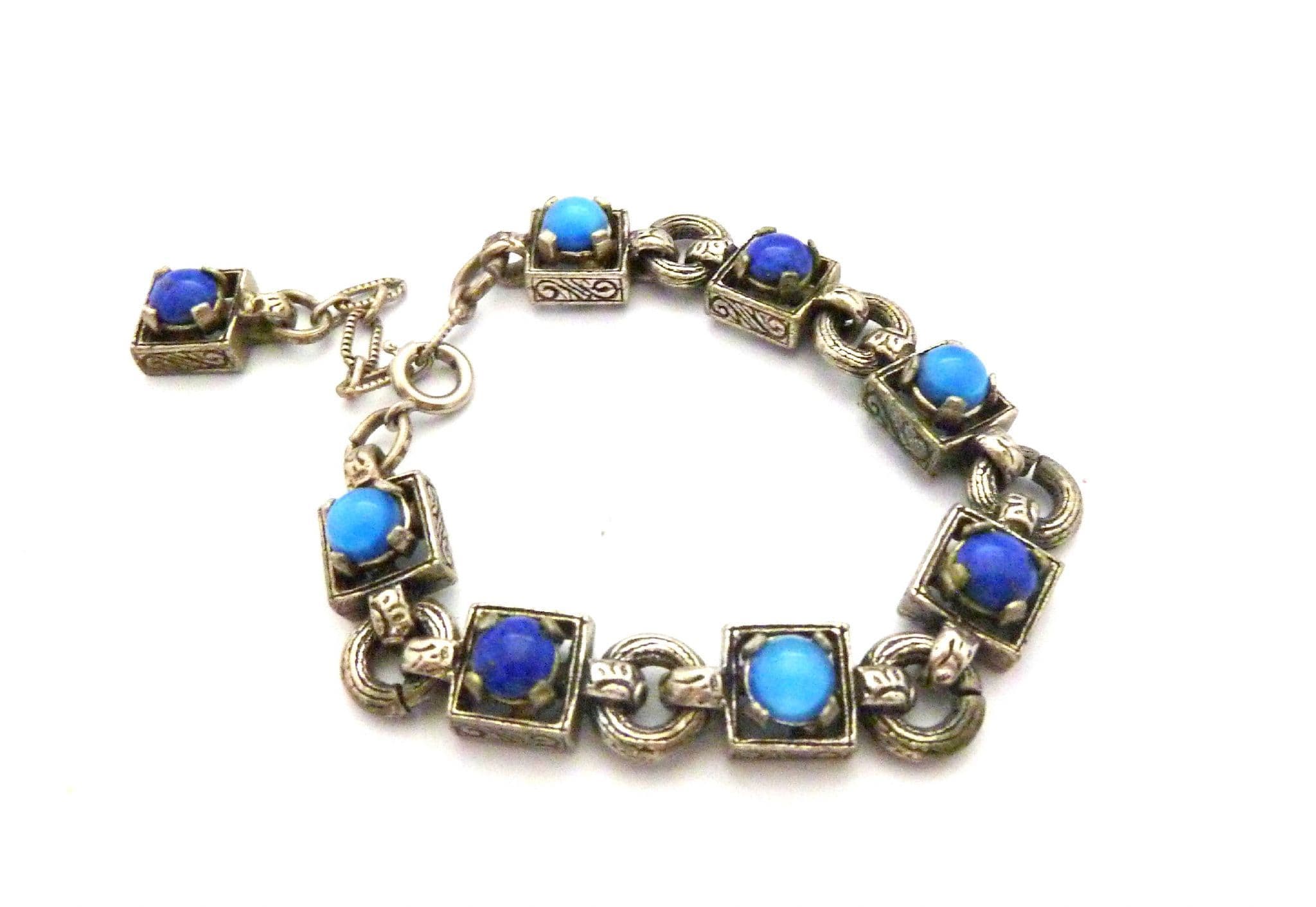 A Vintage medieval Celtic style, mock gemstone panel bracelet by Miracle. The bracelet is formed from silver tone metal set with mock lapis lazuli and blue glass cabochons. Fastens with a adjustable length spring ring clasp, complete with ornate drop toggle. Circa 1980's.