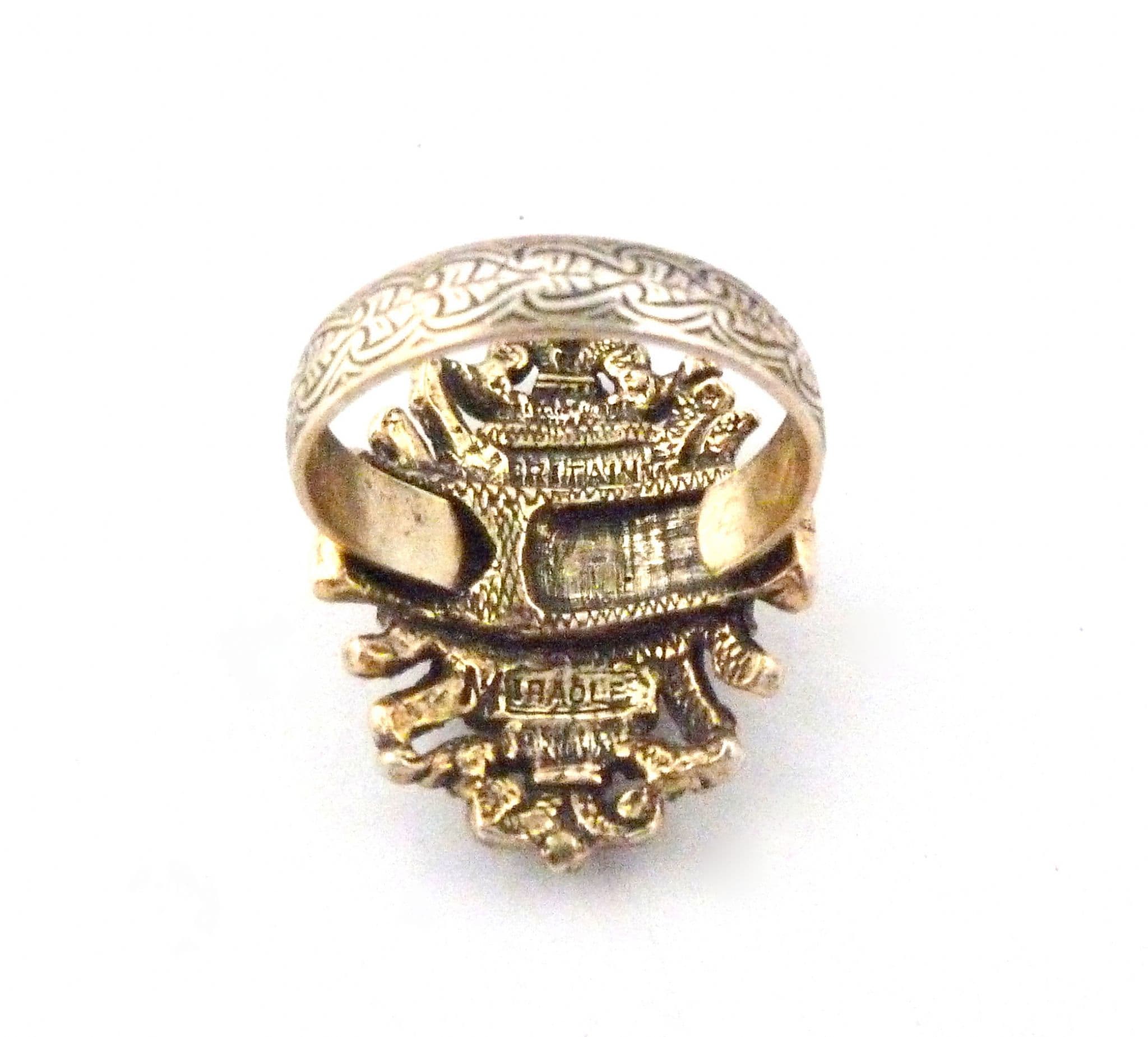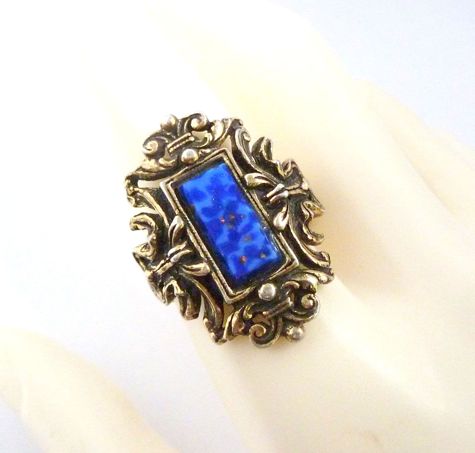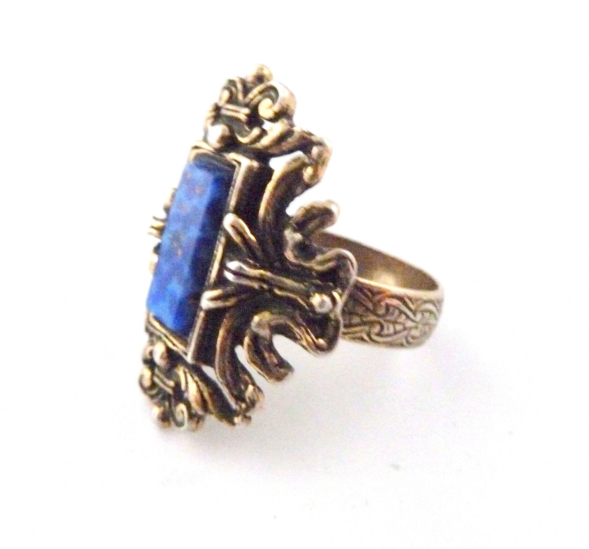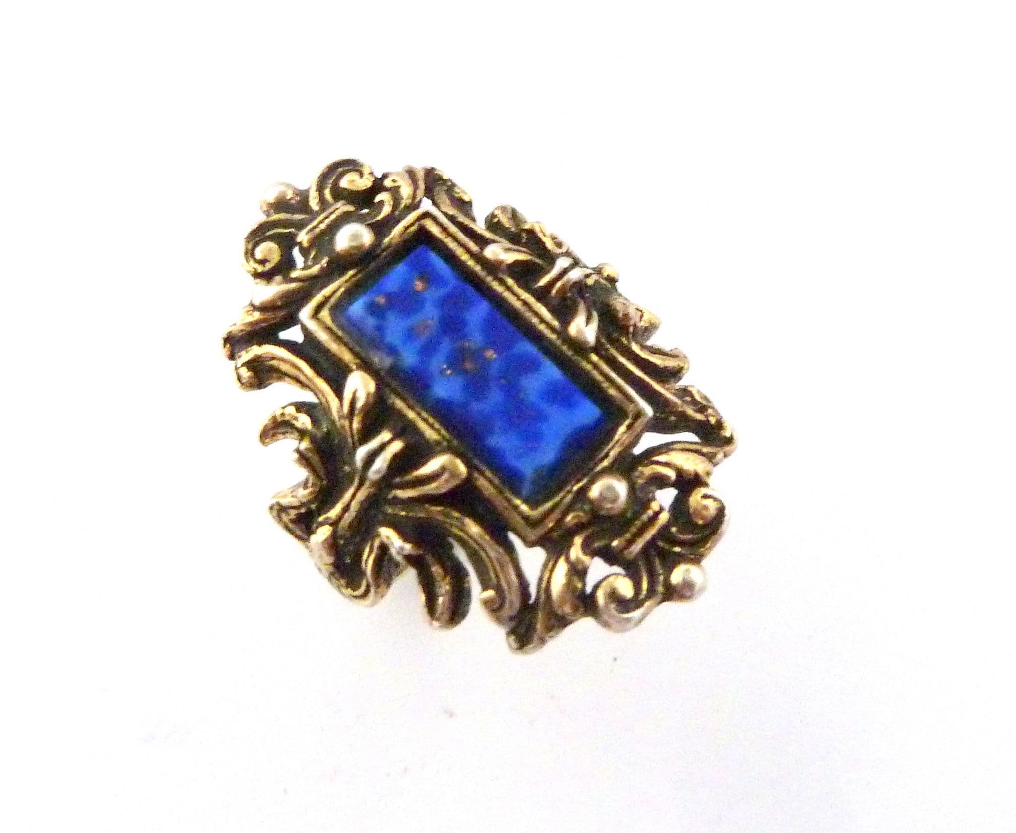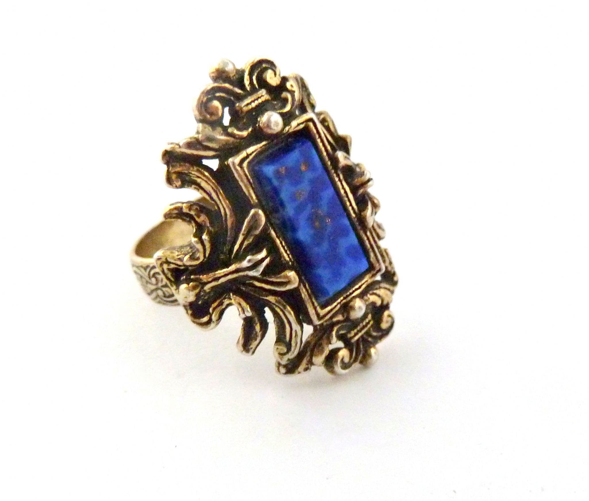 Vintage large faux lapis lazuli set adjustable size statement ring by Miracle. Formed from a large baguette shaped faux lapis lazuli glass, set in an large ornate gold tone metal, old English style surround with Fleur De Lis detailing and etched band. Circa 1960's - 70's.
