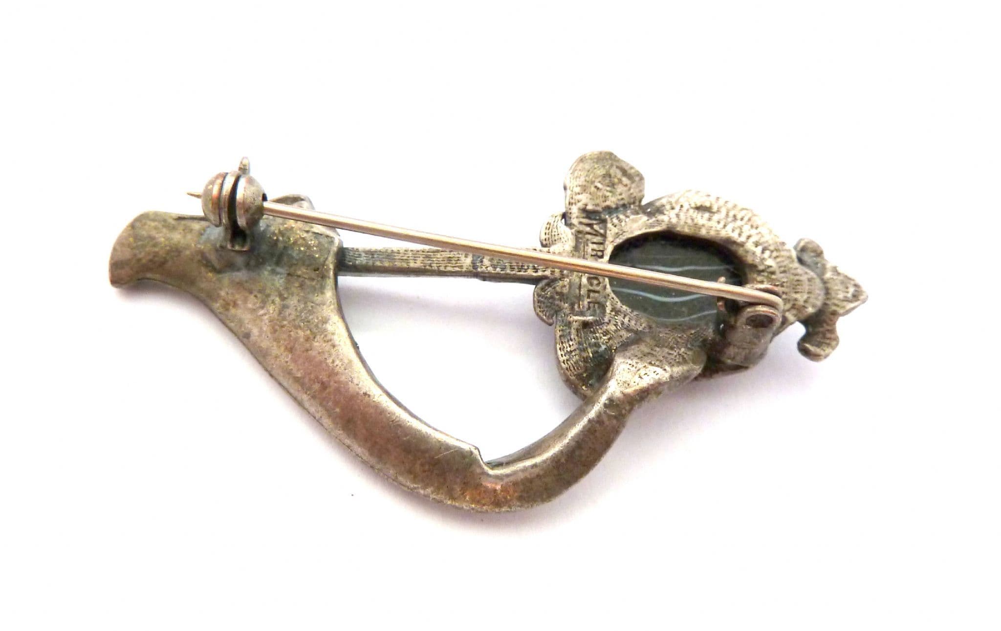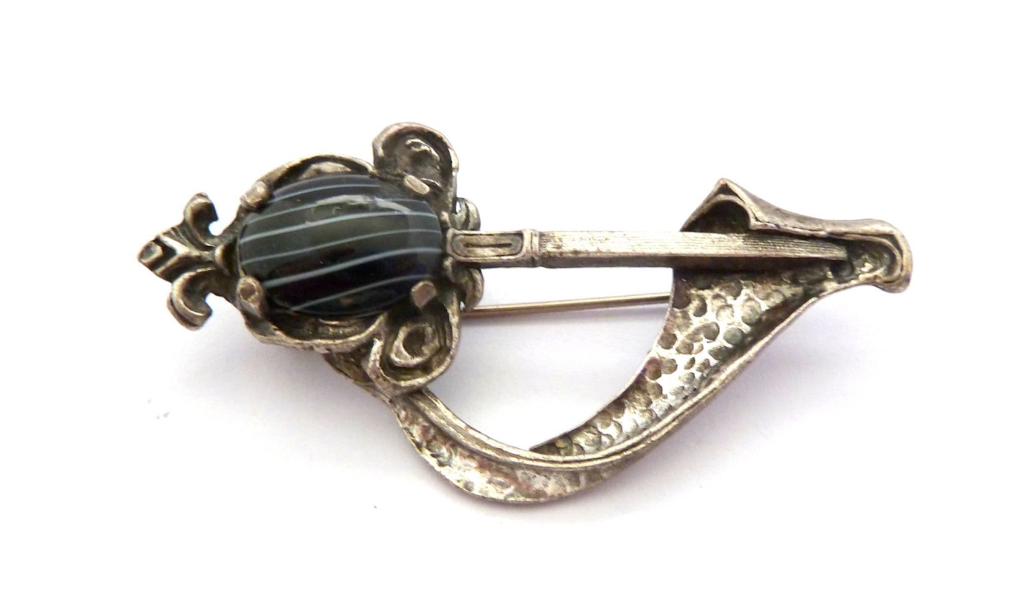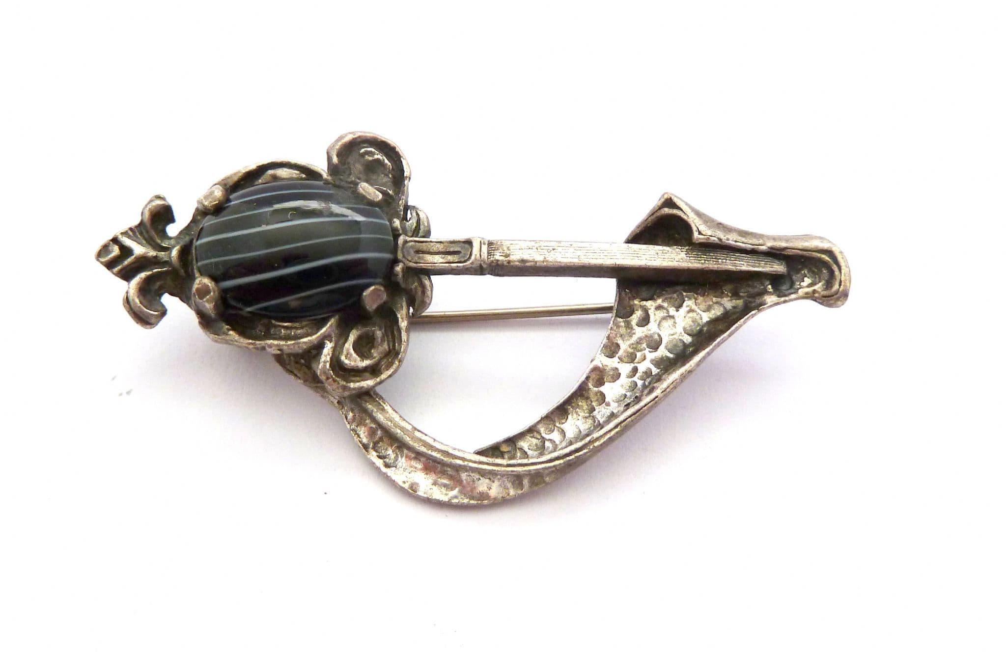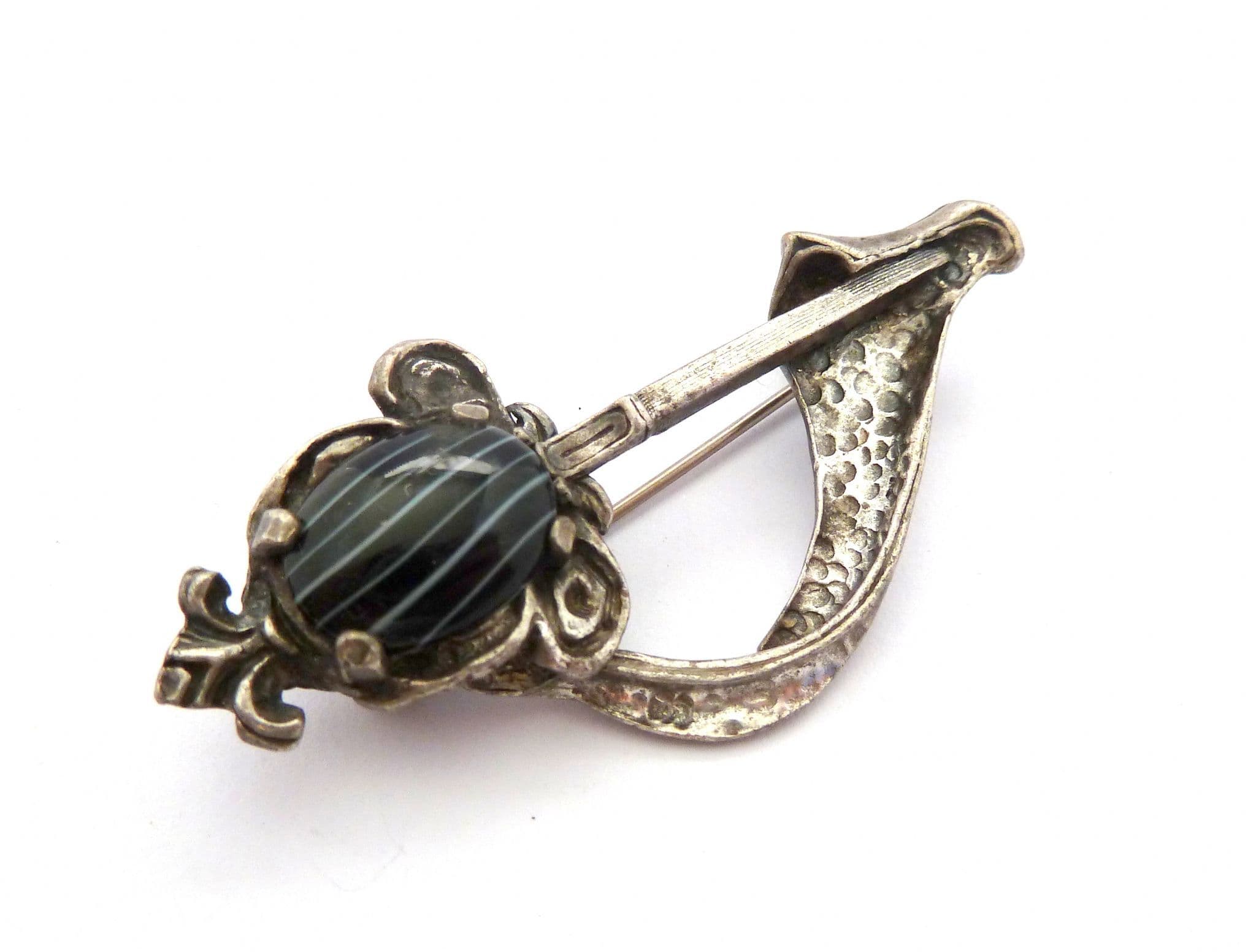 Vintage Scottish Celtic style Sword and sash brooch manufactured under the trade name Miracle by A Hill and company Ltd. The brooch has a large marbled faux agate stone set in a sword or dagger, with a draped sash, formed from silver tone metal. Circa 1960's - 1970's. Signed Miracle to the back of the brooch.