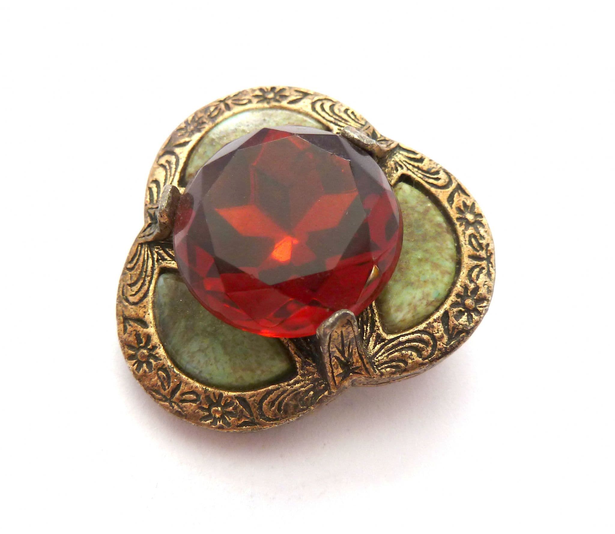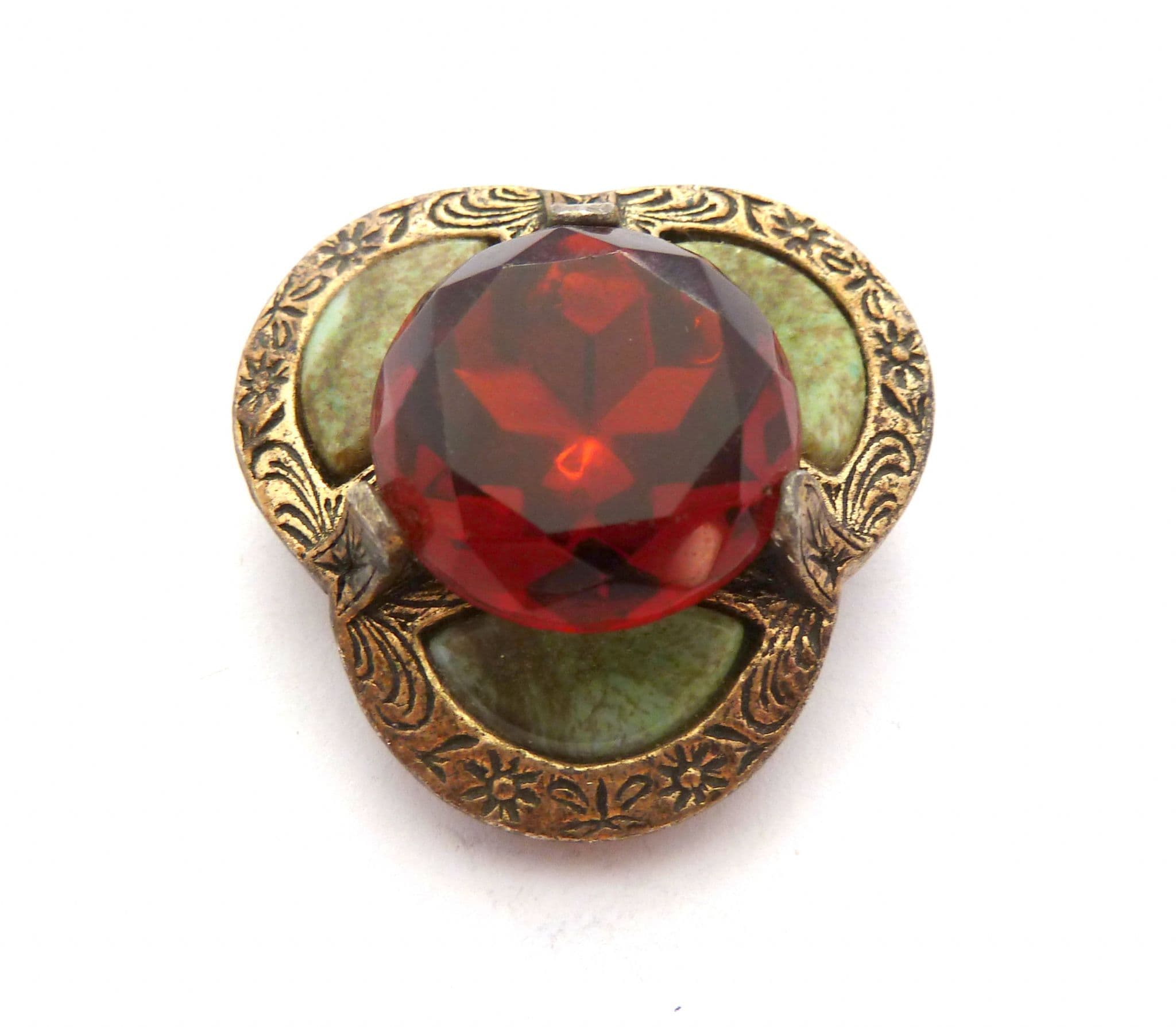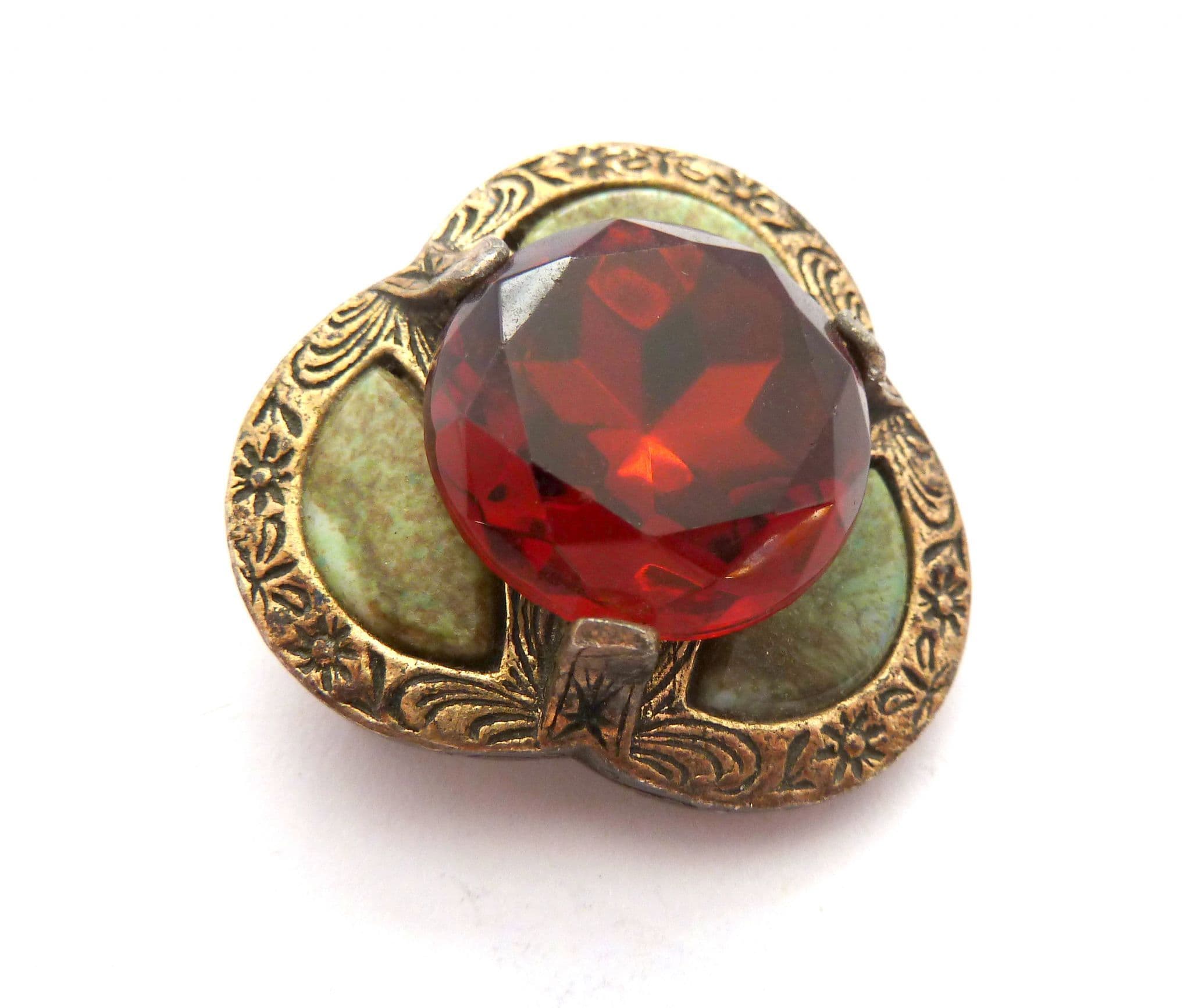 The brooch is fashioned in a trefoil design with a large central faux cairngorm rhinestone and is surrounded by, three faux Connemara marble slices, set in silver tone metal. The setting has lovely Celtic style scroll work, with ornate floral detailing. Circa 1960's - 70's .