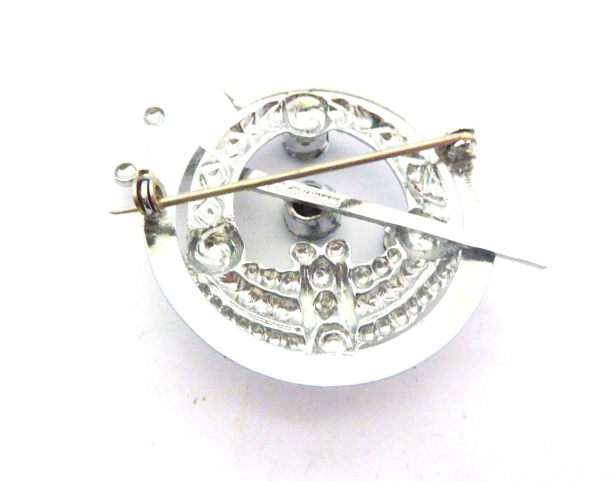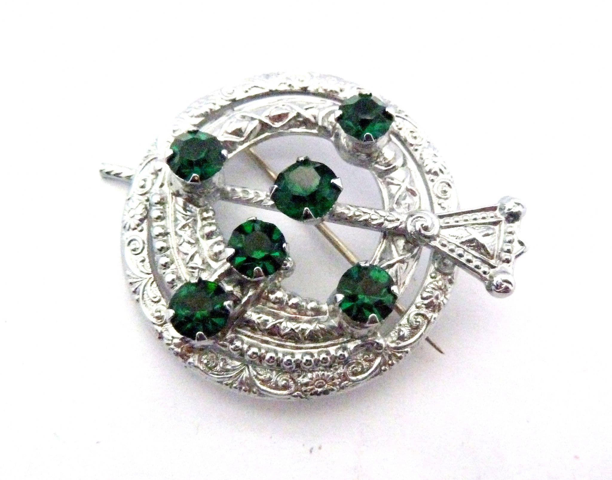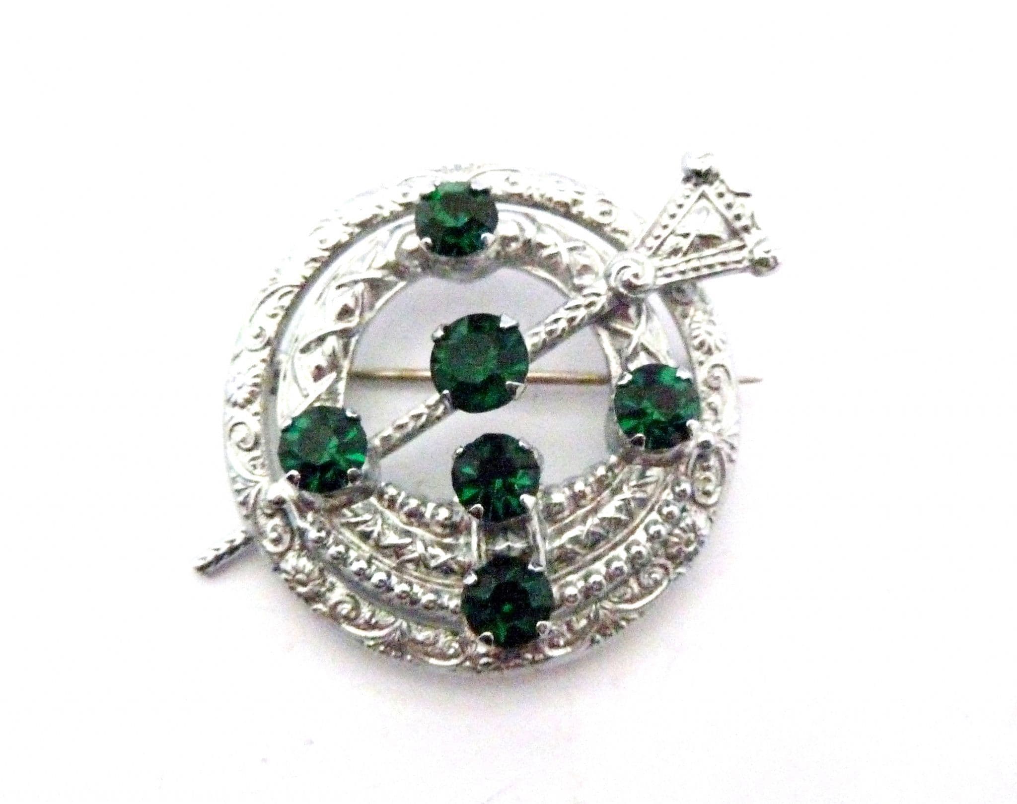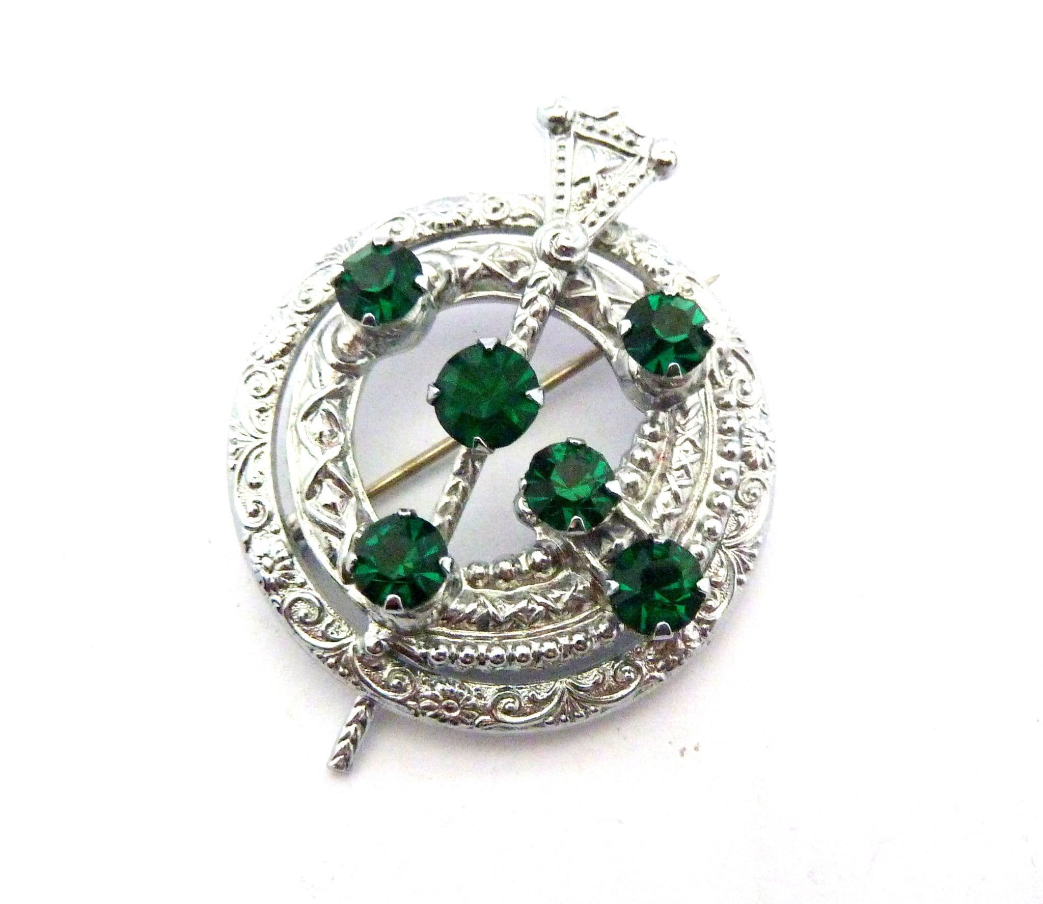 Vintage penannular style brooch set with emerald green glass rhinestones by mizpah. The brooch is formed from chrome plated metal, in an penannular design with emerald green rhinestone detailing. Circa 1950's. Signed Mizpah to the back of the brooch.