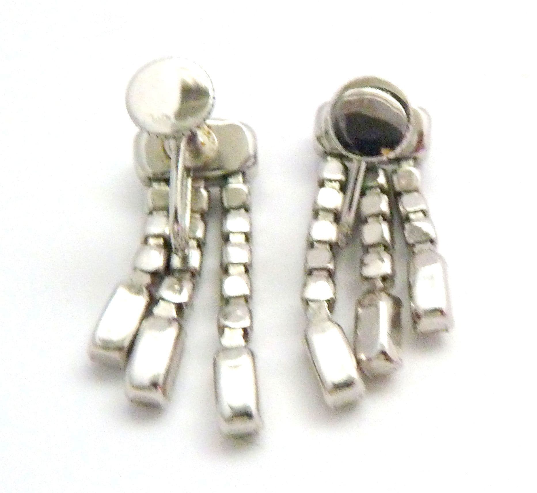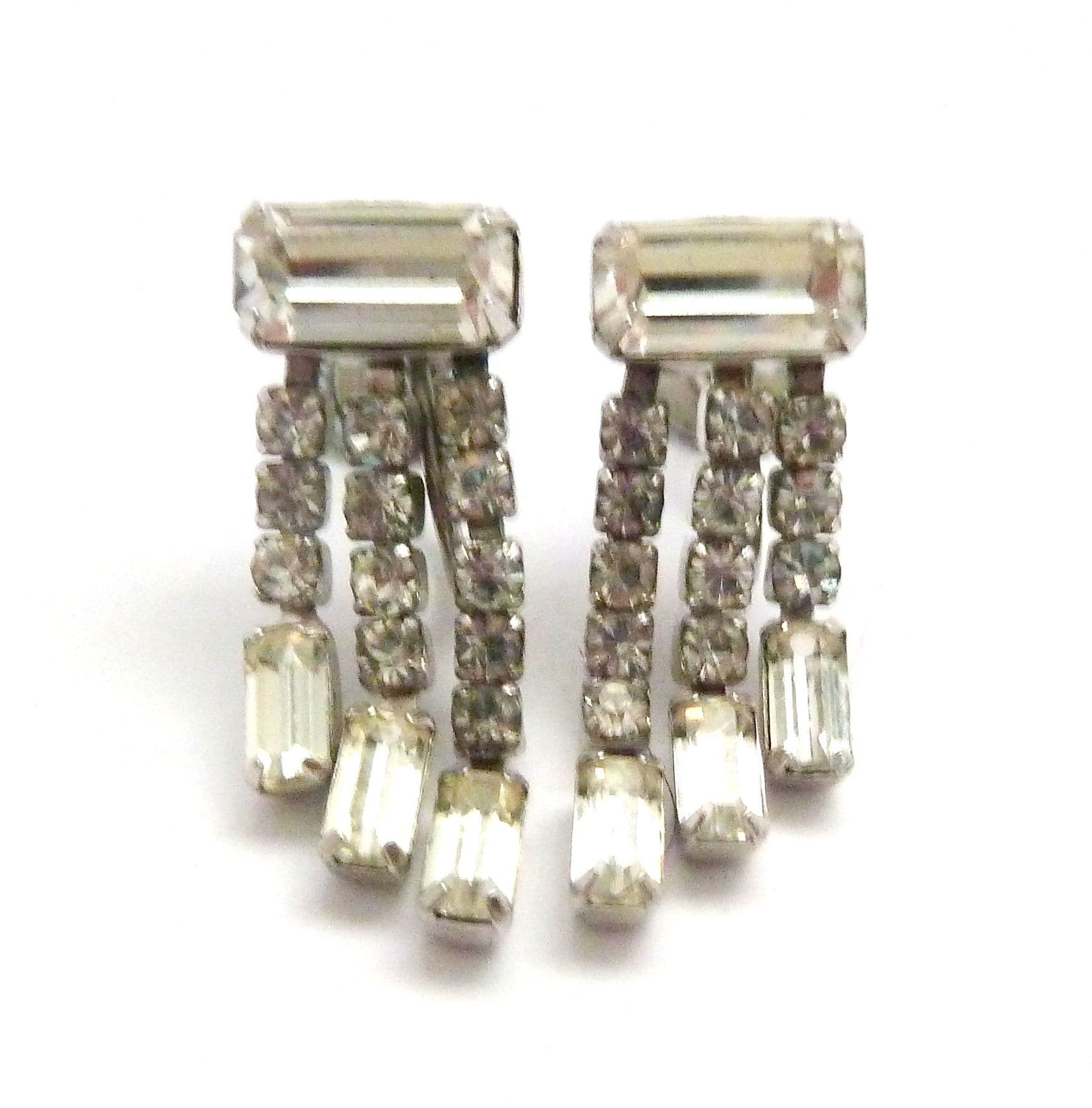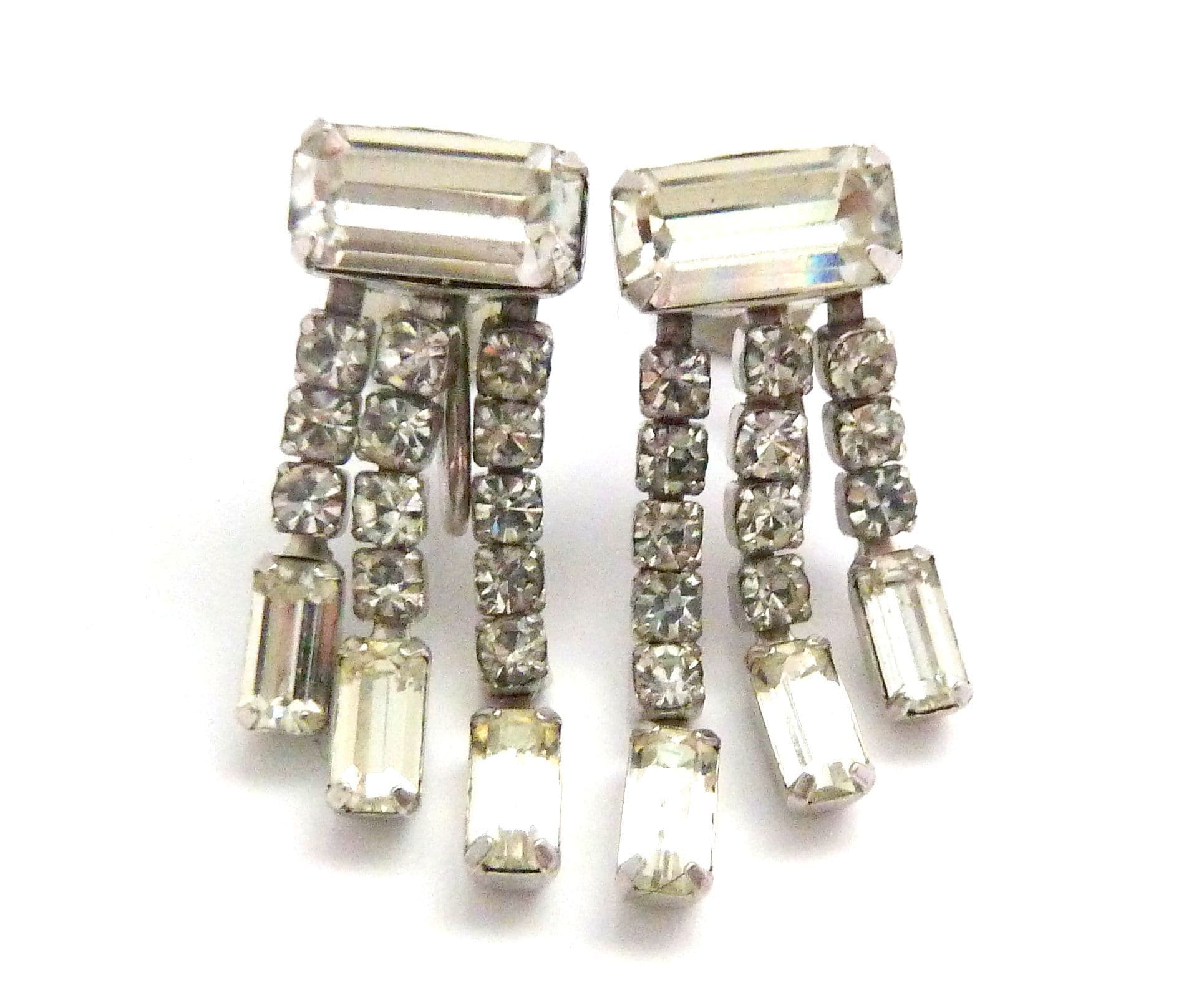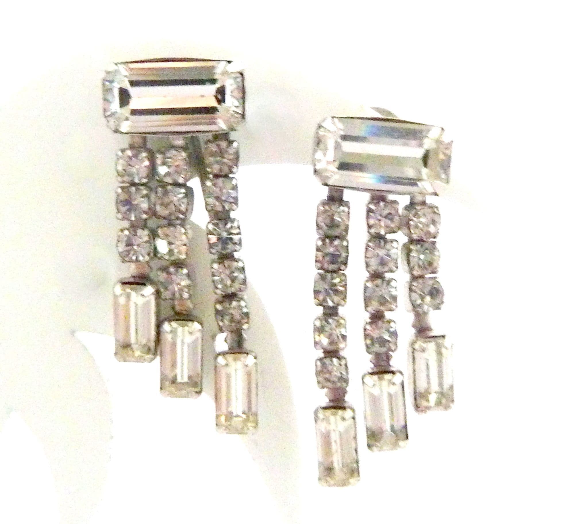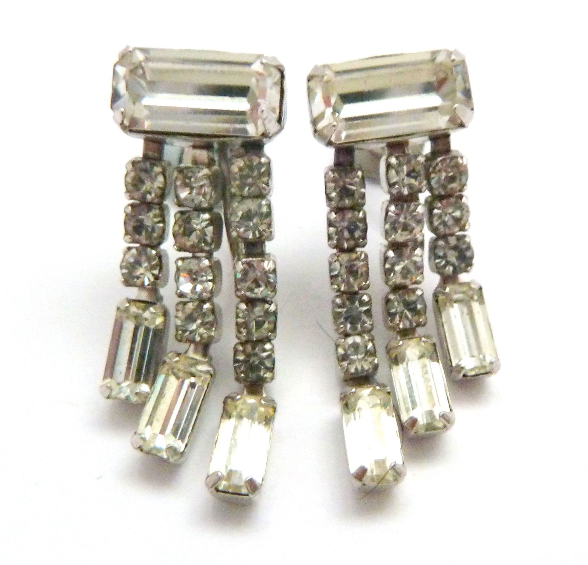 Vintage clear rhinestone set triple drop design screw back earrings. Formed from silver tone metal set with clear rhinestones in a graduated triple drop design. Circa 1950's - 60's.