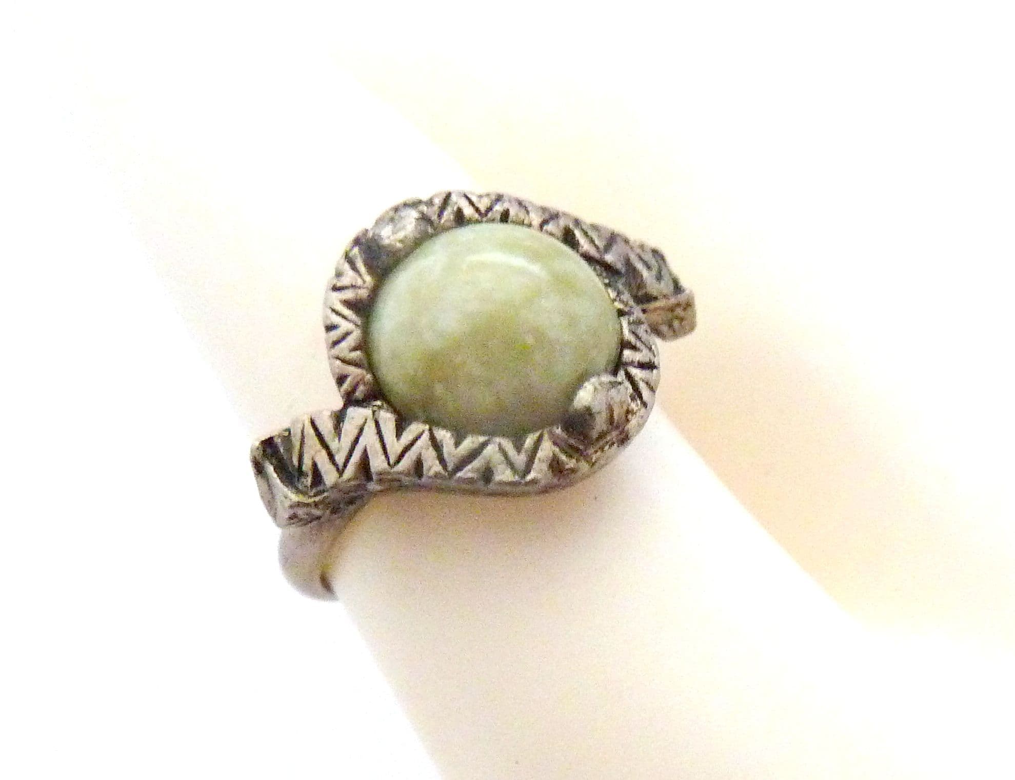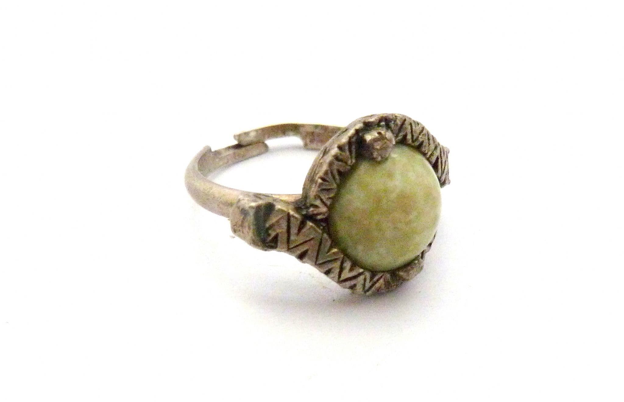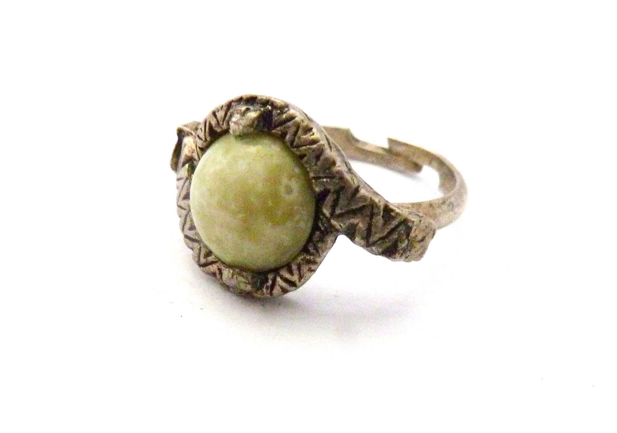 Vintage Scottish Celtic cross Style faux Connemara marble set adjustable size ring. Formed from silver tone metal set with a faux Connemara marble glass cabochon set in textured silver tone metal with an adjustable size band. Circa 1970's - 80's.