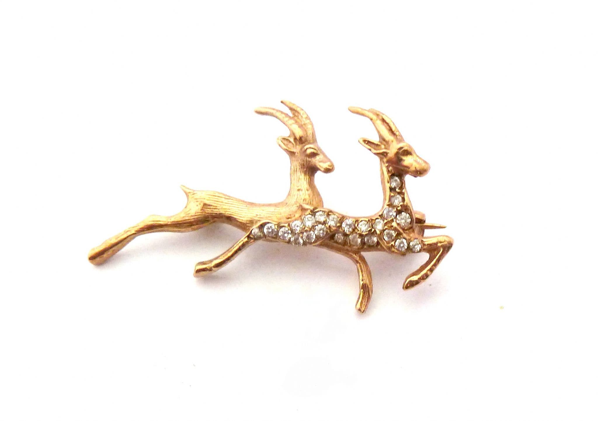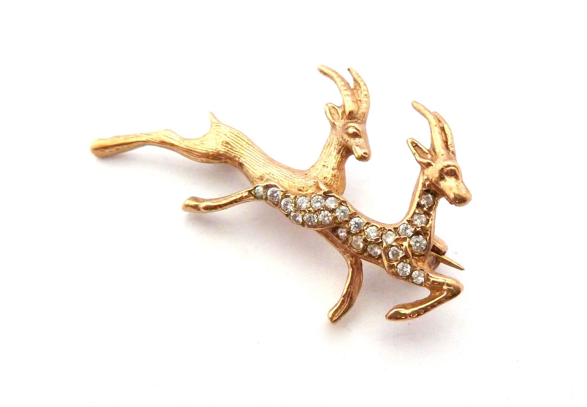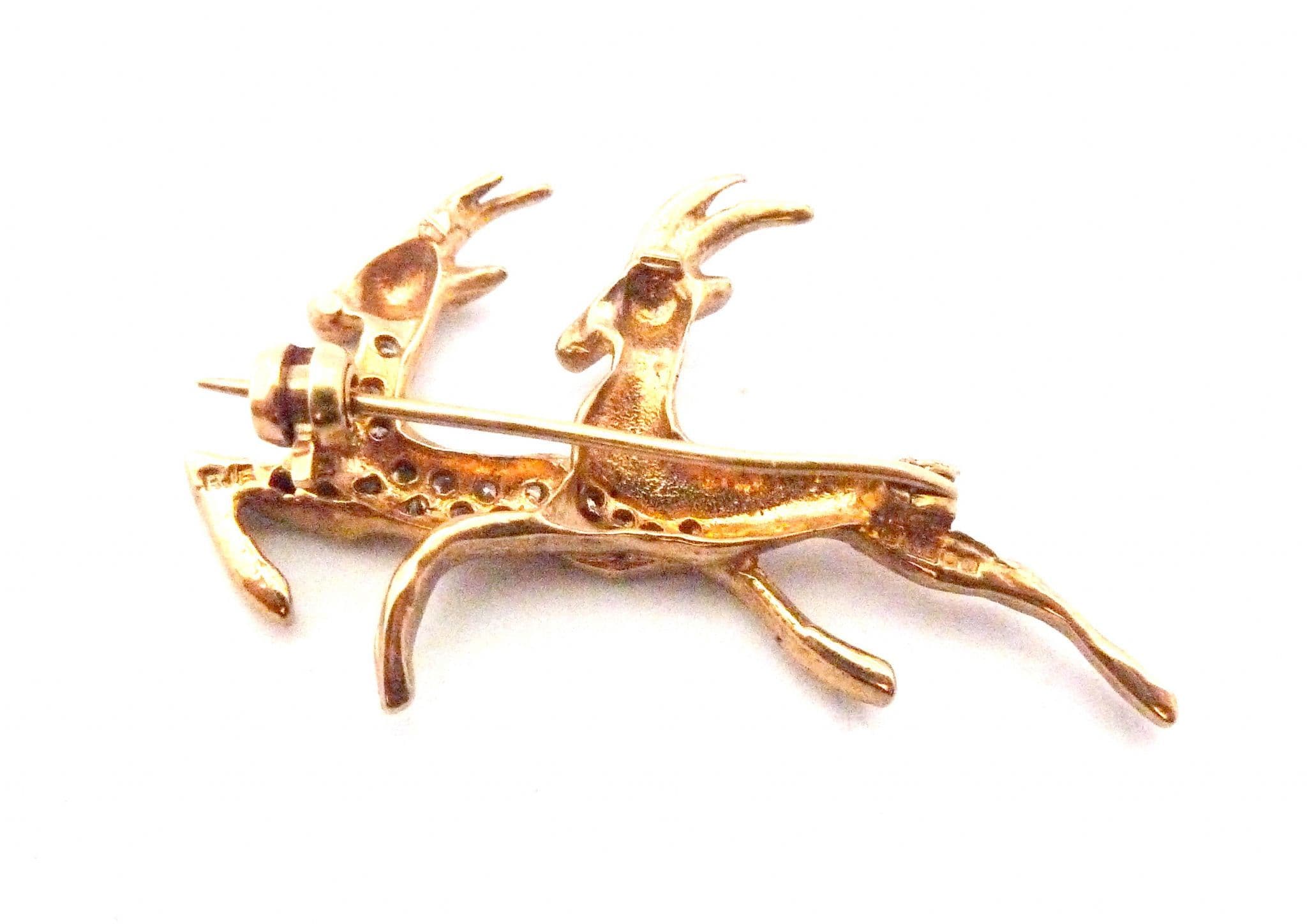 Vintage small and dainty 9ct gold fully hallmarked leaping double antelope design paste detailed brooch. The body of the brooch is formed from 9ct gold with a textured finish in the design of two leaping antelopes, one antelope is set with clear paste stones. The brooch is fastened with a roll over clasp. Fully hallmarked for 9ct gold, assayed in Birmingham 1987.