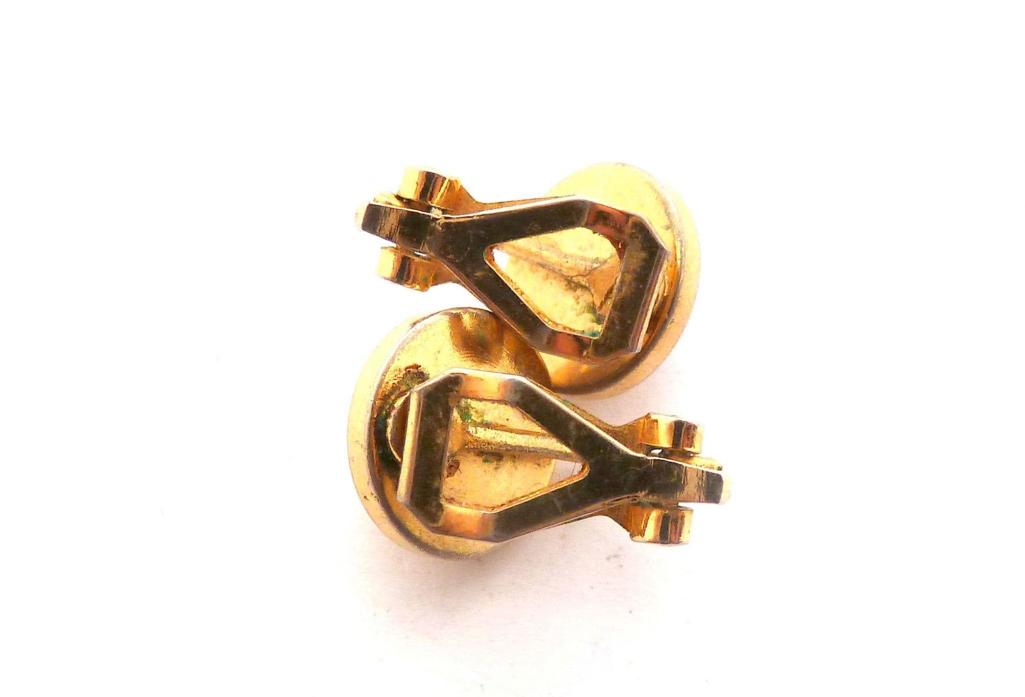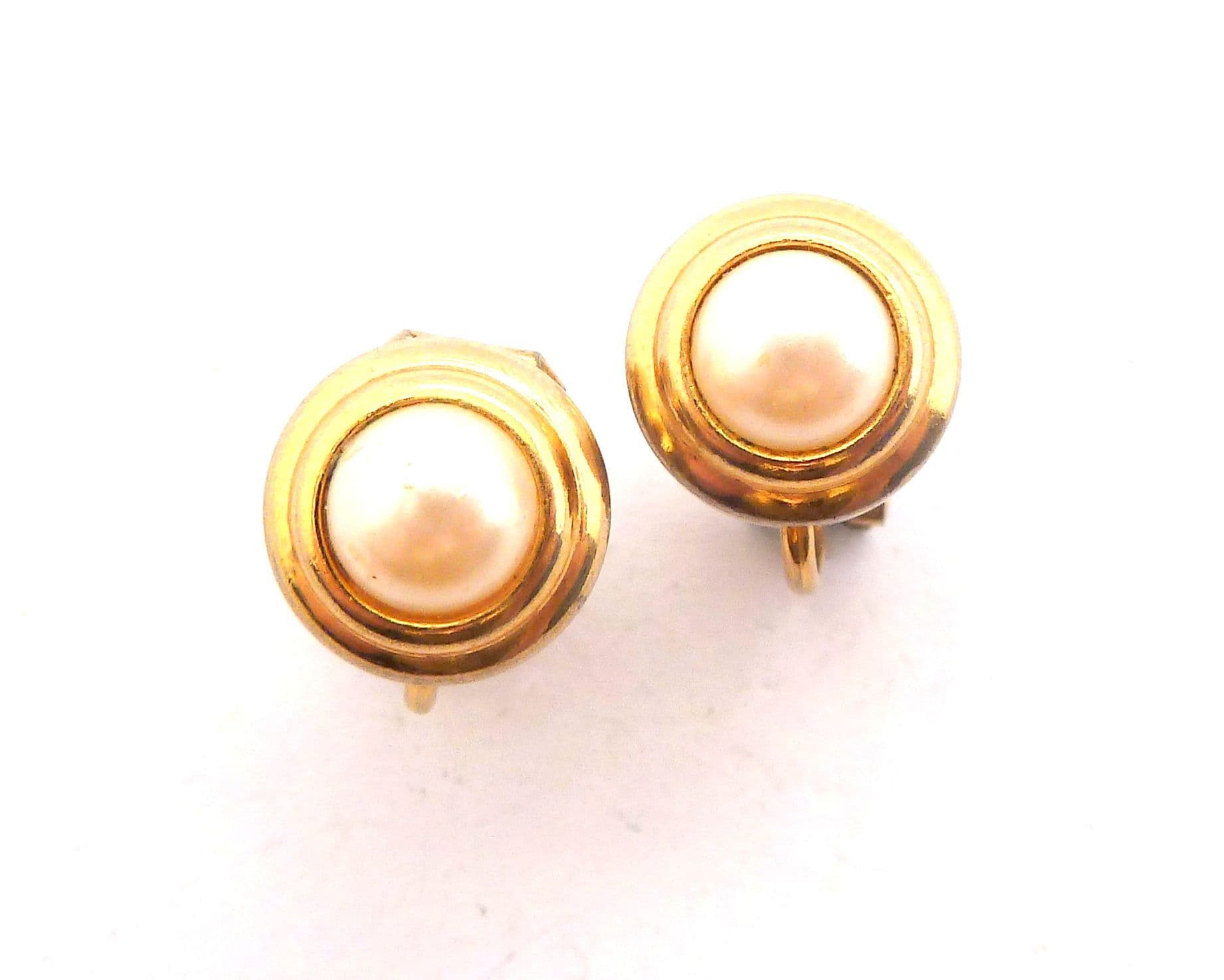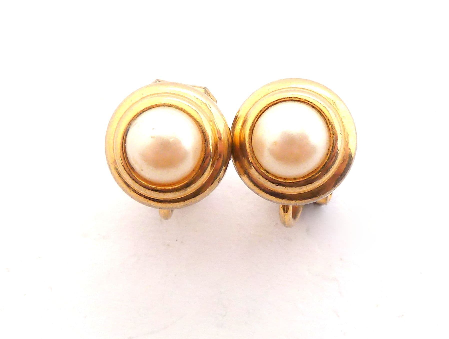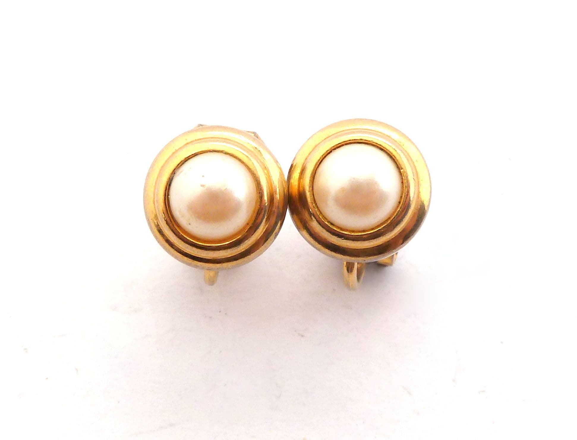Vintage small and dainty faux pearl set retro design clip on earrings . Formed from gold tone metal set a faux pearl in an retro design. Circa 1980's - 90's.
