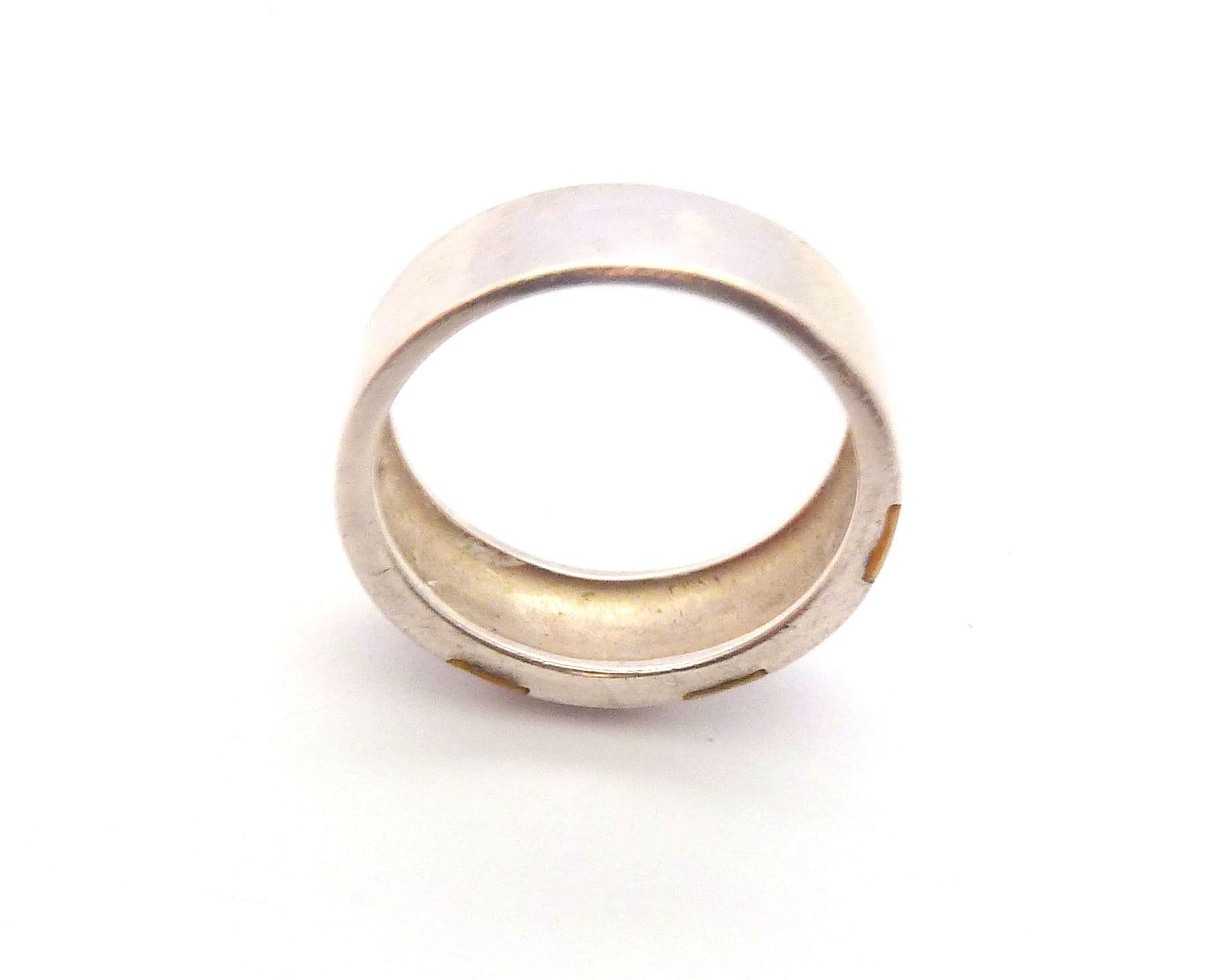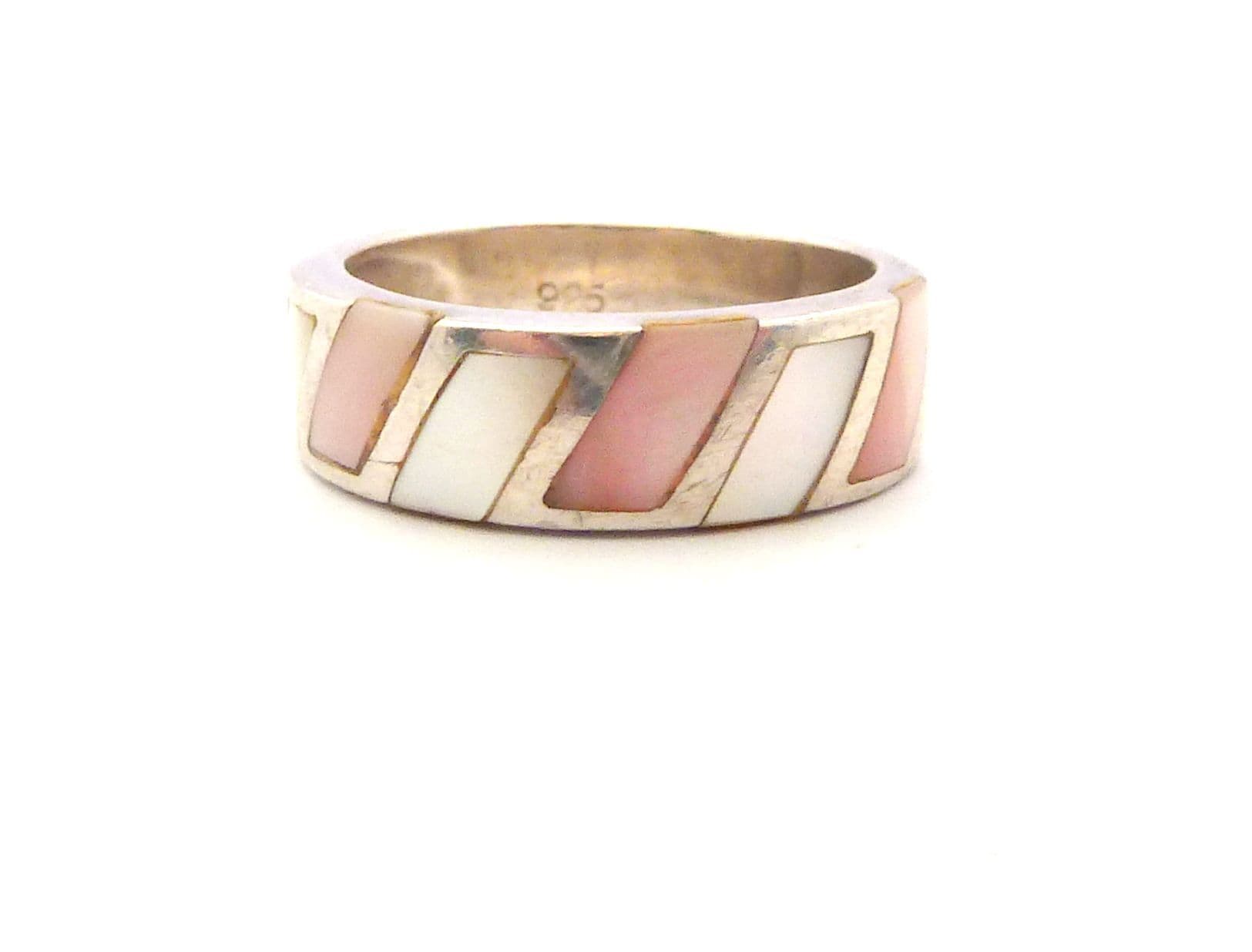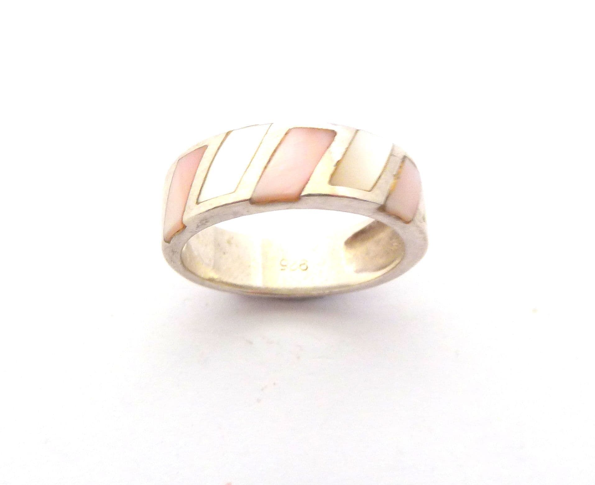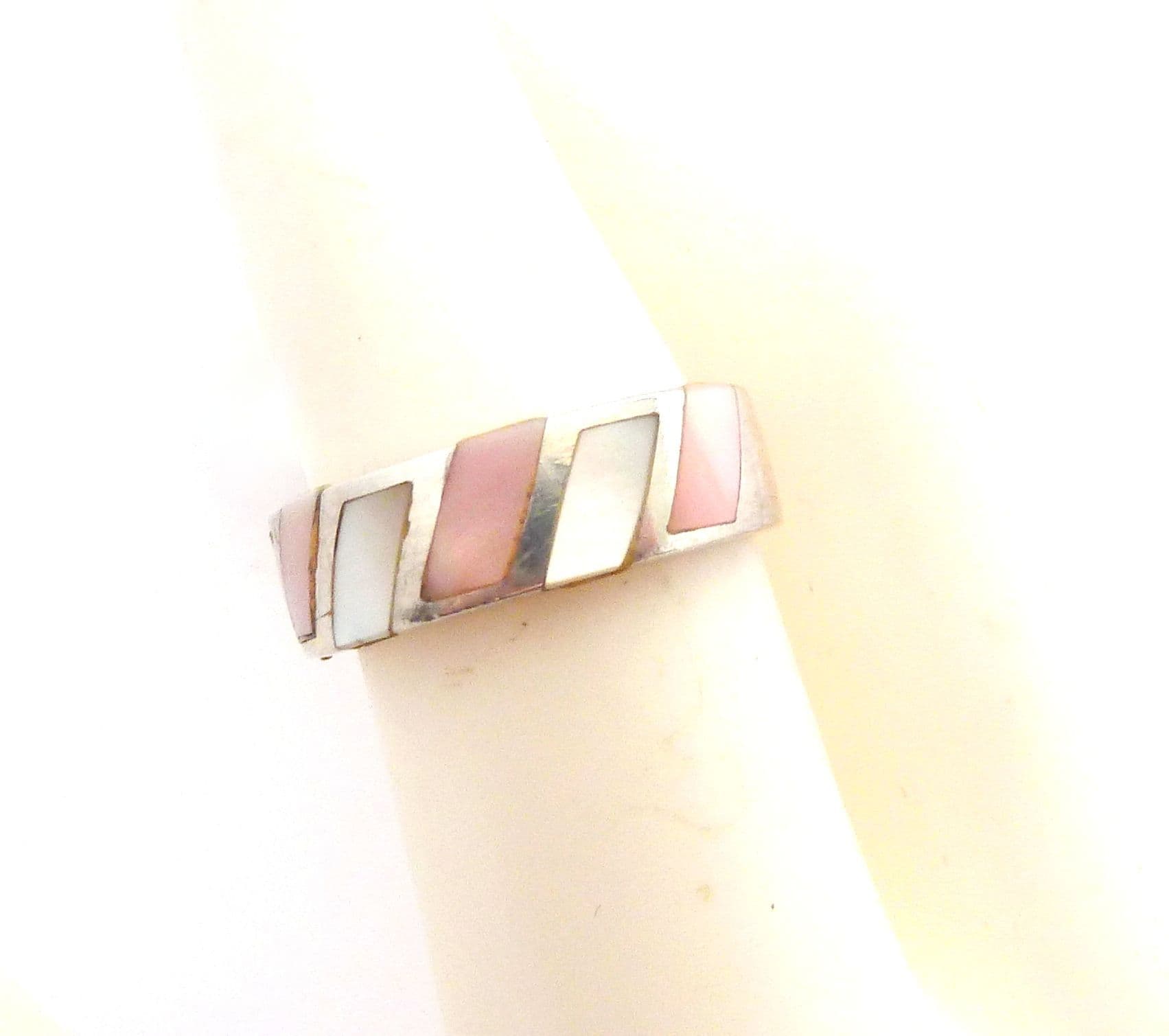 Vintage sterling silver and pastel tone mother of pearl retro design ring. Formed from sterling silver set with a pastel tone colour enhanced mother of pearl shell slices to the front of the ring the back is a plain polished silver. Suitable for UK size N , USA size 6 3/4. Stamped 925 for sterling silver to the inside of the band