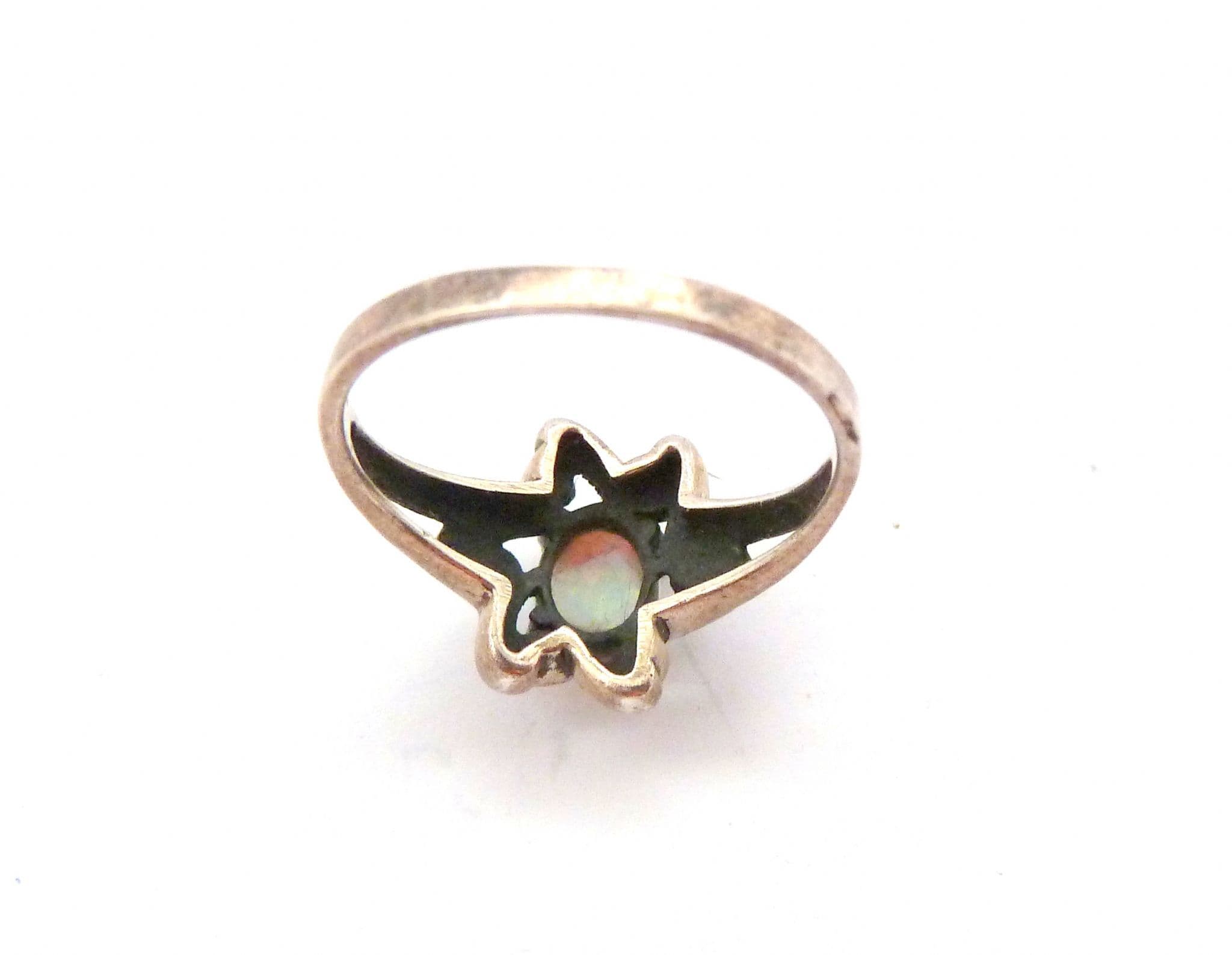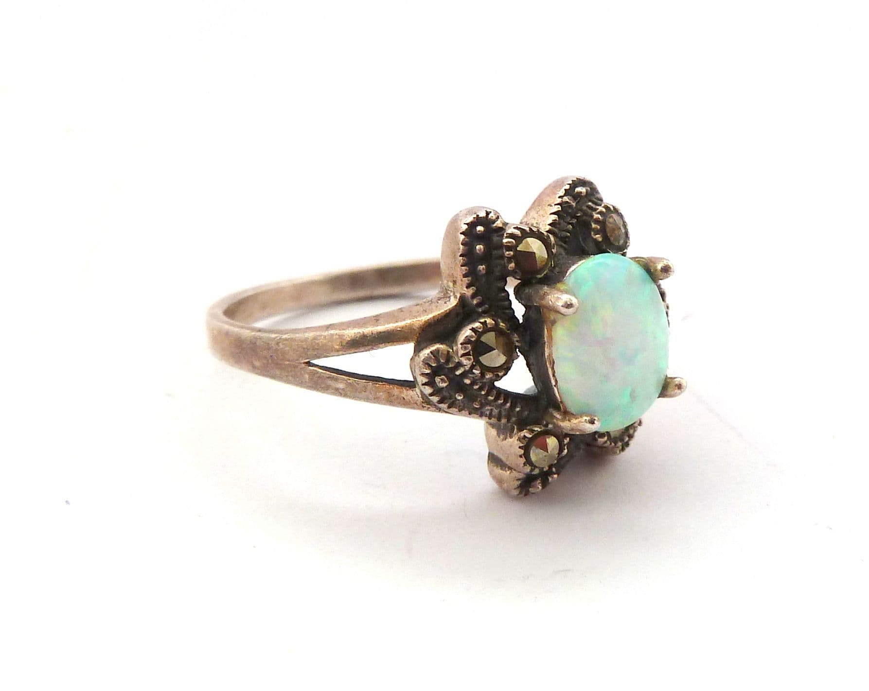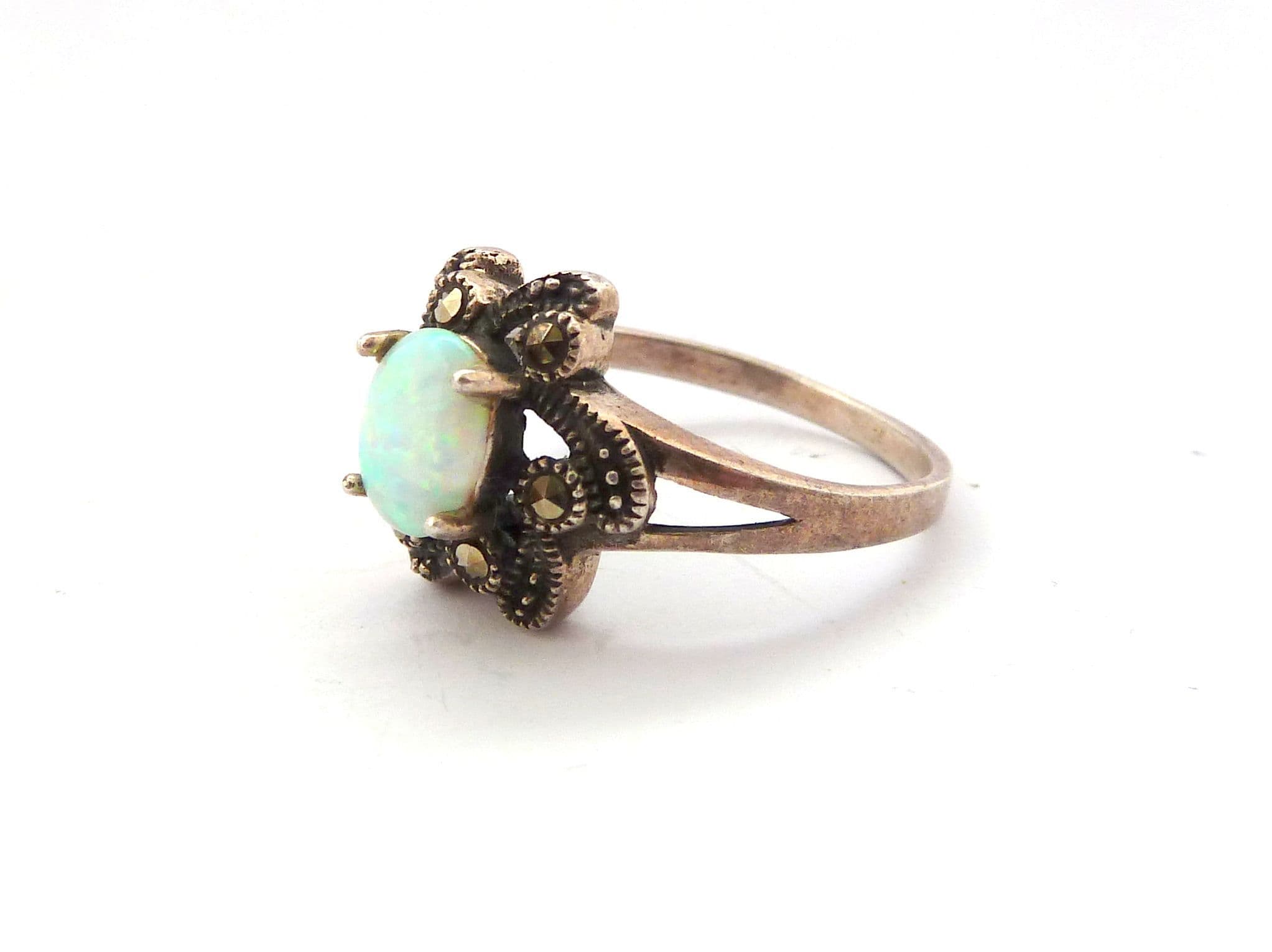 A vintage sterling silver, marcasite and opal set floral design ring. The ring is stamped 925 for sterling silver to the inside of the band. It is a UK Size N, US size 6 3/4