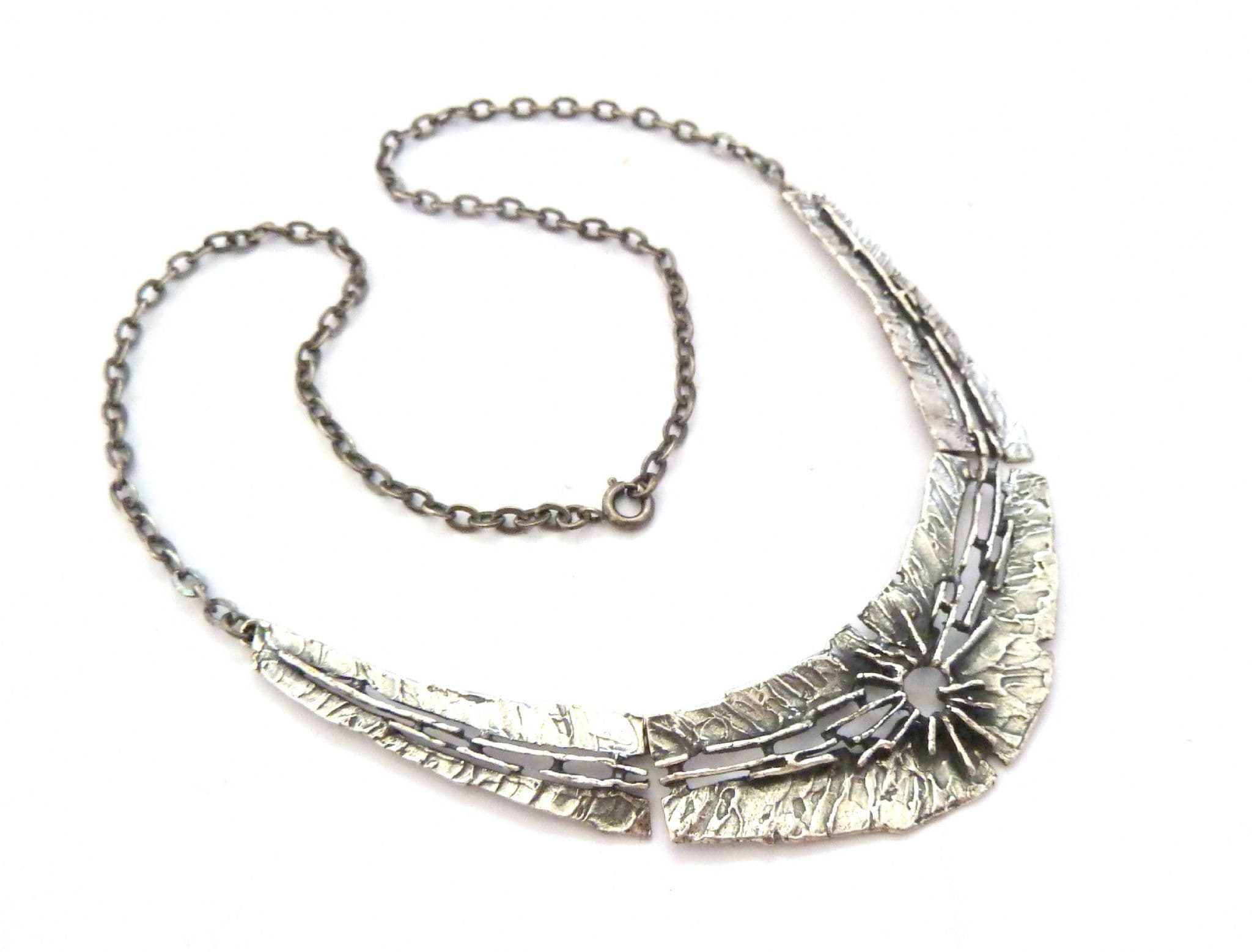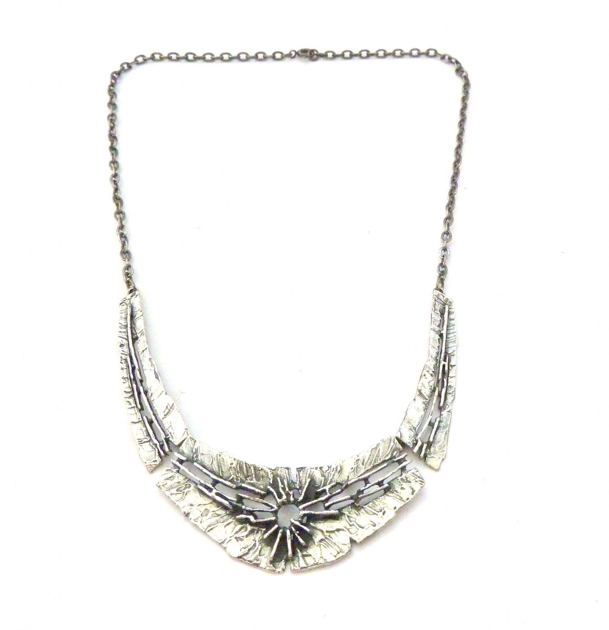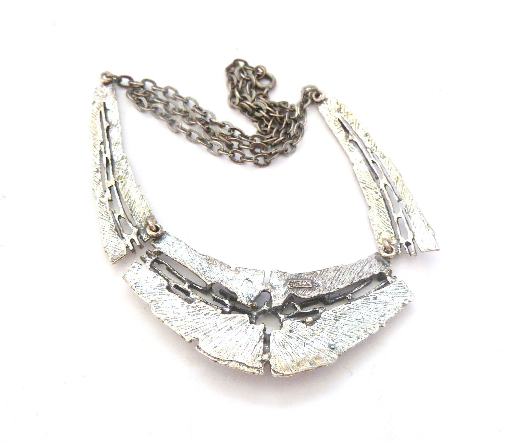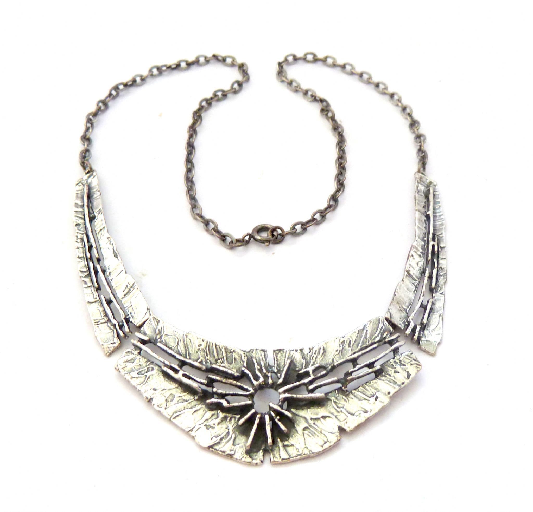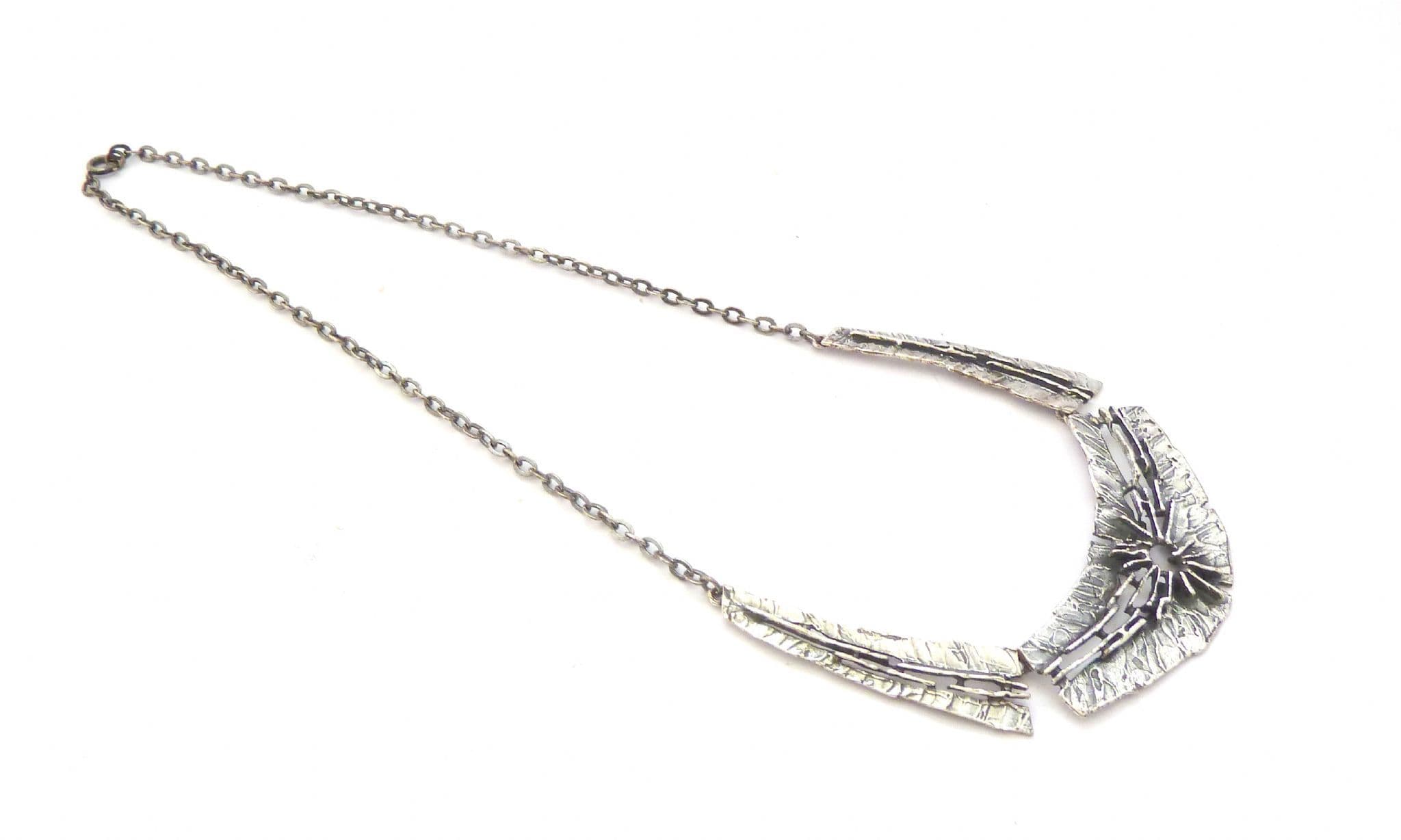 A sterling silver Teka Theodor Klotz brutalist style panel design necklace . Formed from sterling silver with three brutalist kinetic design central panels. The panels are set on a sterling cable chain. The necklace is stamped with the Teka cartouche and 925 to the back of the front panel.