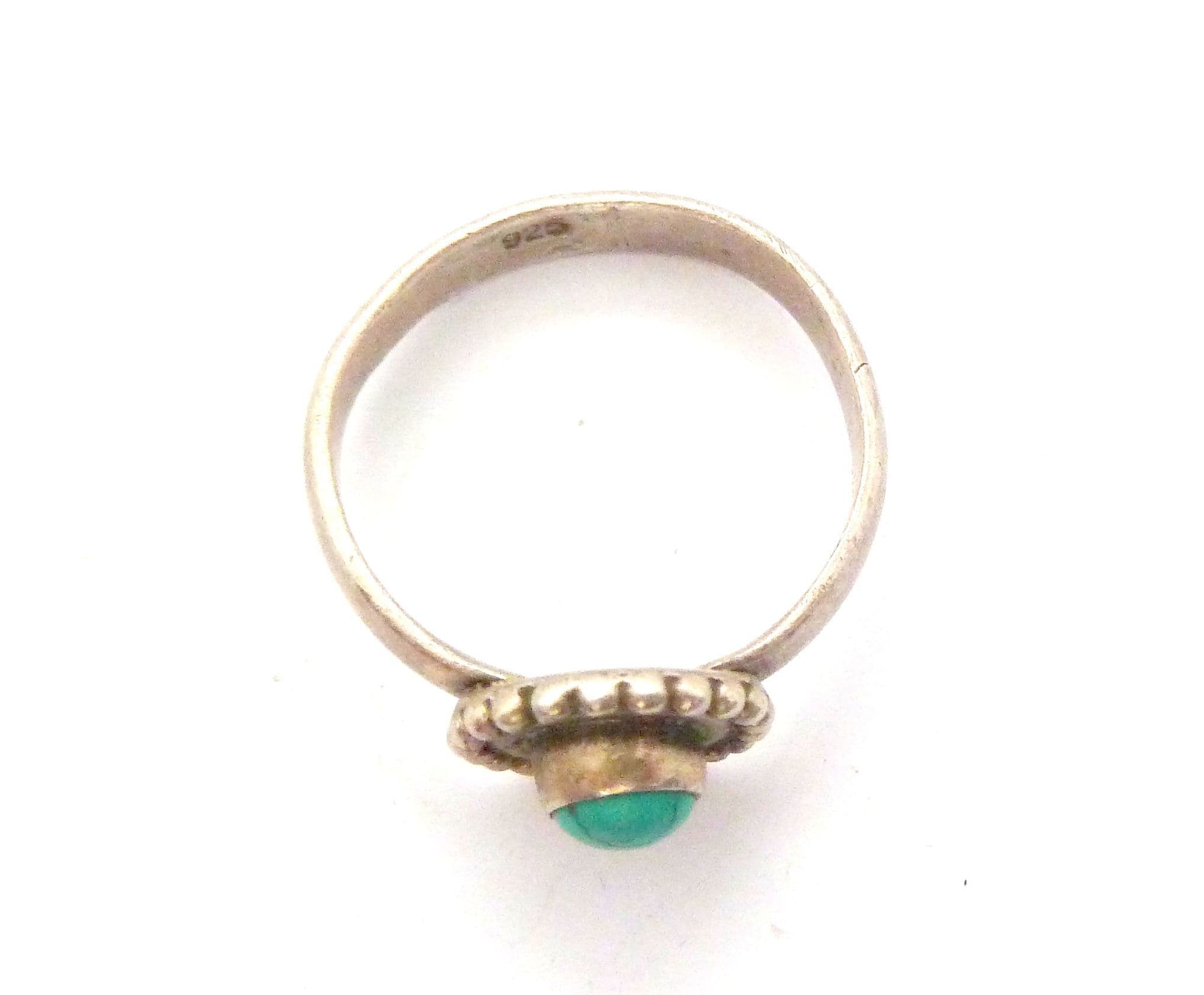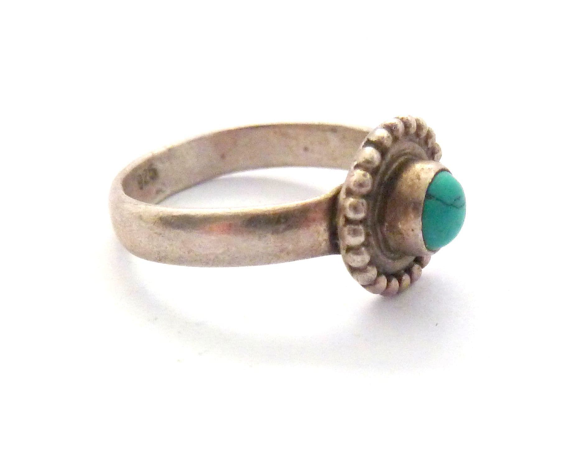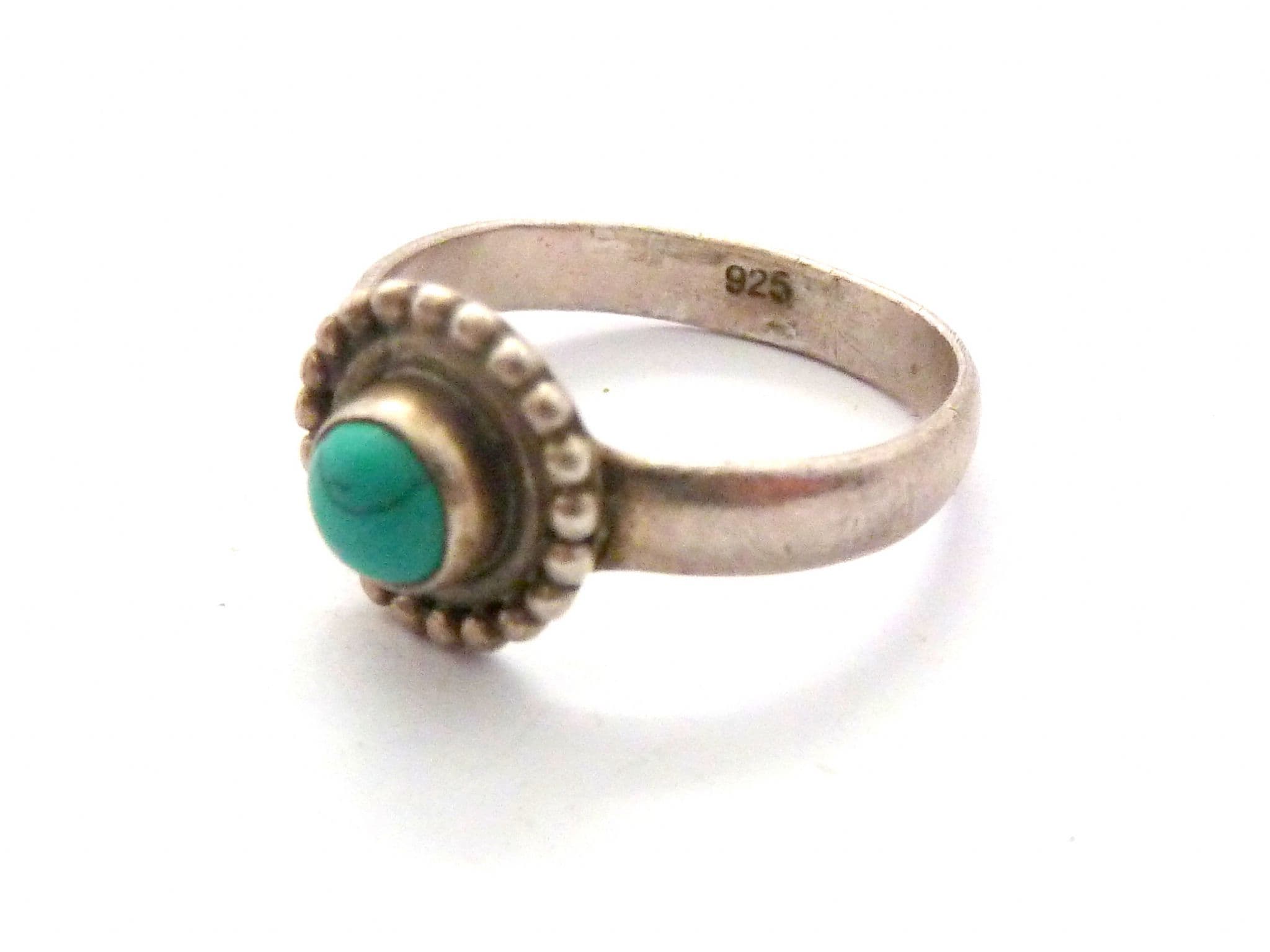 A turquoise gemstone set boho style sterling silver ring The ring is stamped 925 to the inside of the band . The central design is small and discrete. It is suitable for a UK size R, US size 8 3/4.
